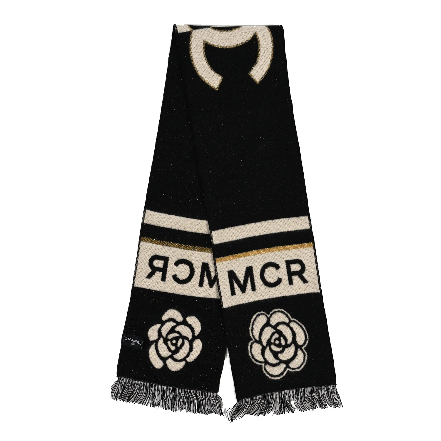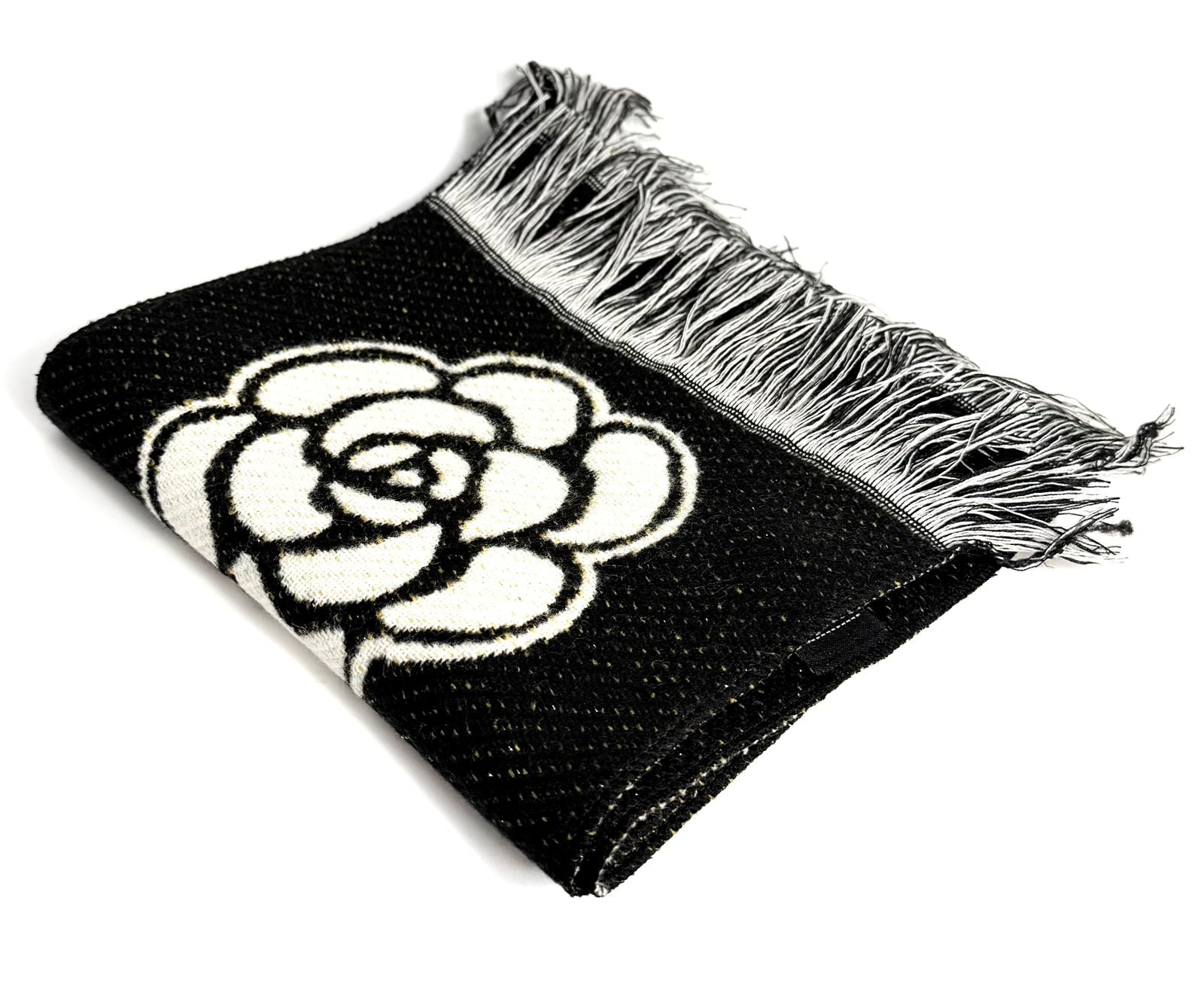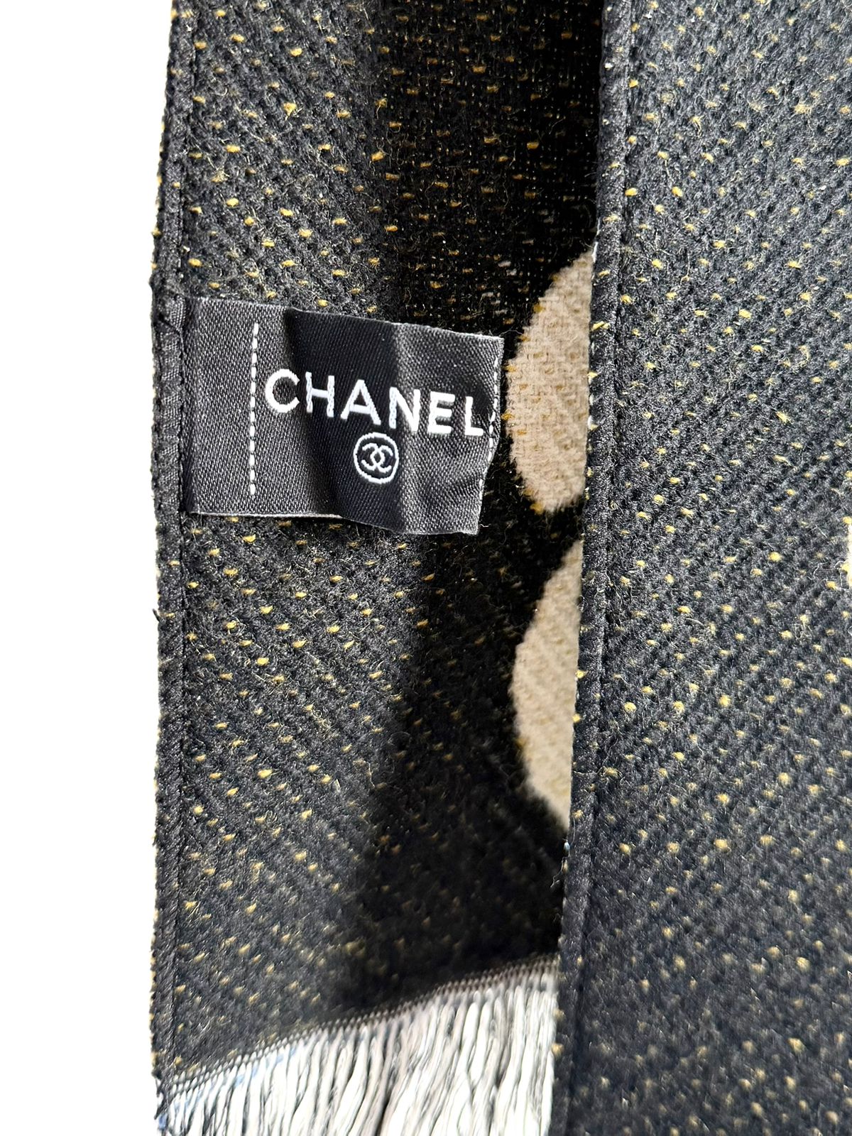 A Timeless cold-weather essential, this Chanel scarf is crafted from a luxurious cashmere and wool blend, offering exceptional softness and warmth. Featuring the iconic camellia motif and bold CHANEL lettering, it is finished with classic fringe edges—delivering a sophisticated yet effortless statement piece.