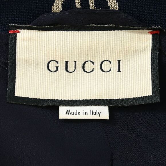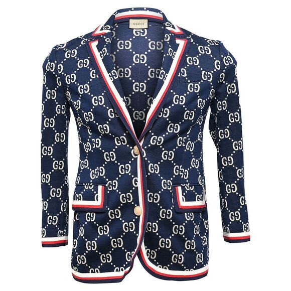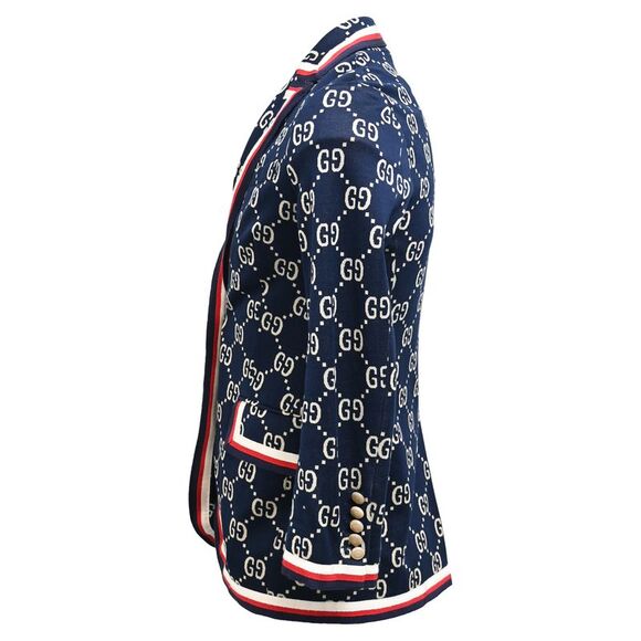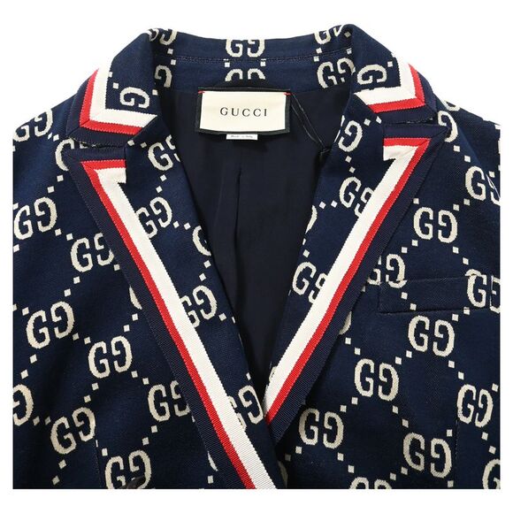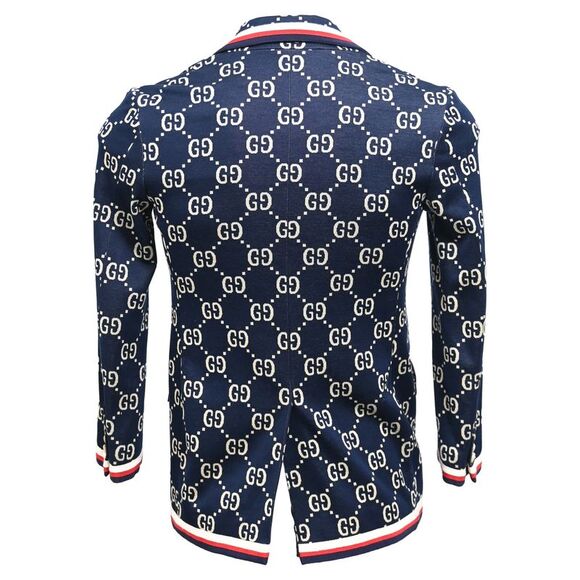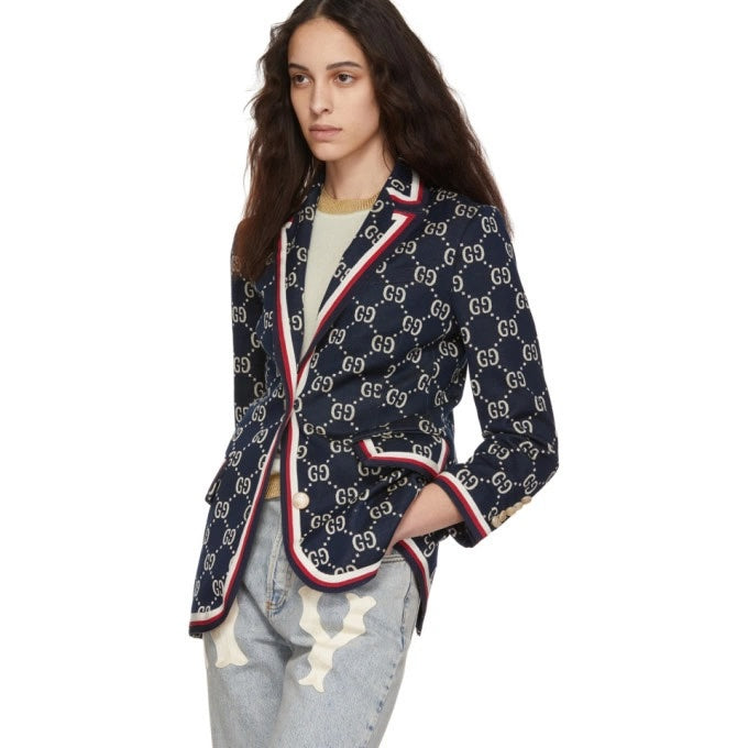 Tailored to perfection, this Gucci GG Supreme Jacquard Blazer combines the House’s classic craftsmanship with its signature monogram sophistication. Rendered in a Navy blue and ivory GG jacquard cotton-viscose blend, the blazer features a notched lapel collar, long sleeves, and red-and-ivory grosgrain striped trim that accentuates its refined silhouette.