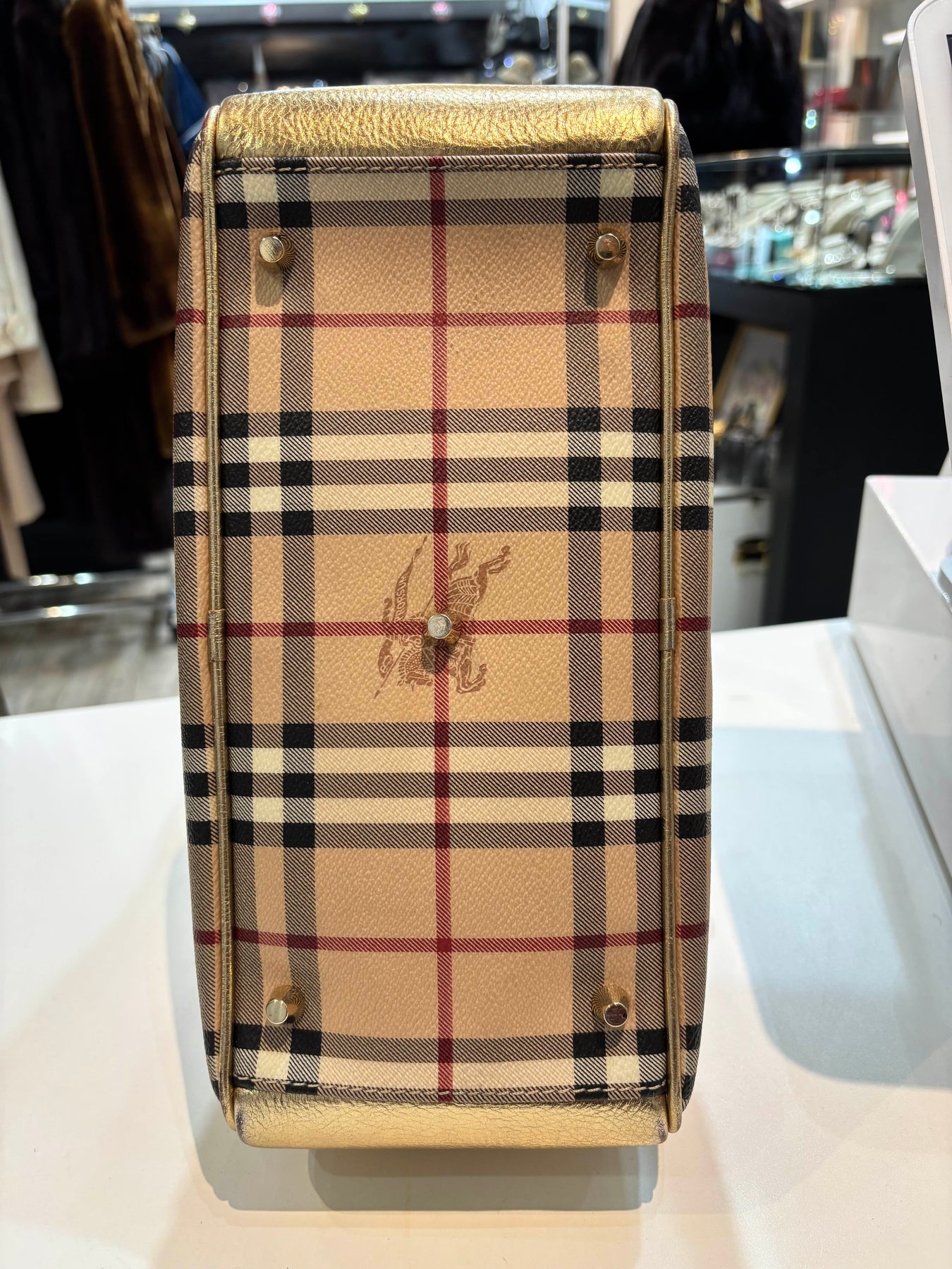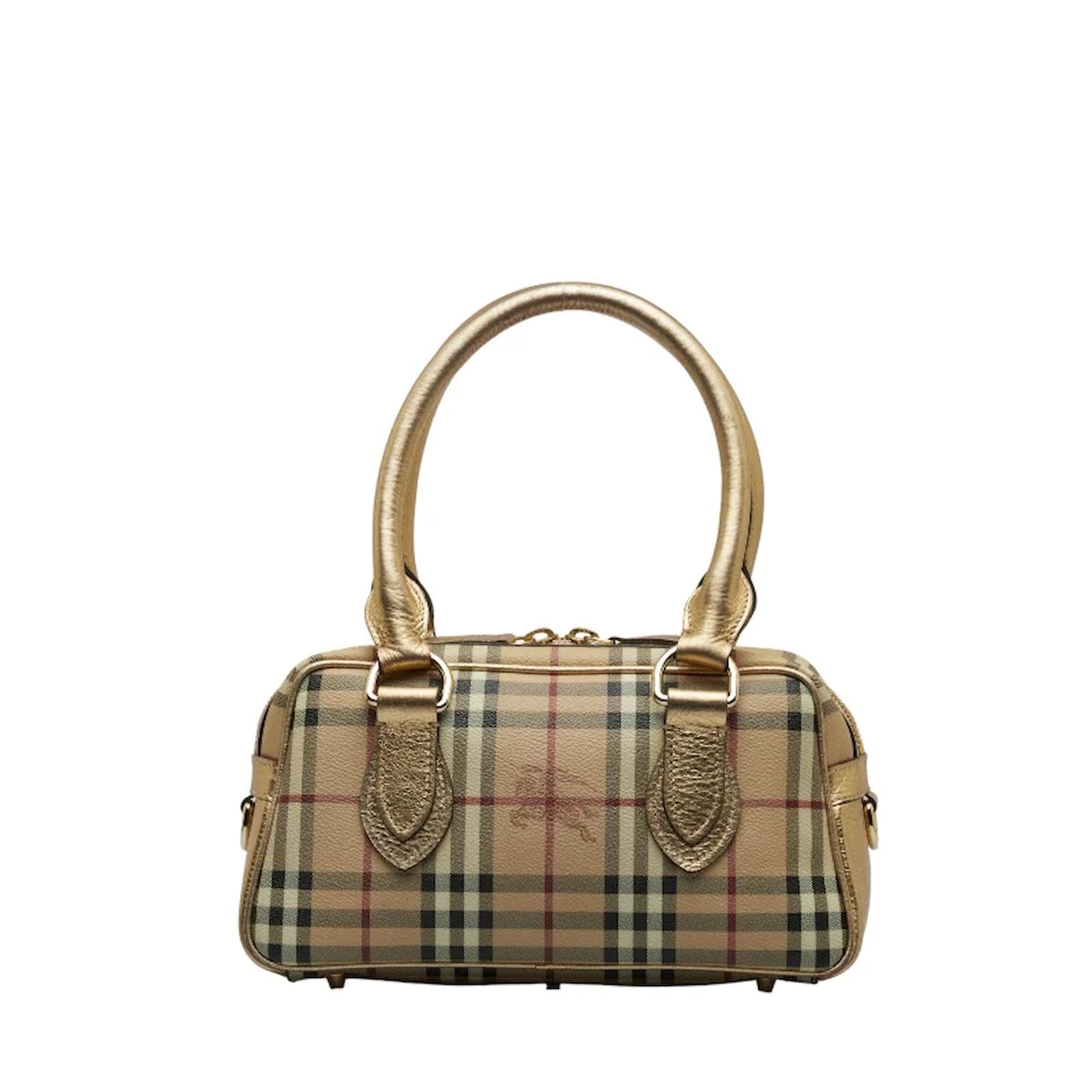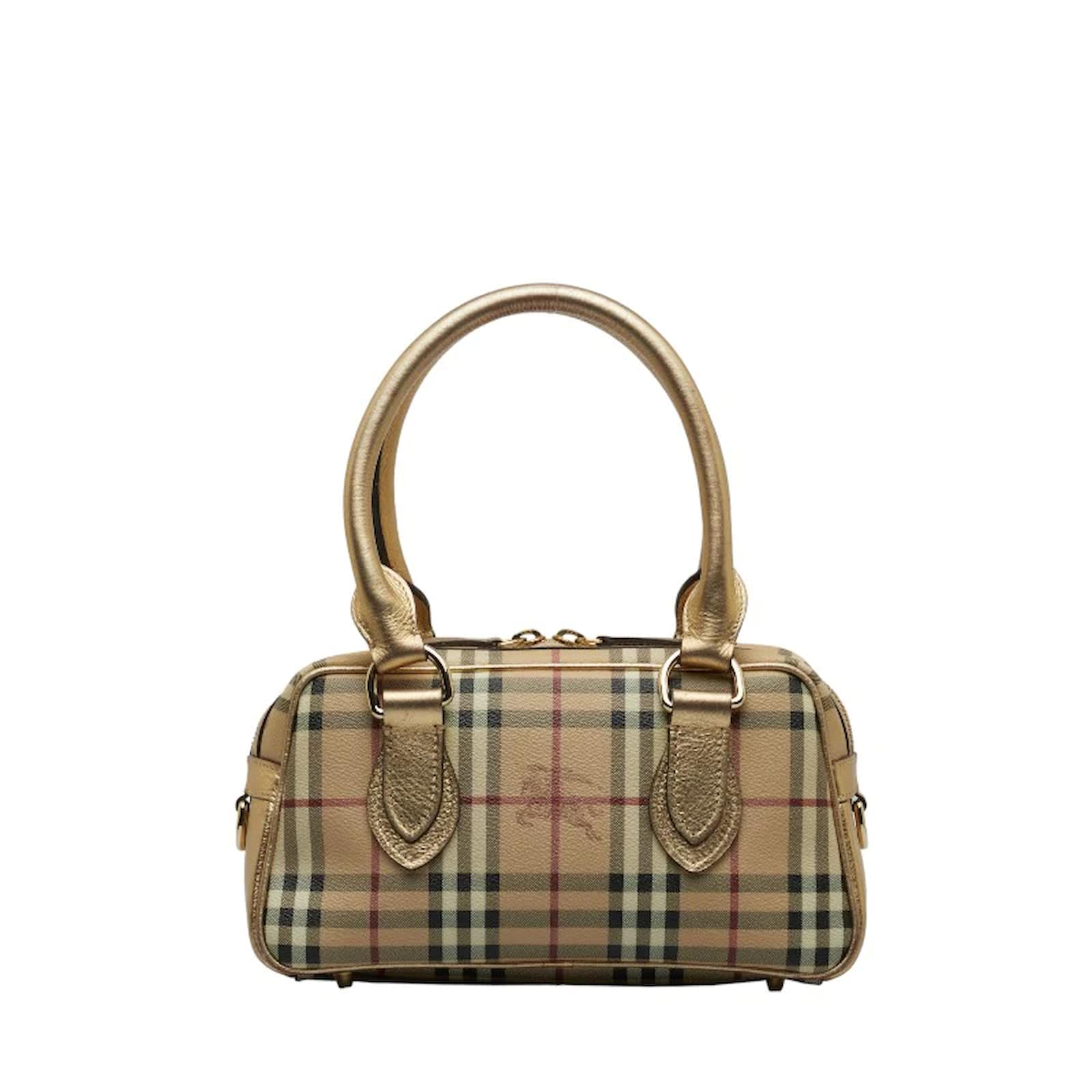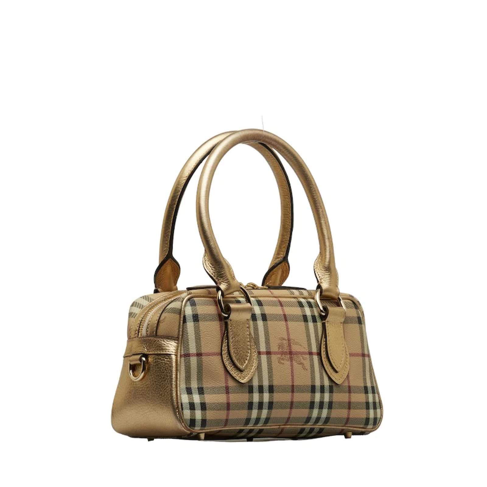 Elegant and enduring, the Burberry Gold & Beige Haymarket Check PVC and Patent Leather Bowler Bag is an iconic wardrobe staple—perfect for stylish, everyday sophistication.