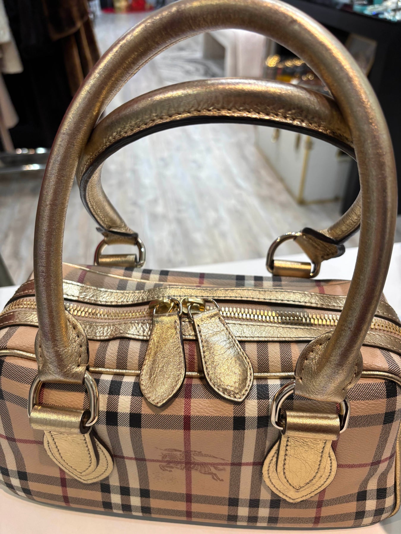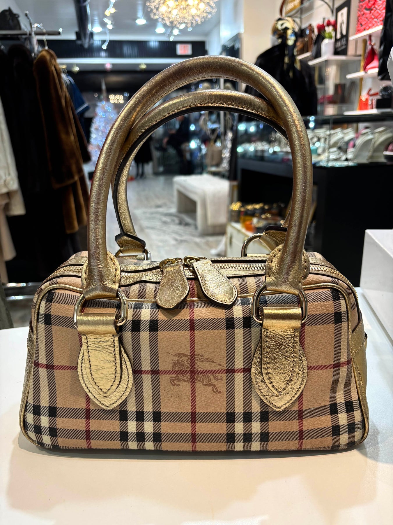 BURBERRY GOLD & BEIGE HAYMARKET CHECK PVC AND PATENT LEATHER BOWLER BAG