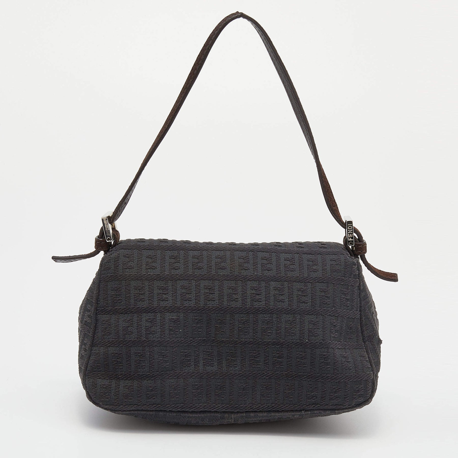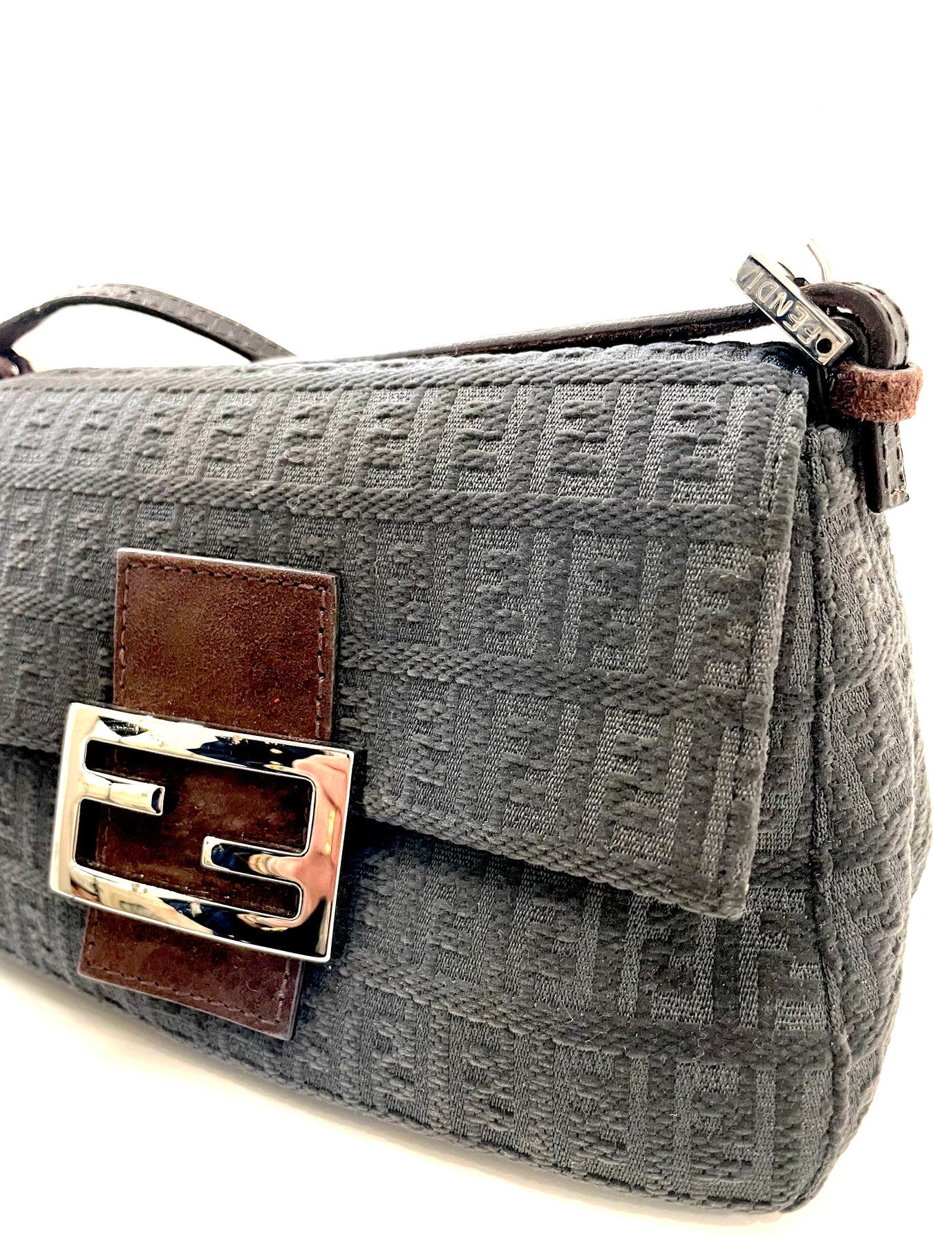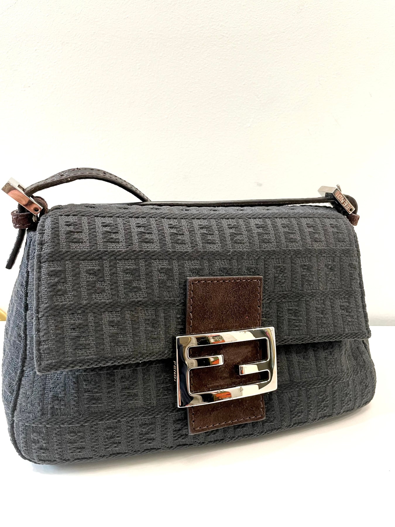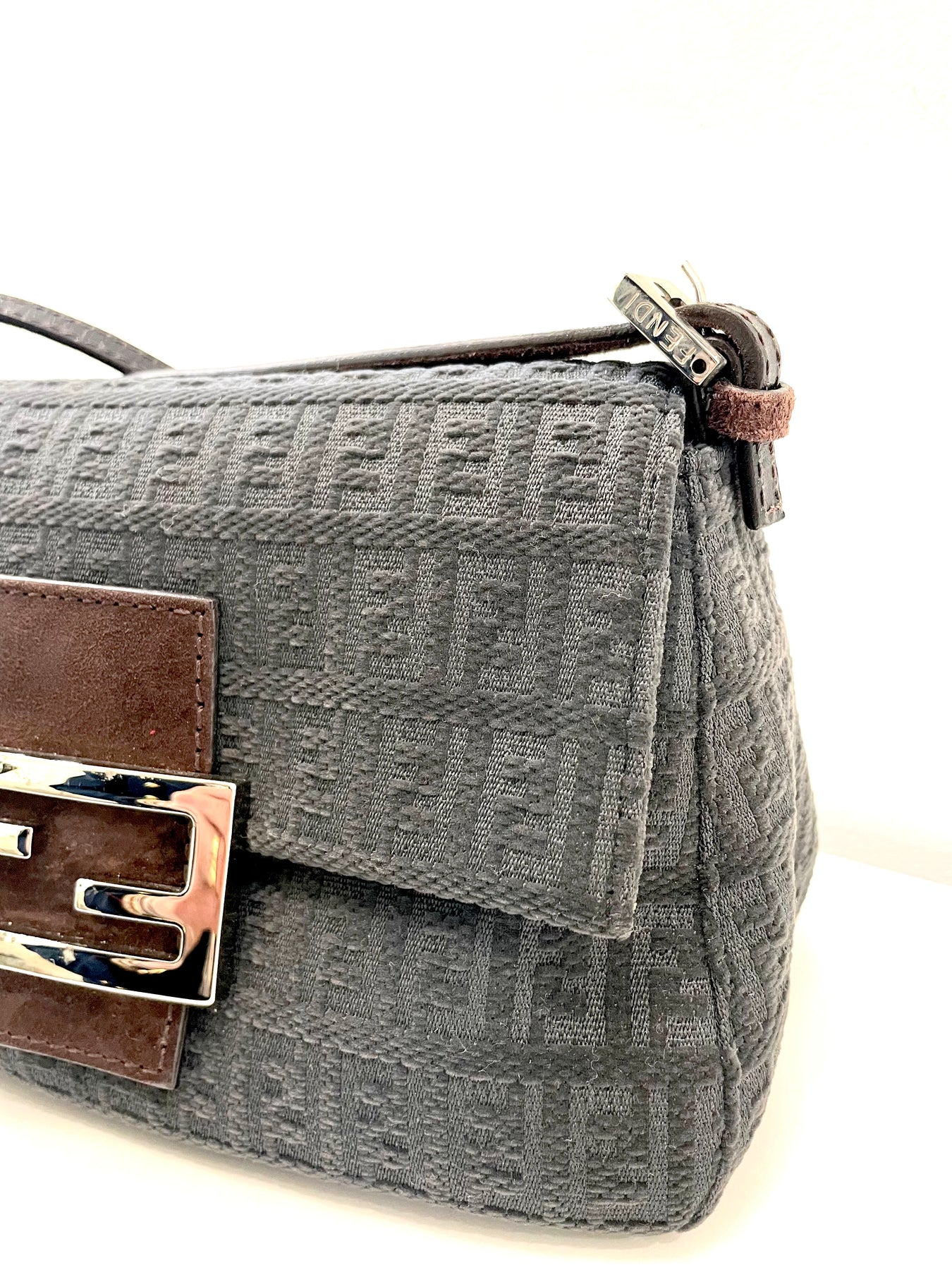 Make a Chic Statement with This Fendi FF Zucchino Vintage Mini Baguette Shoulder Bag, an iconic design that embodies the brand’s timeless Italian elegance. Expertly crafted from Dark grey and brown Zucchino monogram canvas with suede accents, the bag features silver-tone hardware and a single adjustable handle for versatile wear.
