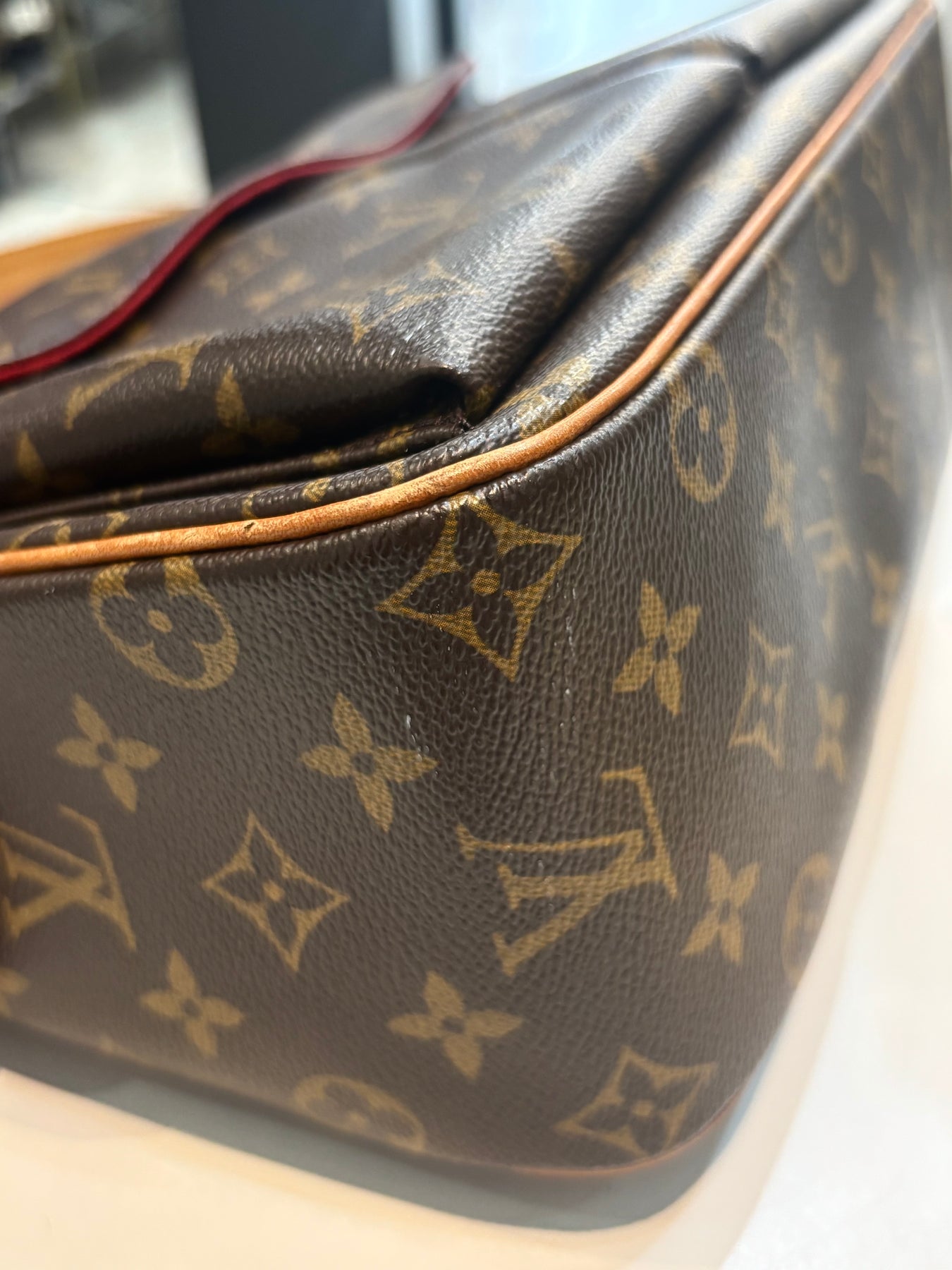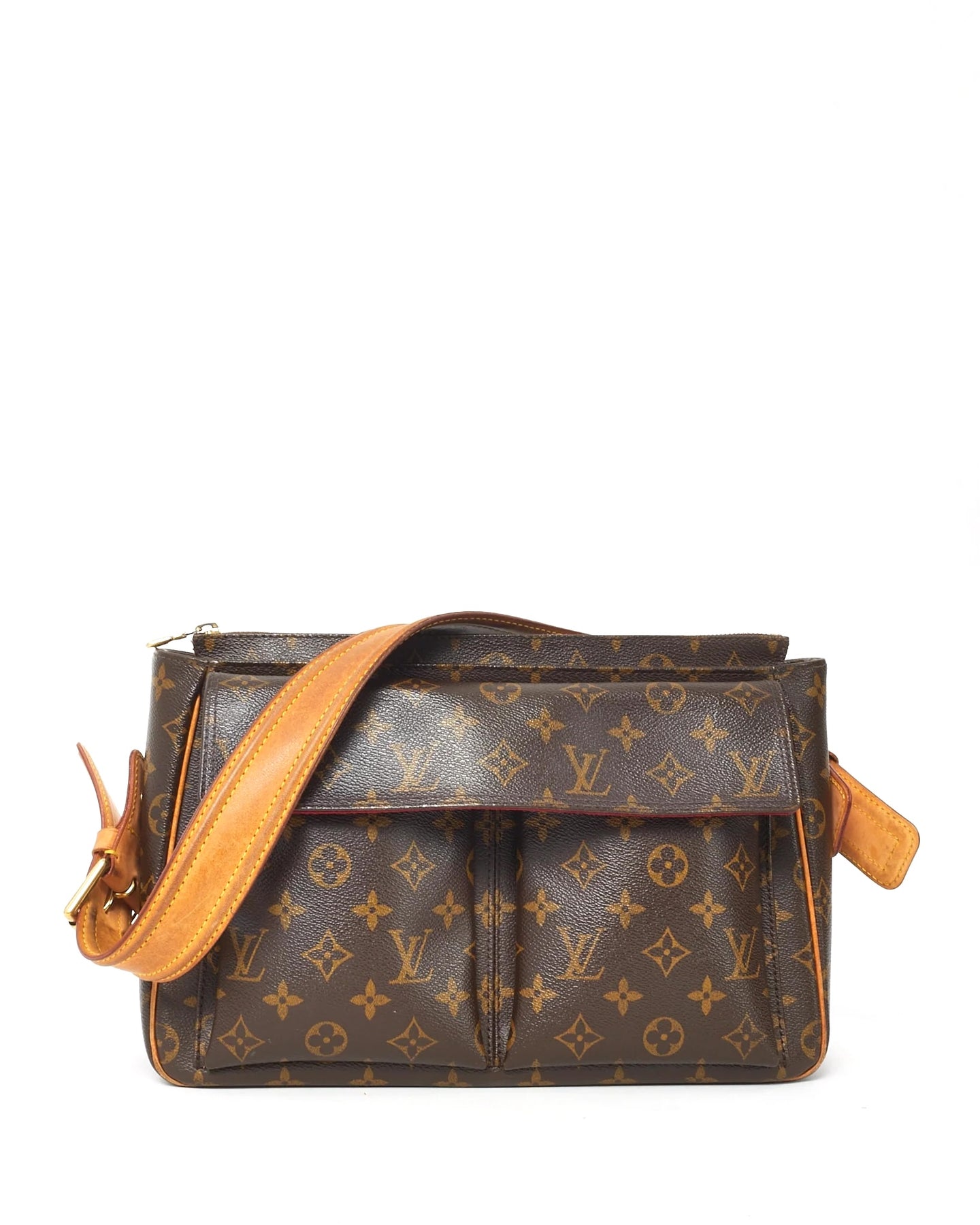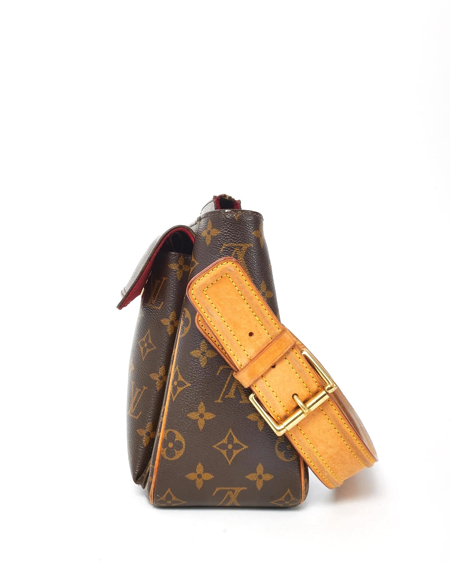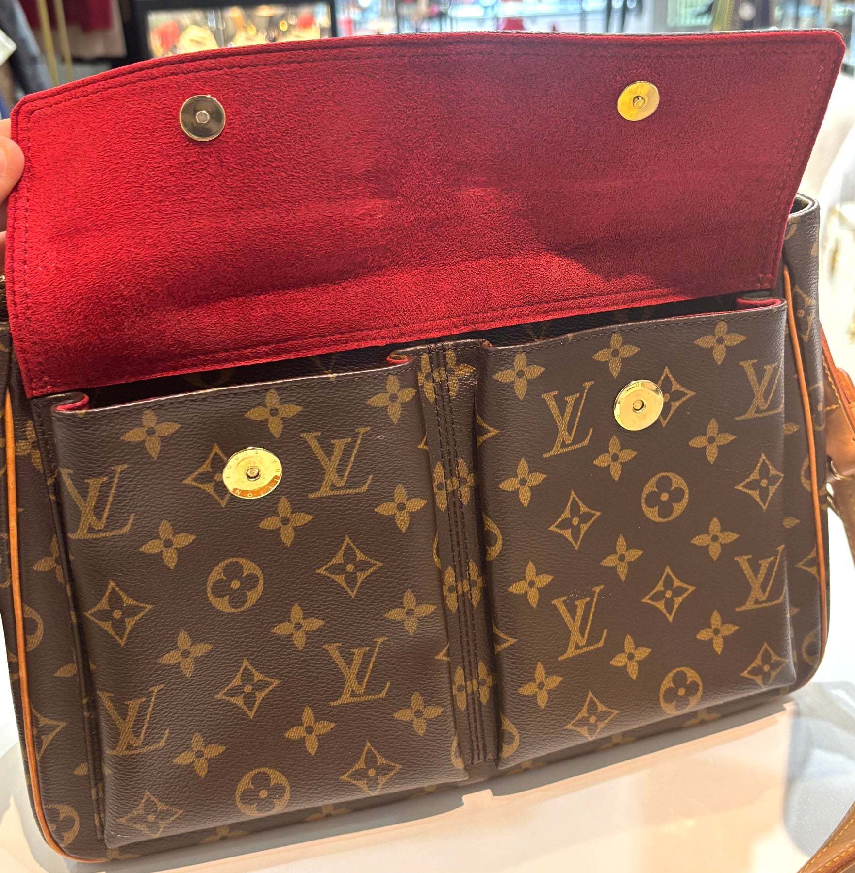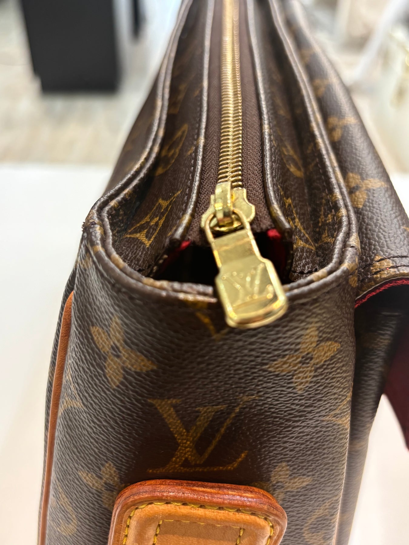 A refined expression of everyday luxury, the Louis Vuitton Monogram Viva Cité GM Shoulder Bag combines iconic design with practical elegance. Crafted in the larger size of this coveted style, the bag is rendered in classic Monogram coated canvas and accented with natural vachetta leather trim. The structured silhouette features two exterior front pockets beneath a sleek flap, while a secure top zip opens to a vibrant raspberry-red Alcantara microfiber interior. Designed for comfortable shoulder wear, this timeless piece offers both style and functionality for daily use.