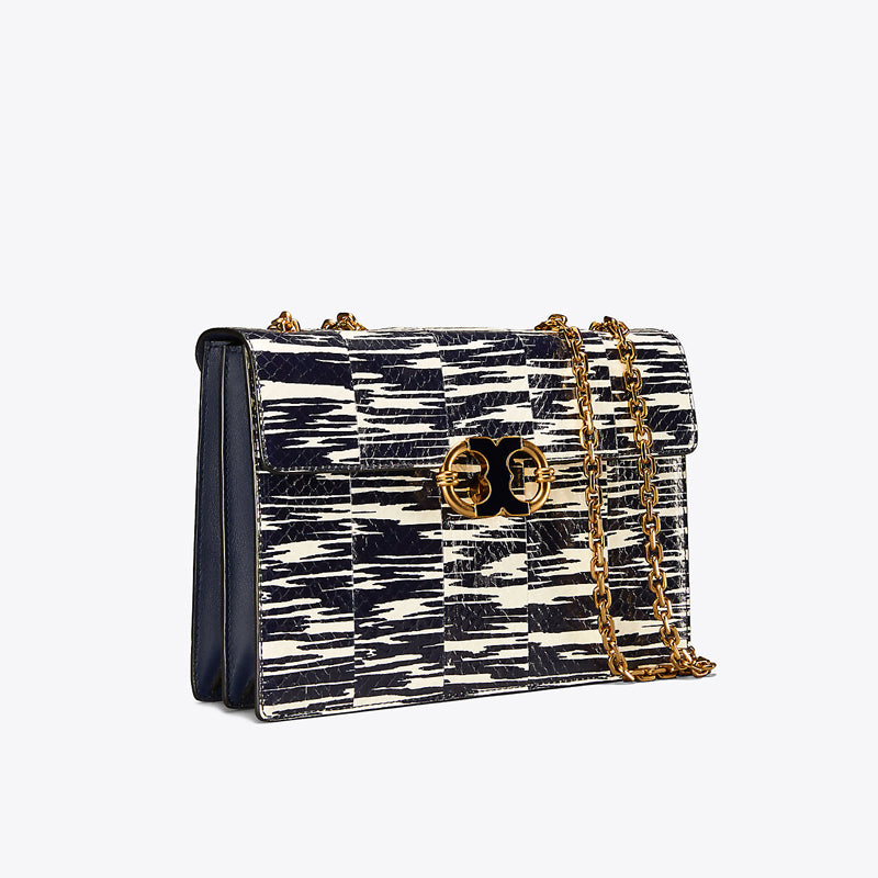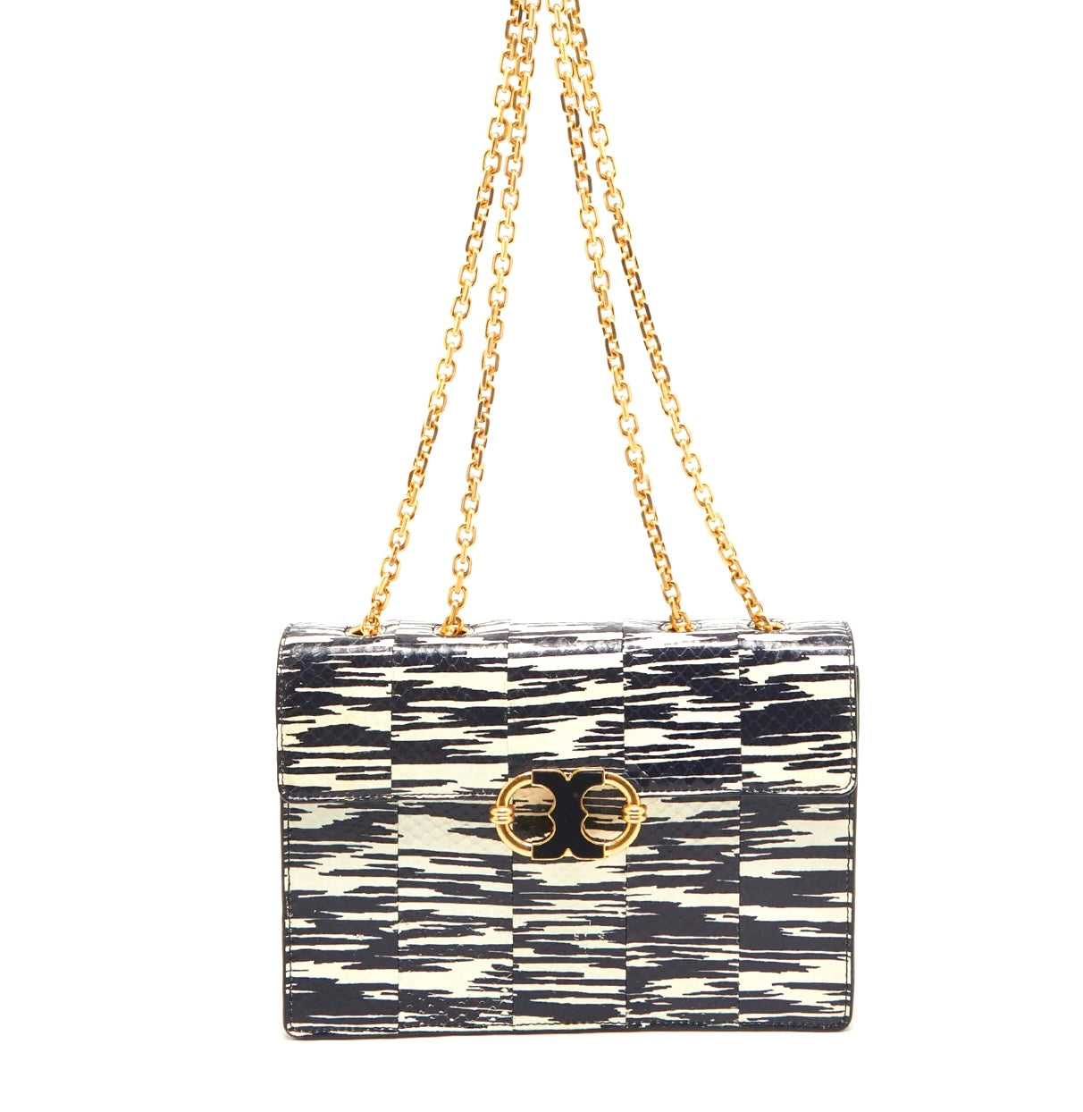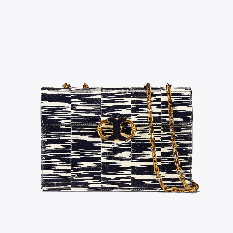 Chic, structured, and striking — the Tory Burch Gemini Link Snake Bag blends signature design with bold texture. Crafted in snake-embossed leather, this sophisticated shoulder bag features the brand’s iconic double-link hardware, symbolizing duality and strength, while adding a touch of graphic edge.