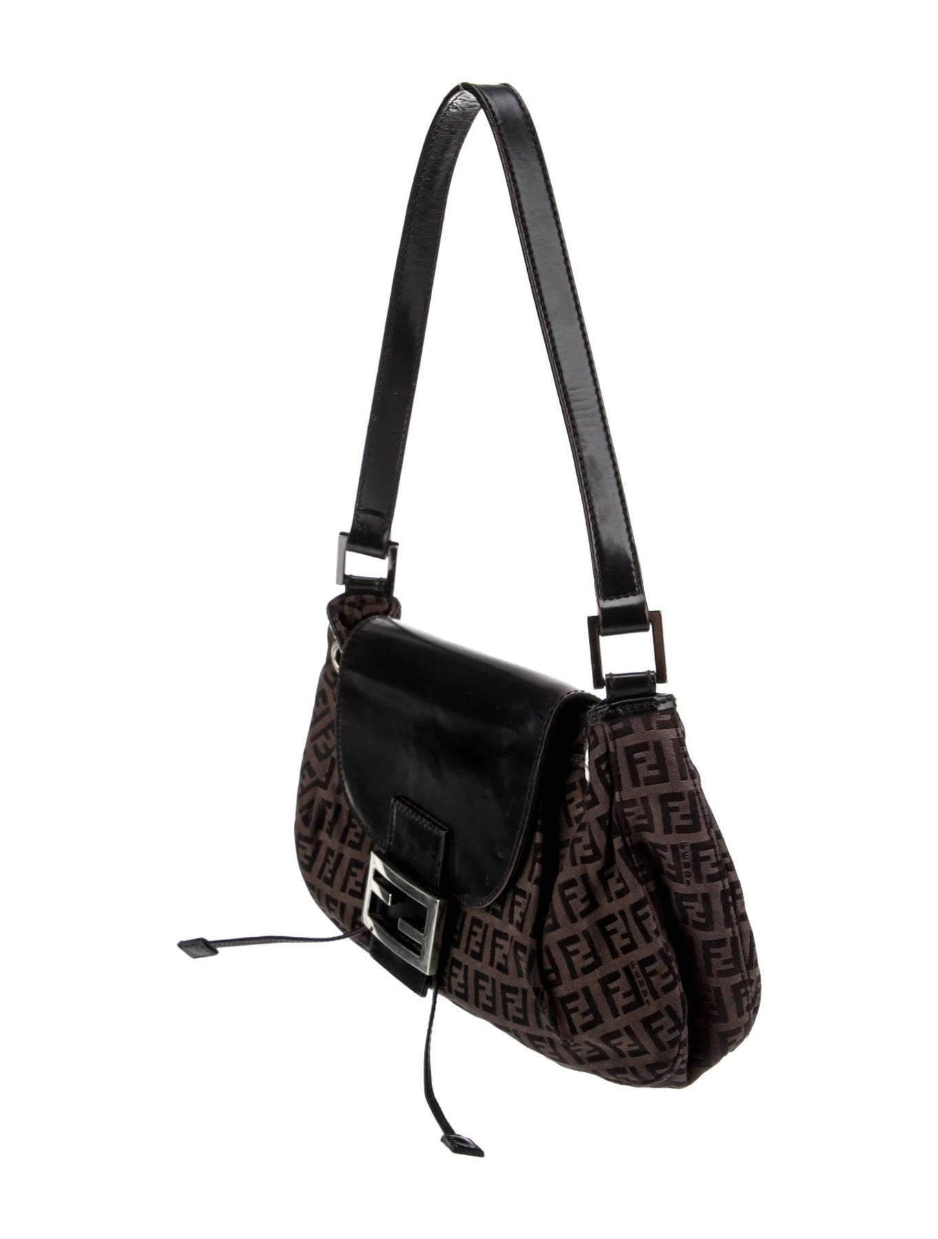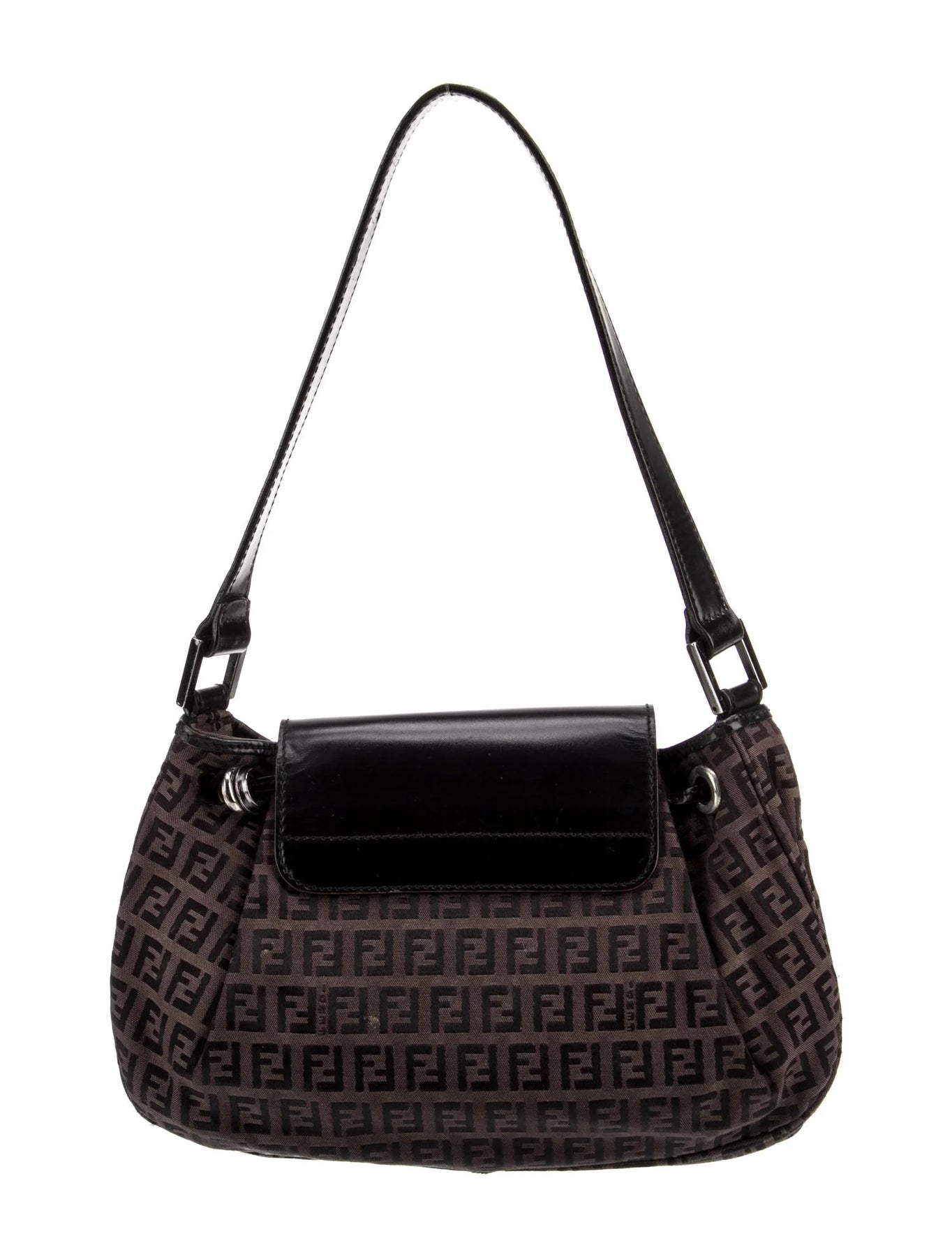 Rediscover a timeless icon: this Fendi shoulder bag features the brand’s signature Zucca “FF” canvas motif—a hallmark of Fendi design since the 1960s/70s—rendered in rich brown tones and contrasted with leather trim and metal hardware. The structured yet supple silhouette offers classic shoulder‑carry ease, while the vintage fabric and detailing add character and heritage charm.