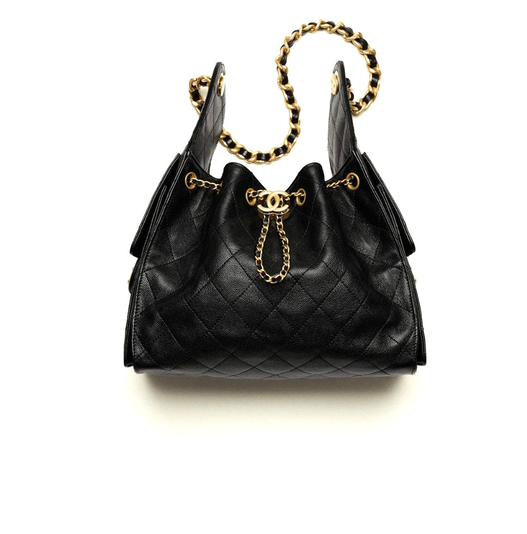 A Modern Reinterpretation of Timeless Chanel Elegance, the Small 25 Hobo Bag is Crafted from Grained Caviar Calfskin leather in classic black with Antique Gold-tone hardware. The signature diamond quilting, drawstring top with CC logo button, and interwoven leather-and-chain shoulder strap embody the brand’s sophisticated craftsmanship.