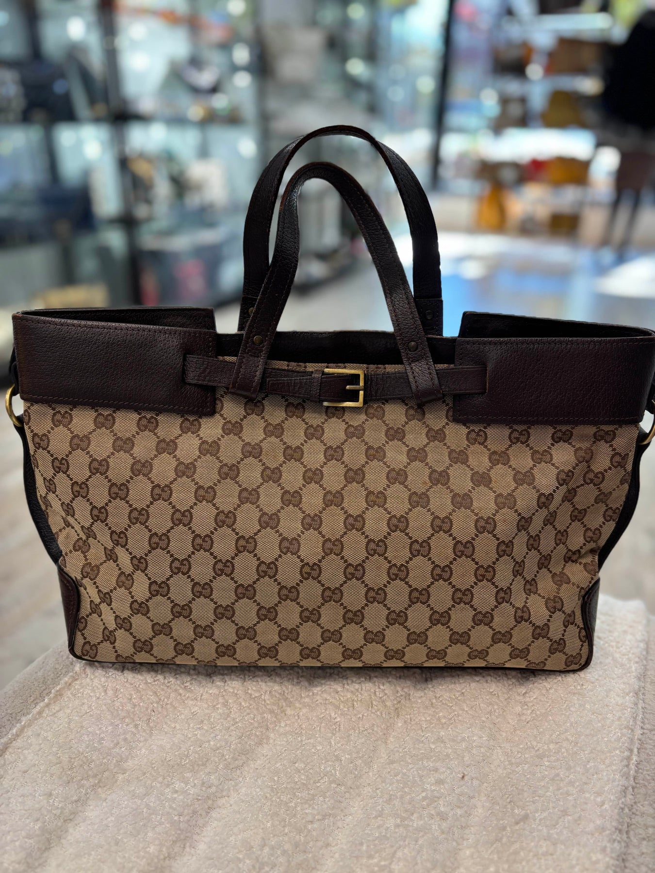 The structured silhouette features comfortable leather shoulder straps and a roomy interior, perfect for carrying your daily essentials in style. Finished with subtle Gucci branding and gold-tone hardware, this tote embodies understated luxury with a retro edge.