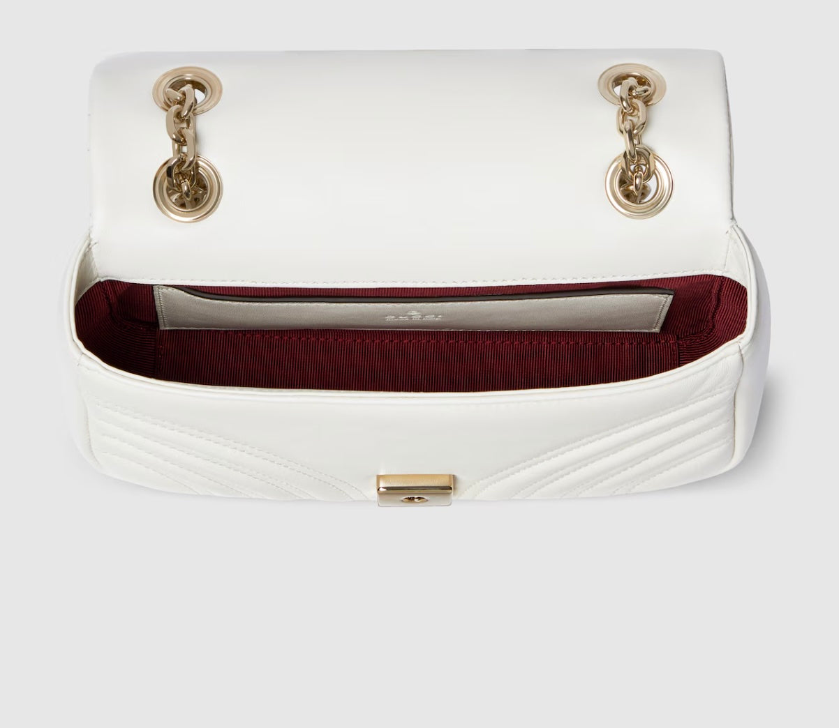 Elevate your everyday style with the iconic Gucci GG Marmont Small Shoulder Bag, a modern classic that blends timeless elegance with signature Italian craftsmanship. Made from luxurious Matelassé Chevron Calfskin leather, the bag features soft curves, a structured silhouette, and Gucci’s instantly recognizable Gold-tone Double G hardware.