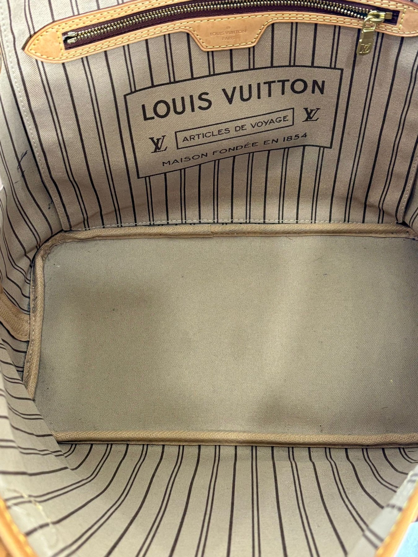 The vintage patina on the leather handles and trim adds character and charm, making each piece uniquely yours. With slim, comfortable shoulder straps and side laces that cinch for a more compact shape, the Neverfull easily transitions from a roomy carryall to a more structured silhouette. The spacious interior features a striped textile lining and a detachable zip pouch — perfect for organizing your essentials.