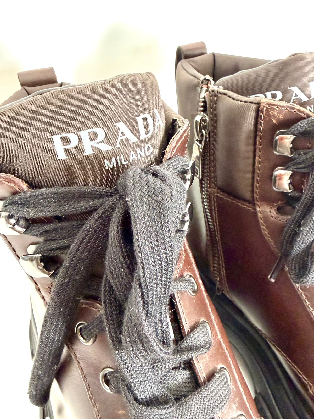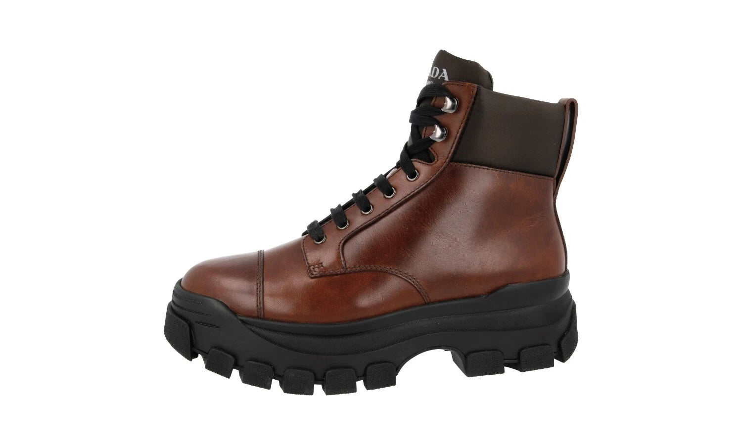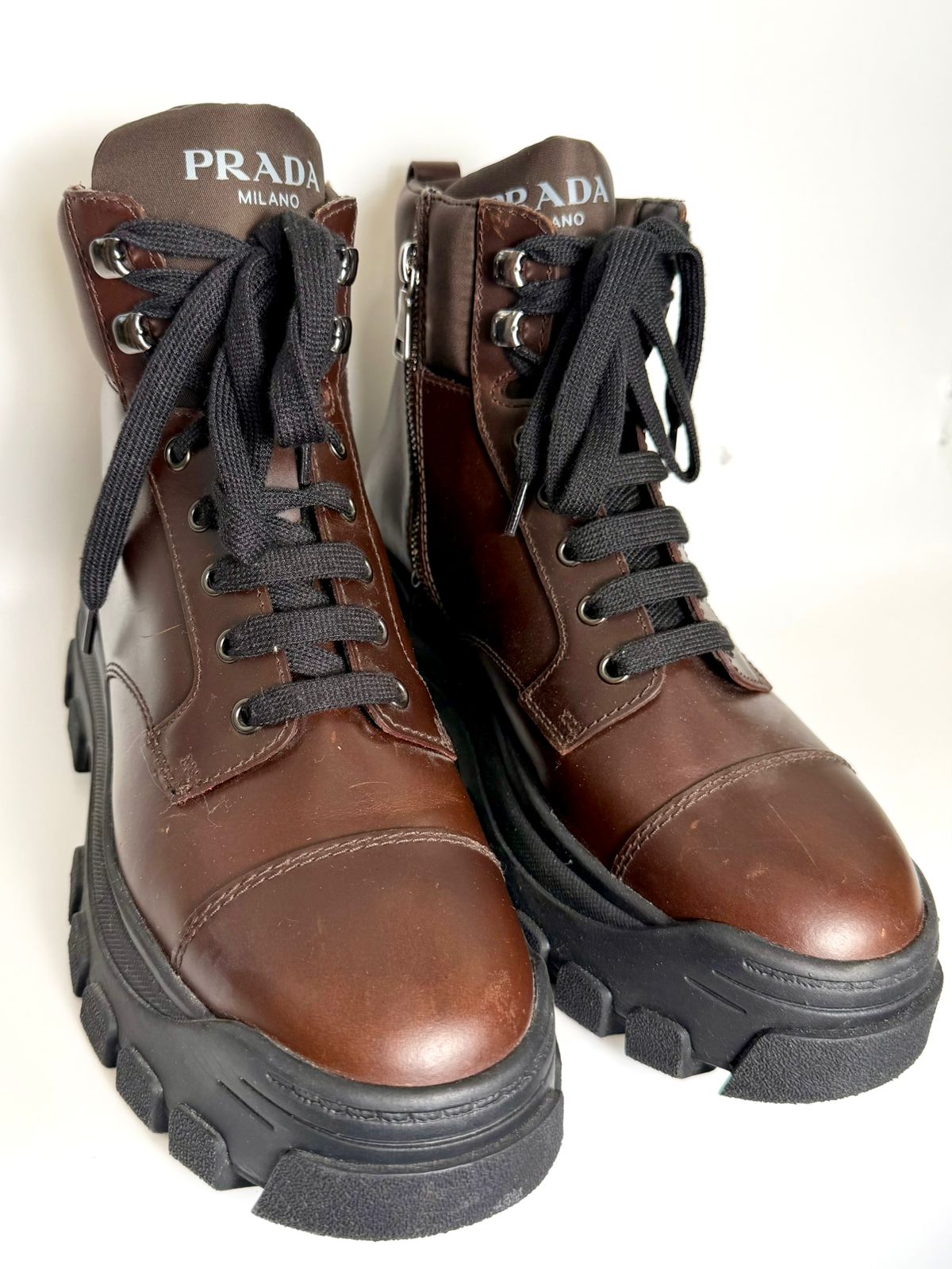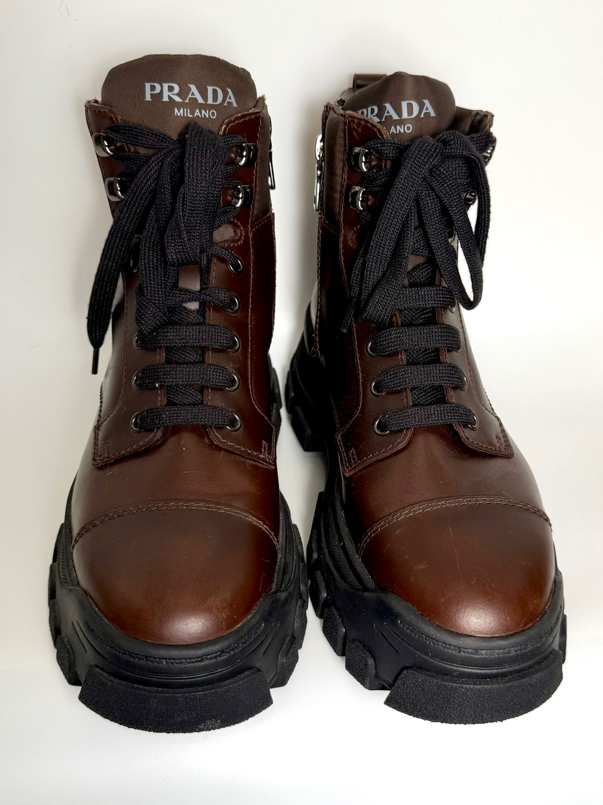 These stylish Prada Men’s Boots combine Rugged functionality with Modern luxury design. Crafted from premium brown calfskin leather, they feature a sleek lace-up silhouette enhanced by Prada’s signature Monolith chunky rubber sole for durability and bold visual impact. Designed for comfort and strength, these boots offer excellent traction and a contemporary edge, making them ideal for everyday wear or elevated casual looks.
