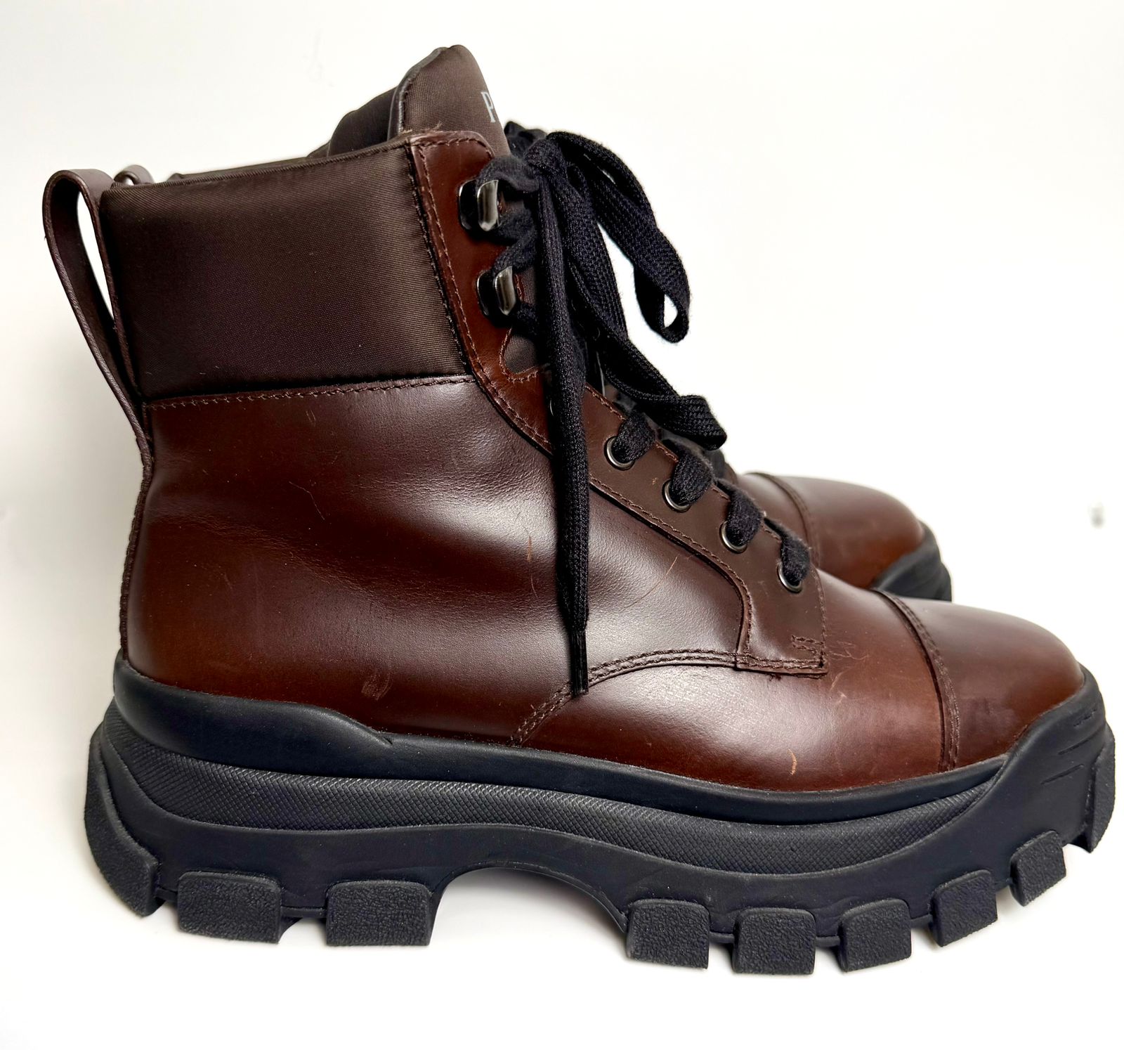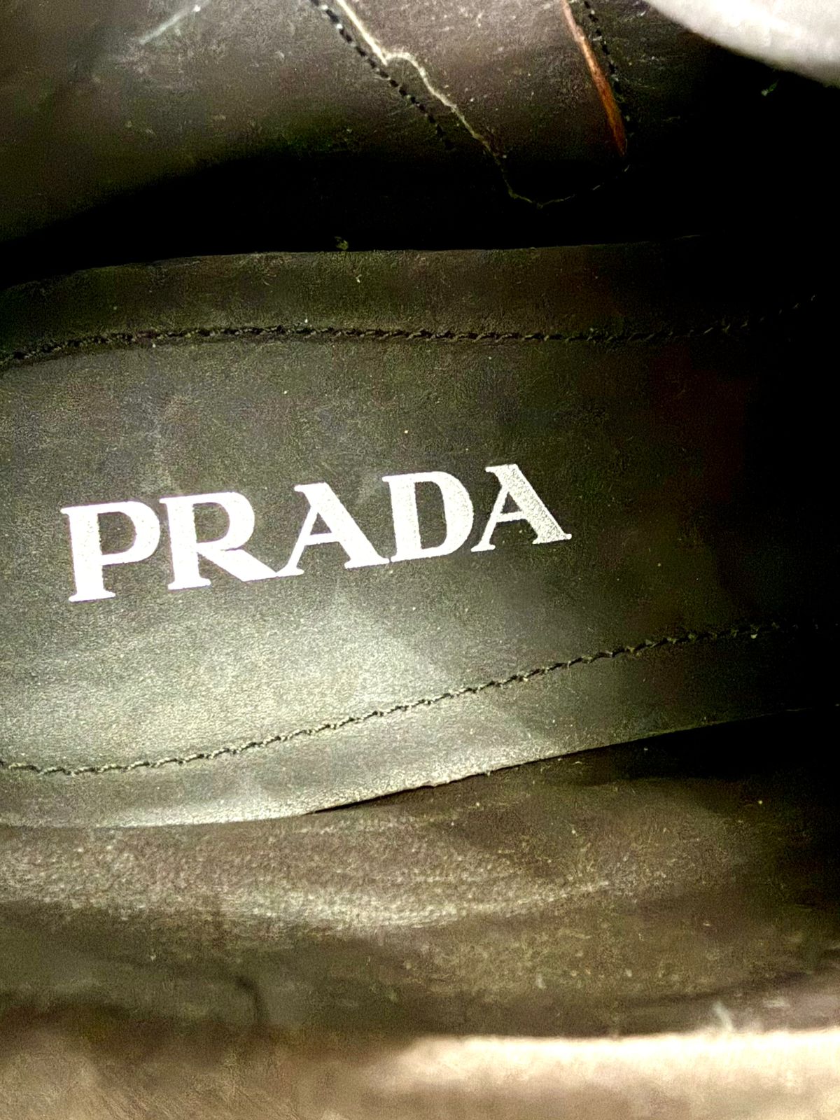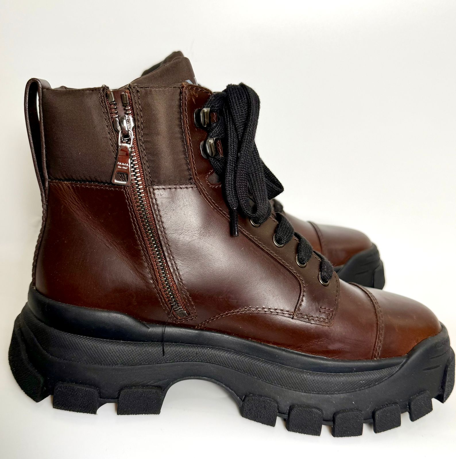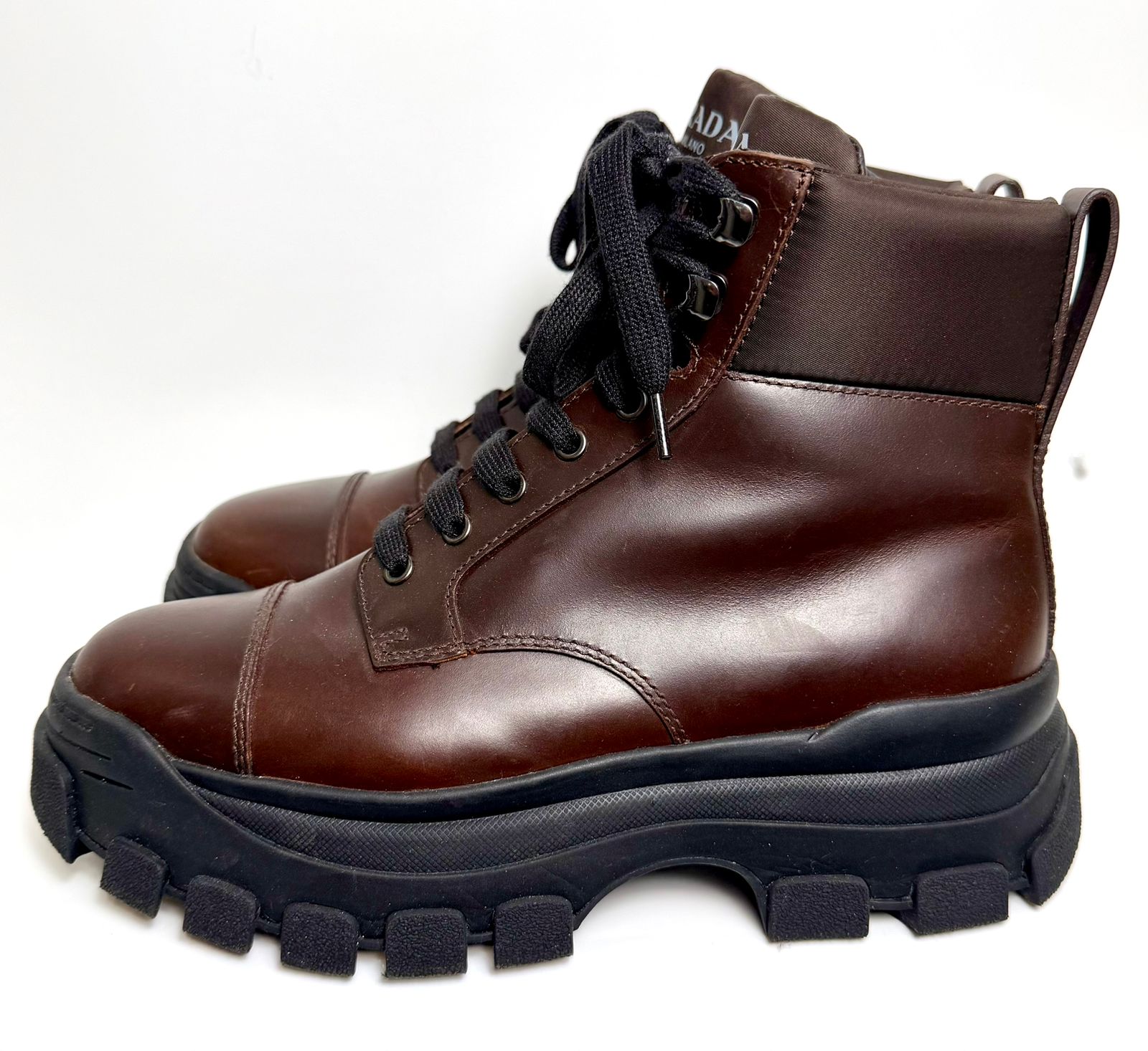 These stylish Prada Men’s Boots combine Rugged functionality with Modern luxury design. Crafted from premium brown calfskin leather, they feature a sleek lace-up silhouette enhanced by Prada’s signature Monolith chunky rubber sole for durability and bold visual impact. Designed for comfort and strength, these boots offer excellent traction and a contemporary edge, making them ideal for everyday wear or elevated casual looks.