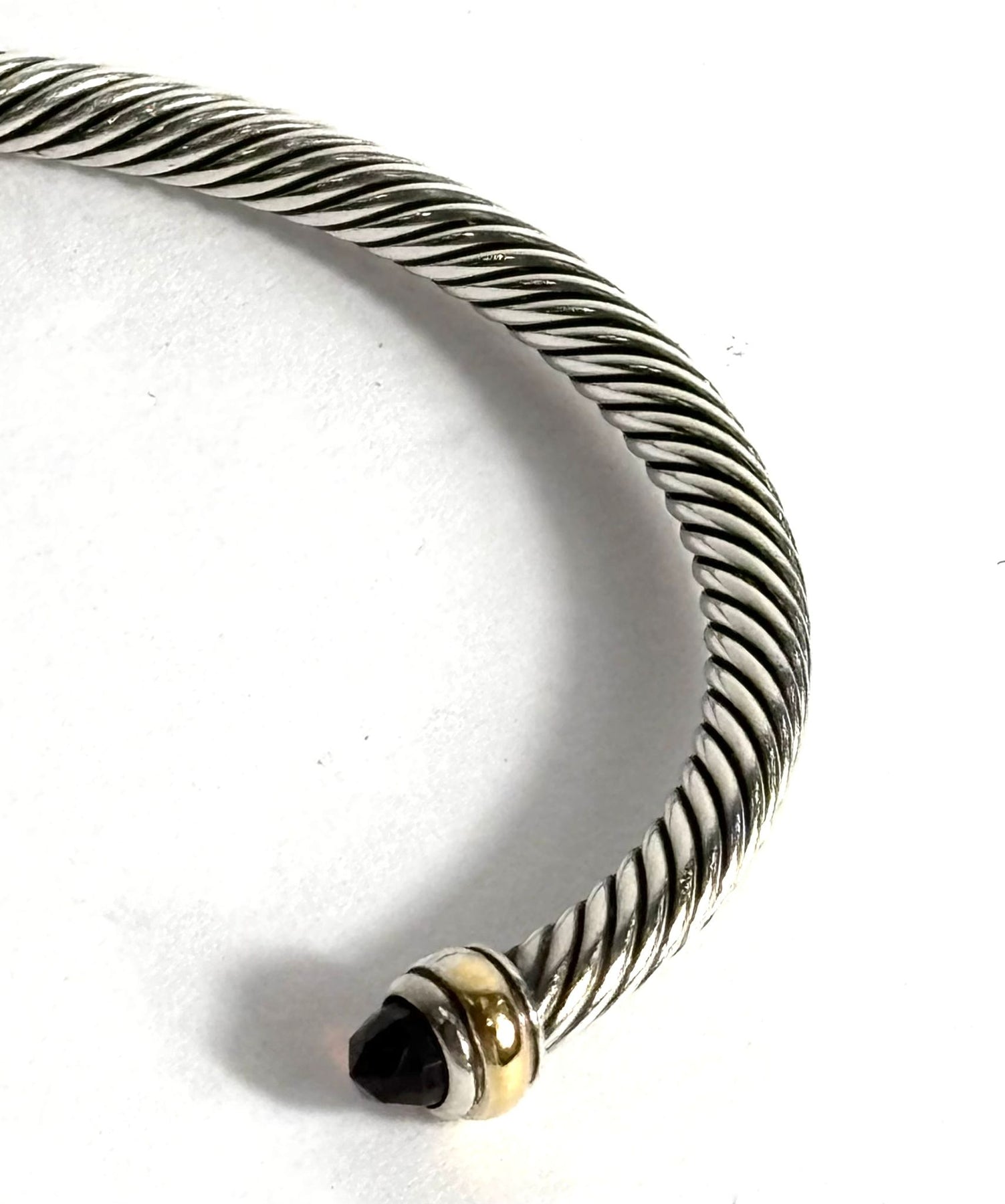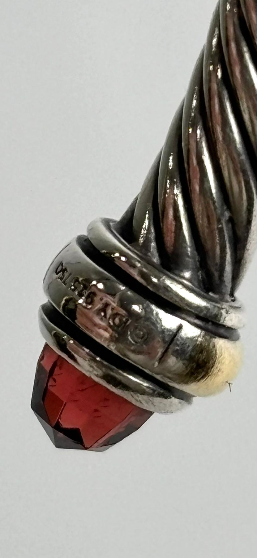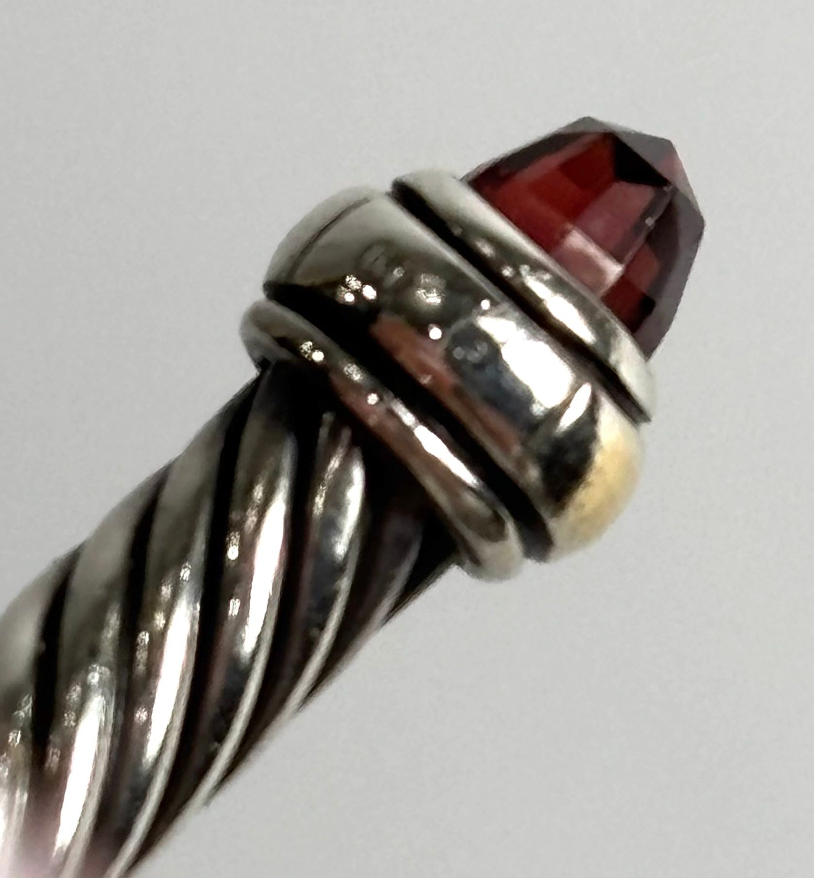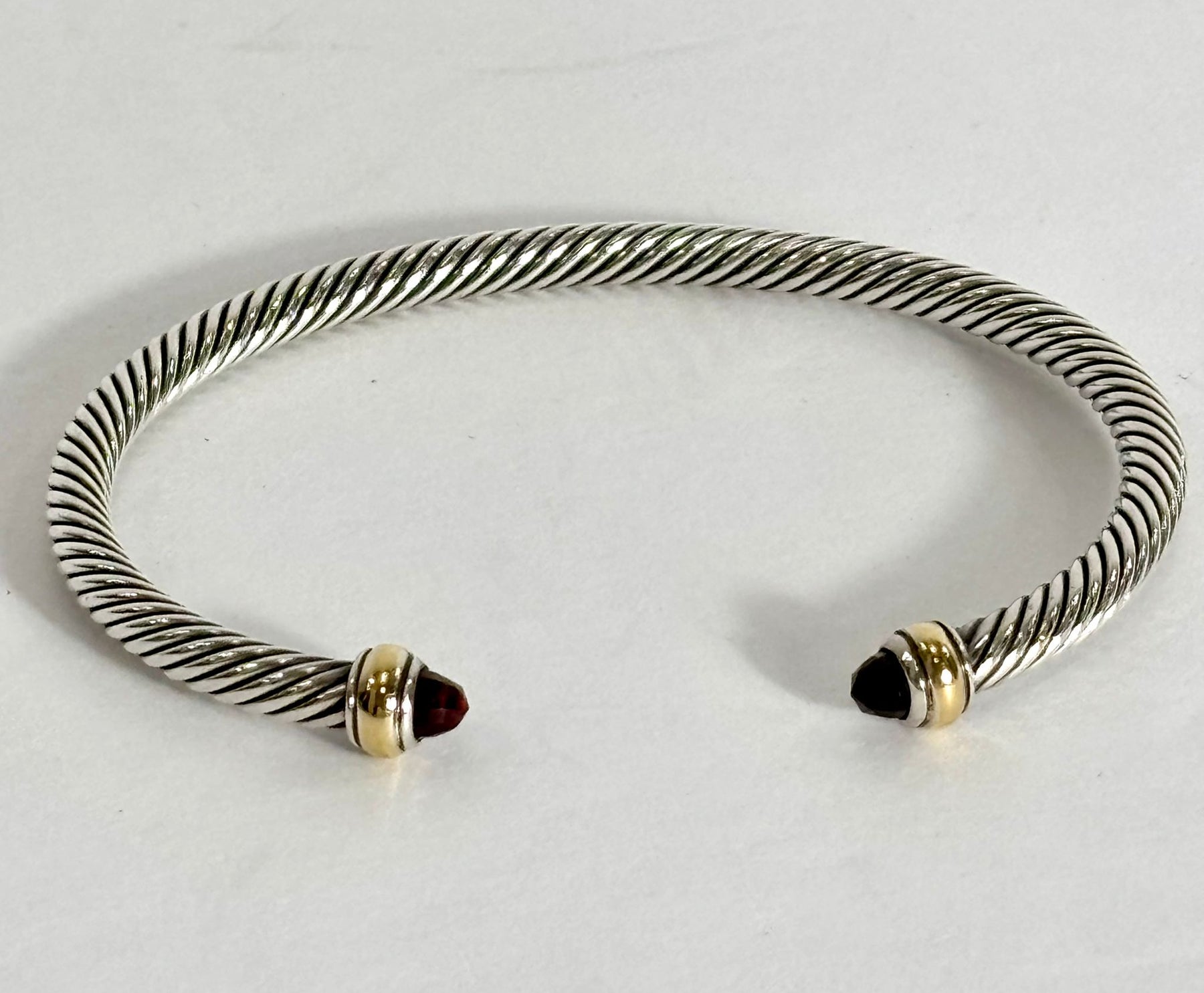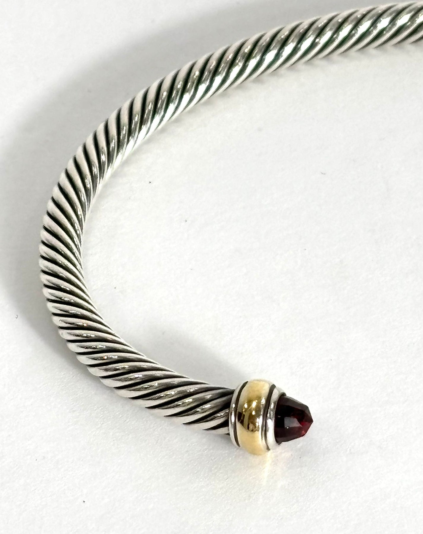 At each end, deep red garnet gemstones add a striking pop of color, beautifully framed by 14K yellow gold end caps that provide a warm, luxurious contrast to the silver cable. The open cuff silhouette offers effortless wear while contouring comfortably to the wrist.