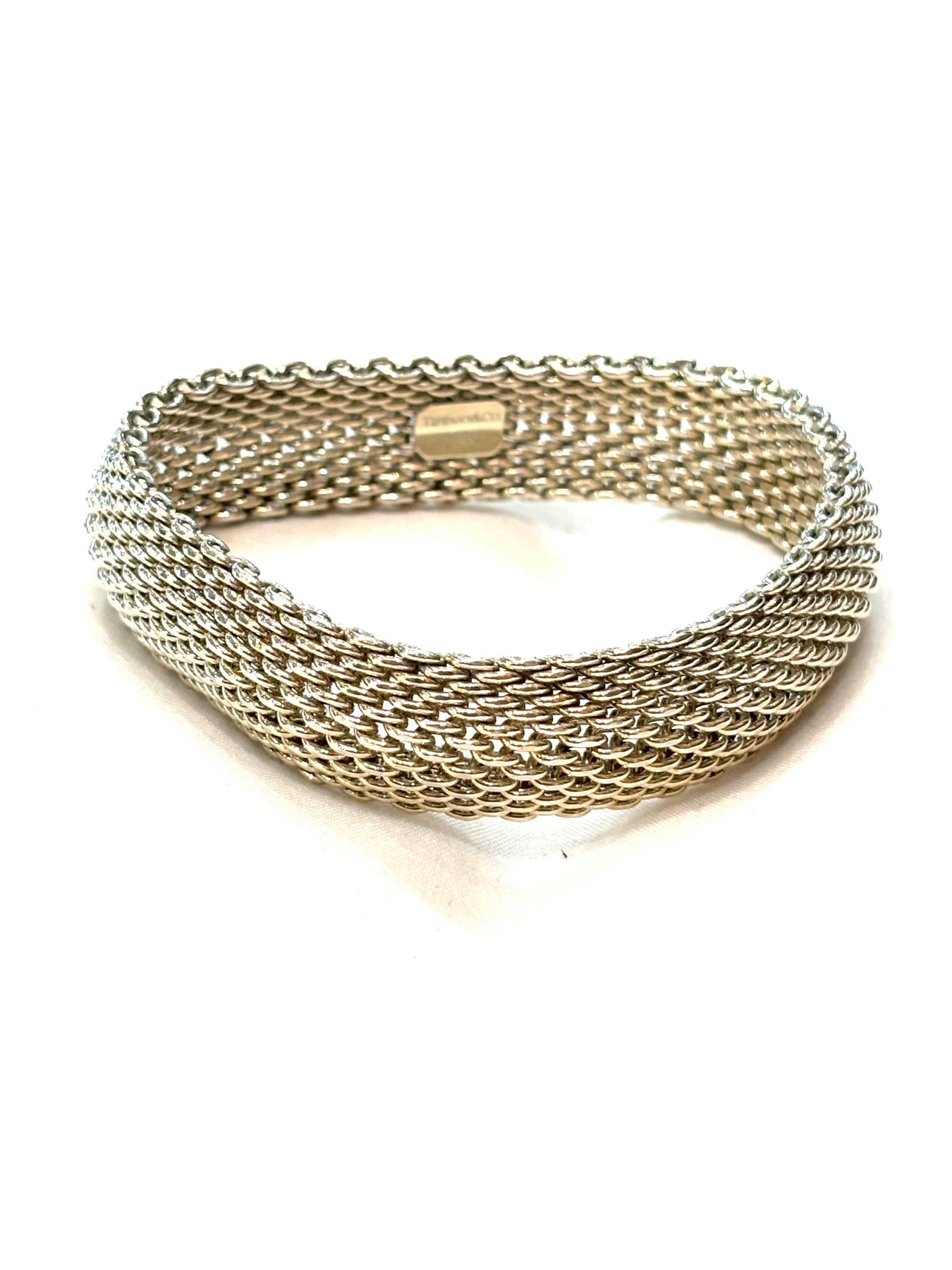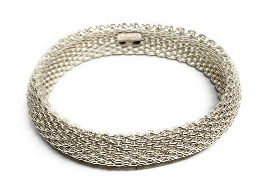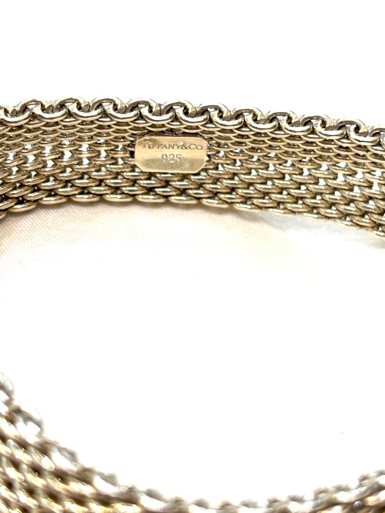 Tiffany & Co. Somerset mesh 925 sterling silver bracelet with approximately a 2.5-inch diameter and approximately a 7.5-inch circumference. The inside of the bracelet is marked Tiffany & Co. 925. The bracelet is approximately 1/2 inch wide, and made of flexible mesh but will not stretch.
