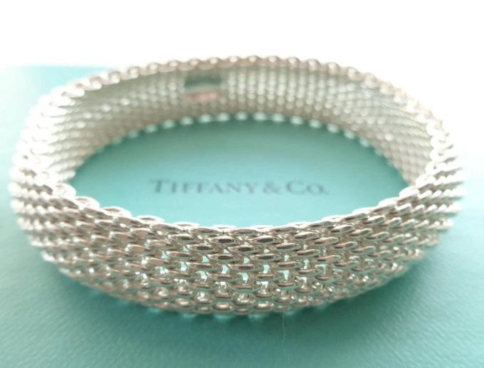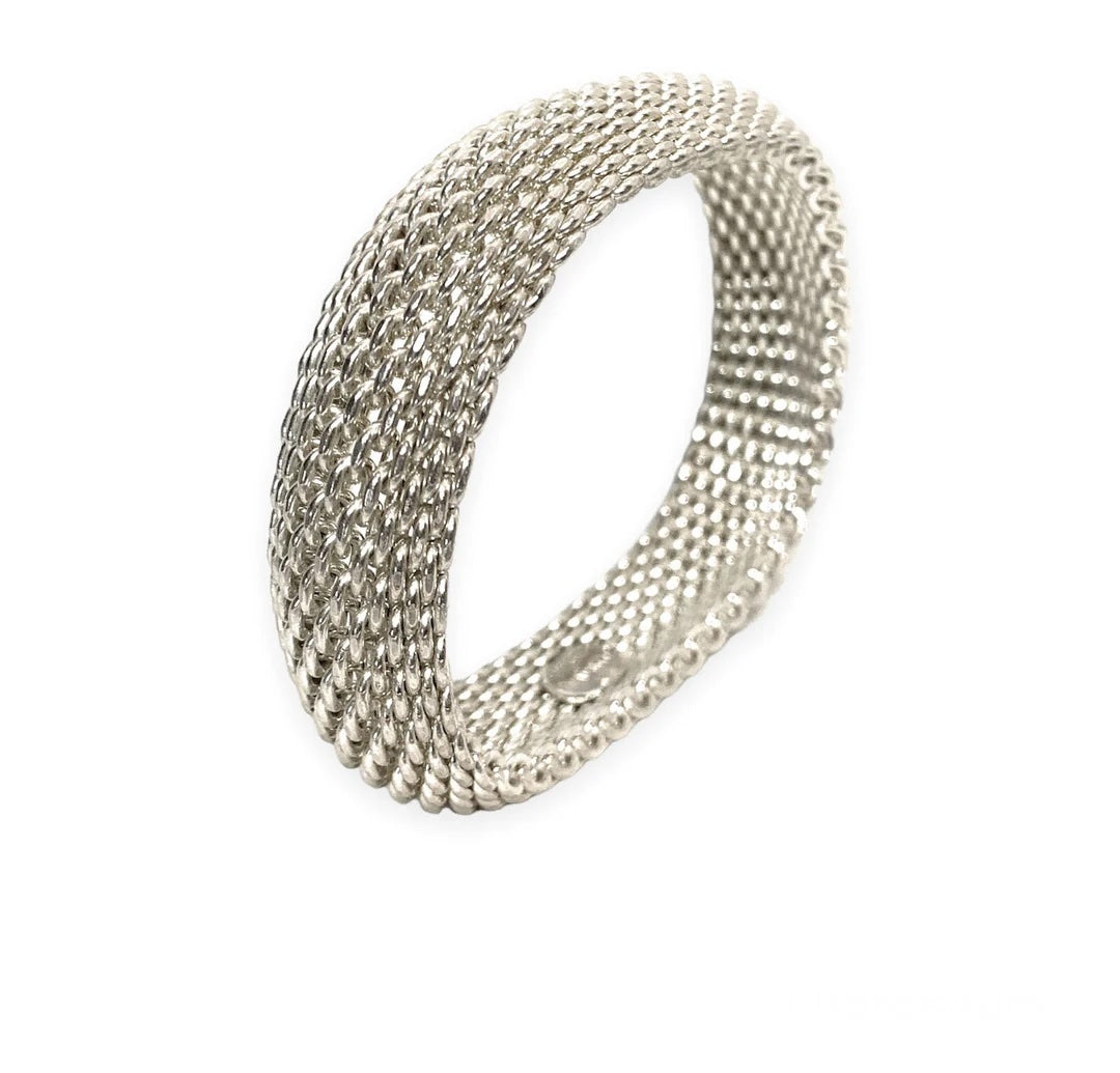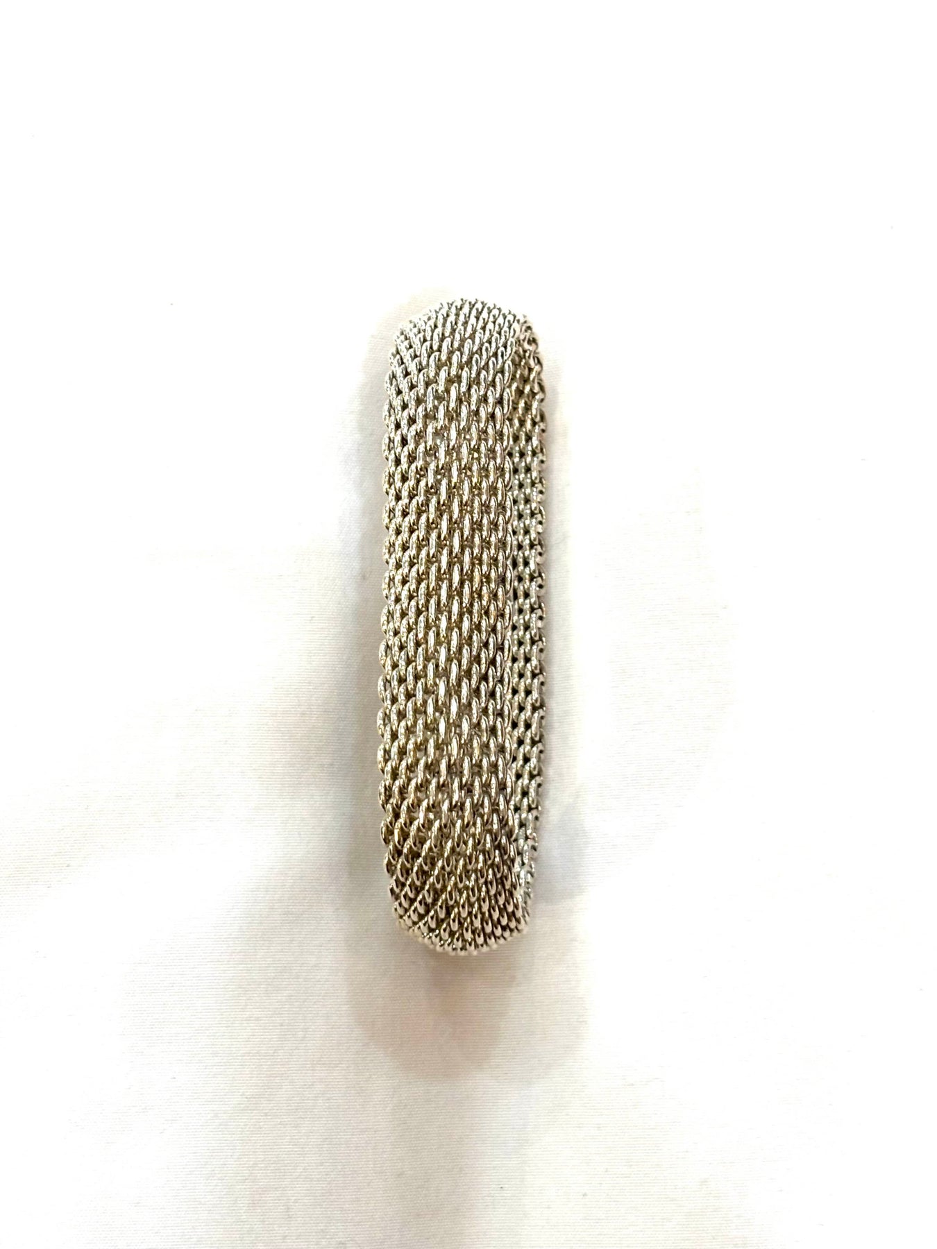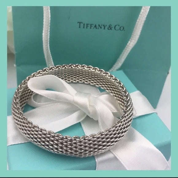 Tiffany & Co. Somerset mesh 925 sterling silver bracelet with approximately a 2.5-inch diameter and approximately a 7.5-inch circumference. The inside of the bracelet is marked Tiffany & Co. 925. The bracelet is approximately 1/2 inch wide, and made of flexible mesh but will not stretch.