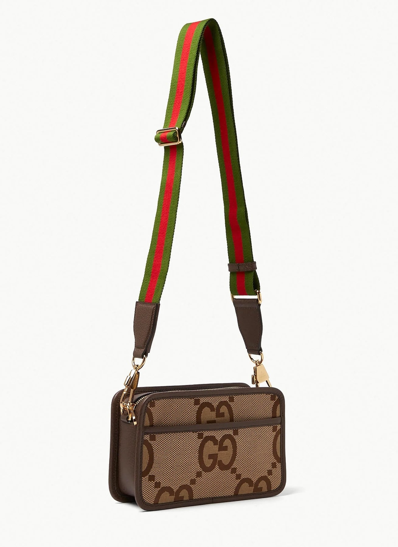 Compact, iconic, and effortlessly stylish, the Gucci Jumbo GG Canvas Mini Camera Bag with Web Strap beautifully reimagines a classic house motif in a fresh, modern silhouette. Crafted from Gucci’s signature Jumbo GG canvas, the bag features an enlarged monogram pattern that offers bold visual impact while remaining unmistakably timeless.