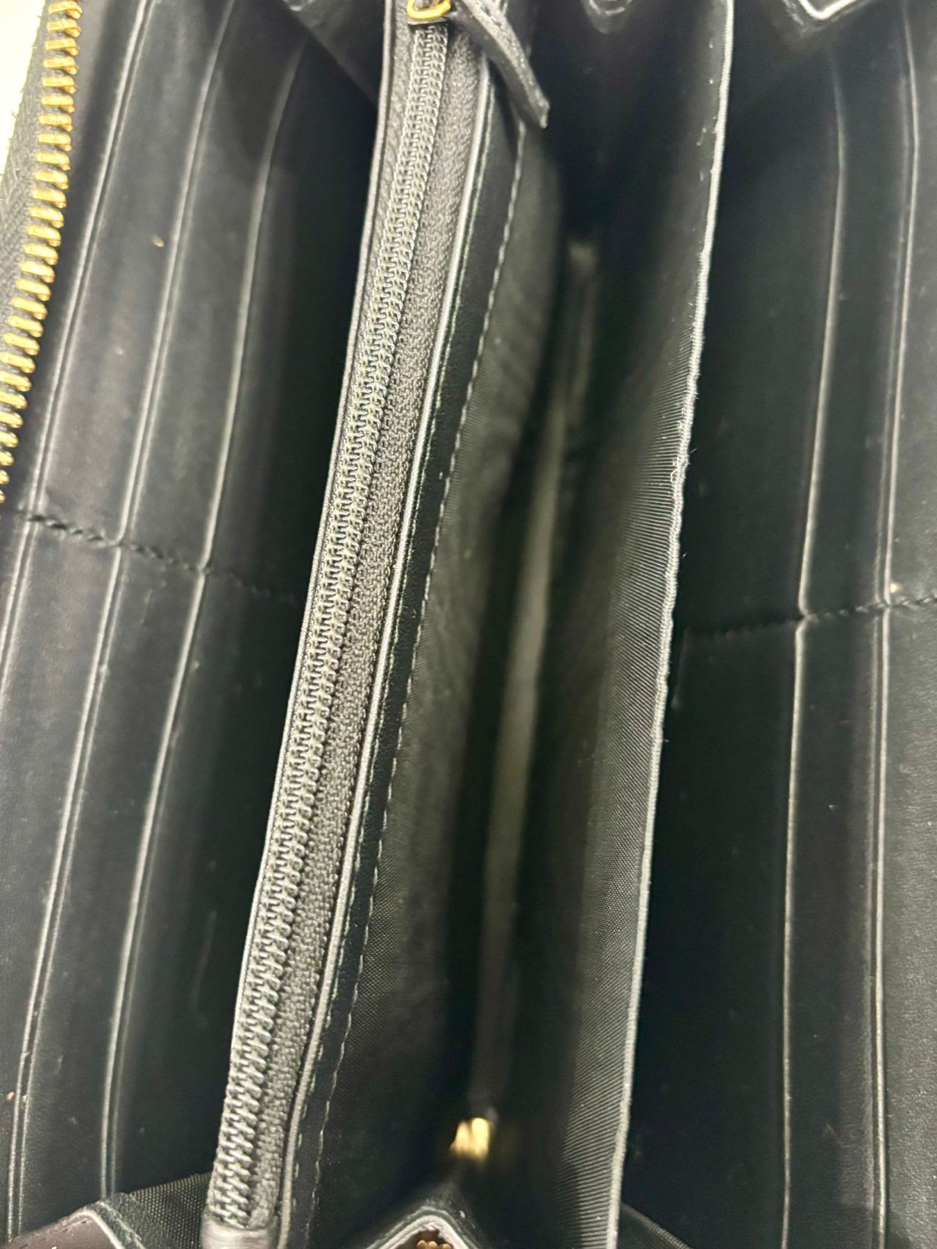 • Organized interior with multiple card slots, bill compartments, and a zip coin pocket