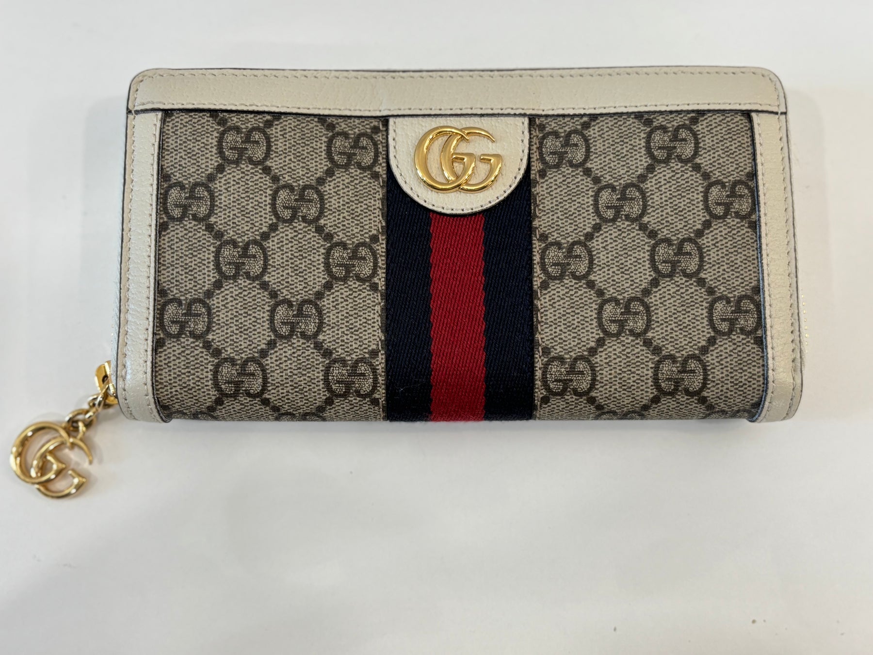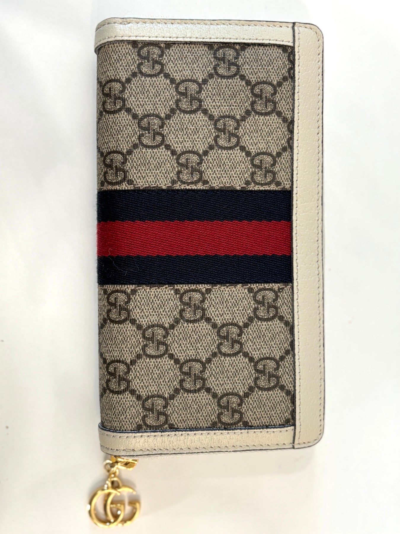Elegant and instantly recognizable, this Gucci Ophidia Zip-Around Wallet showcases the house’s signature GG Supreme monogram canvas in beige and ebony, accented with a Mystic white leather trim and the iconic blue-and-red Web stripe. A Double G gold-tone logo adds a timeless finishing touch.