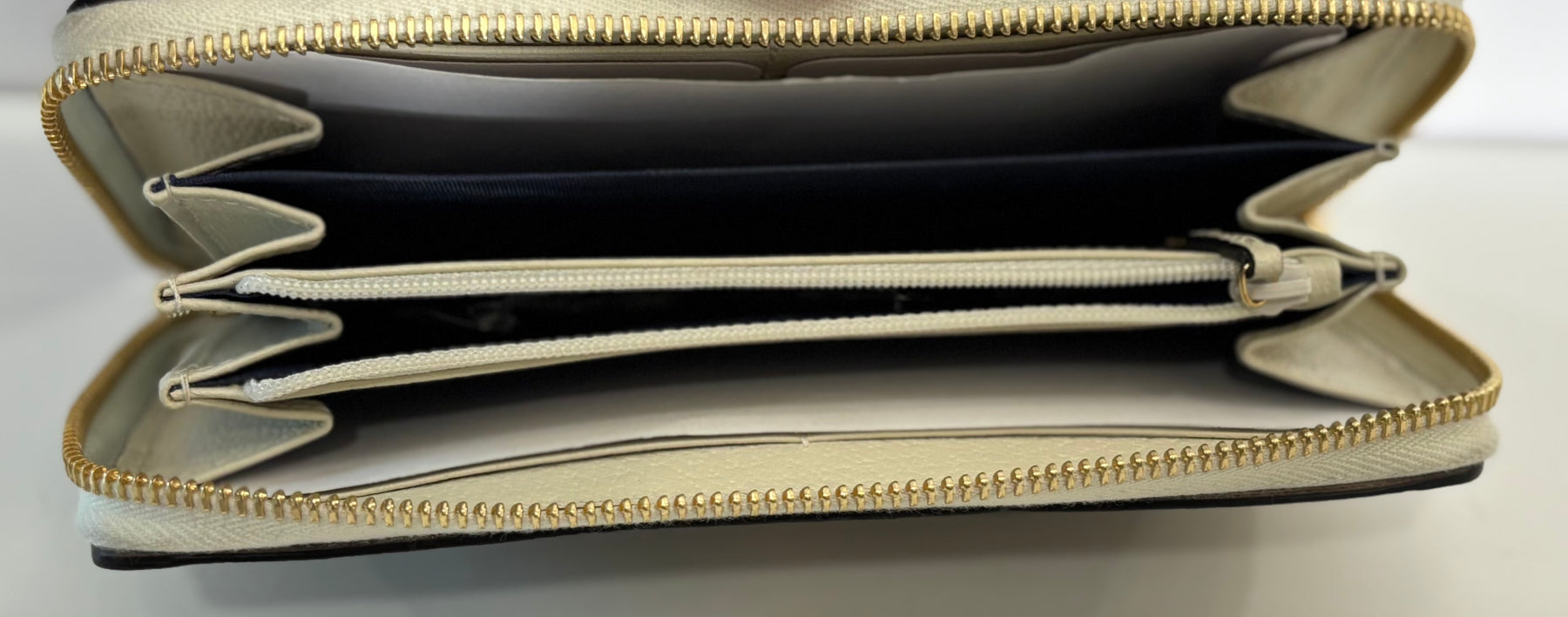 The wrap-around zip opens to a blue fabric and white leather interior with multiple card slots, a zip coin compartment, and bill pockets—perfectly balancing luxury and functionality.
