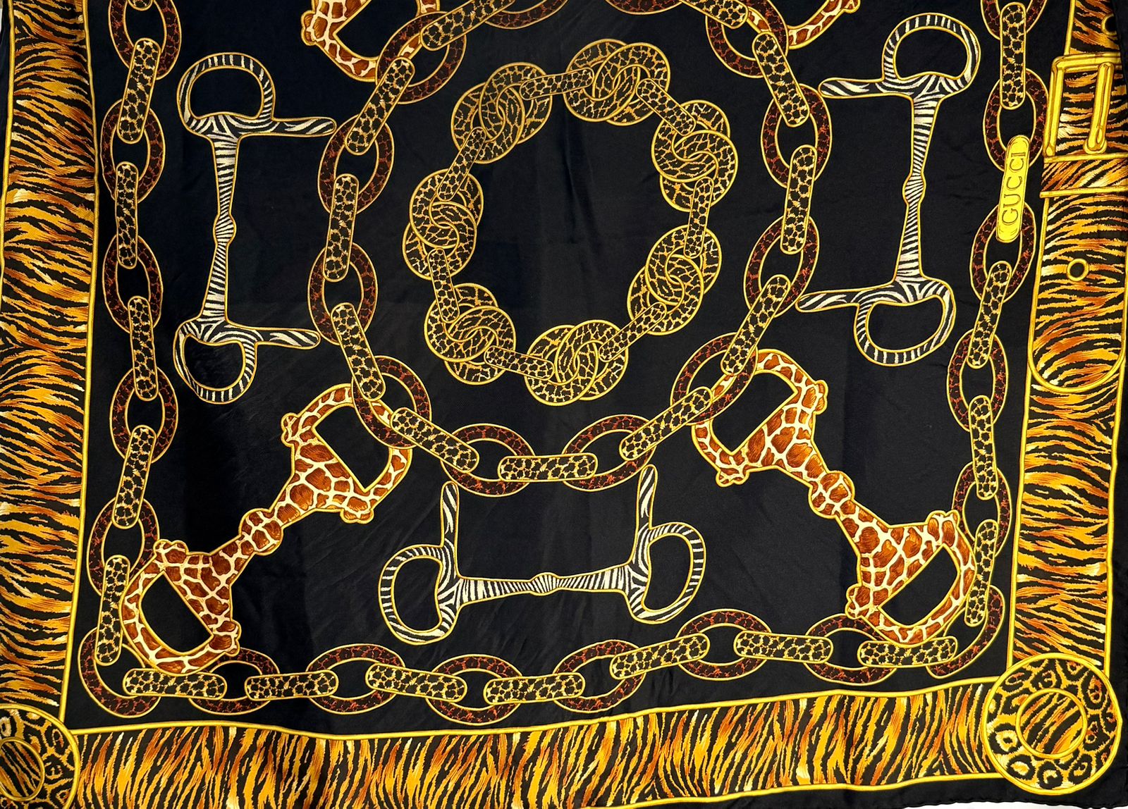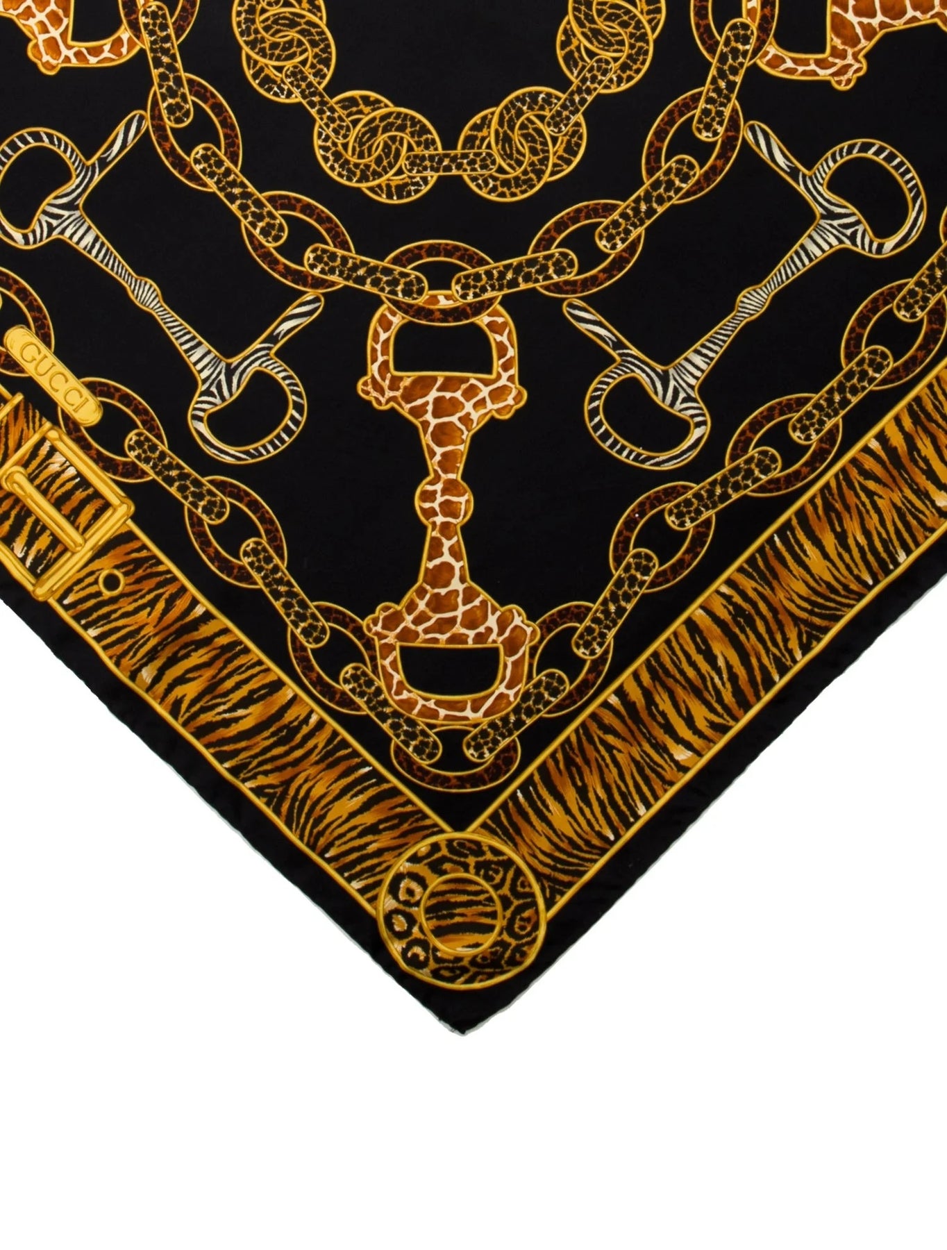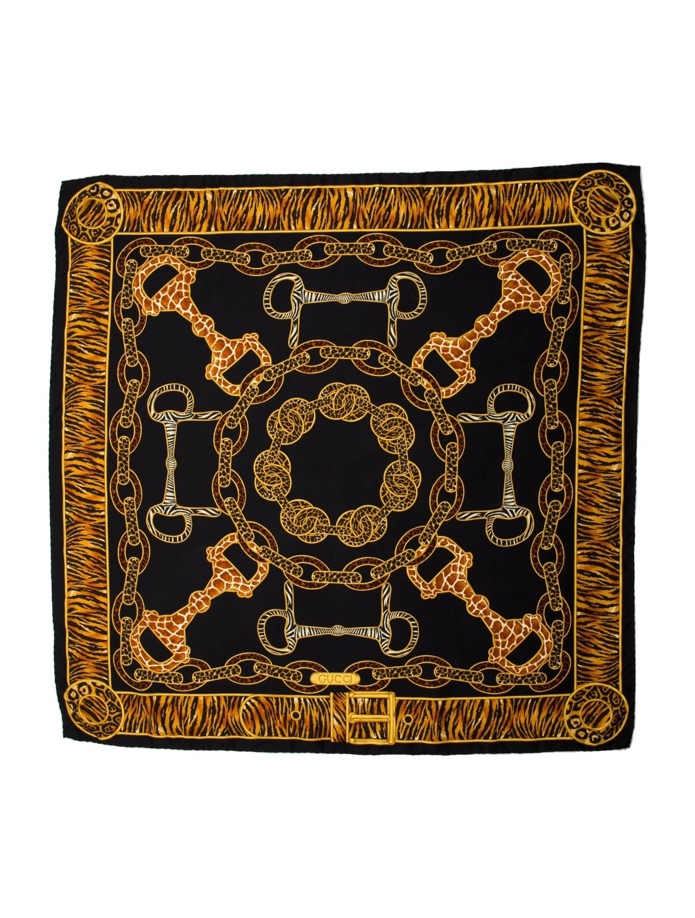 Bold and sophisticated, this Gucci scarf showcases a striking blend of equestrian heritage and exotic influence. Crafted from luxurious silk, it features an intricate horsebit and chain motif accented with animal print details—creating a statement accessory that elevates any ensemble.