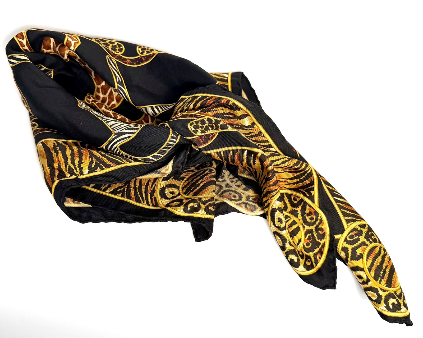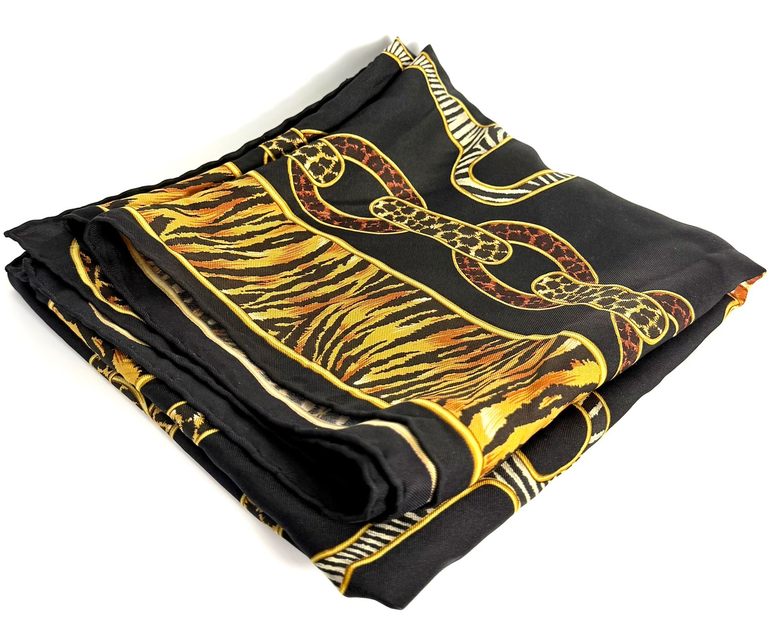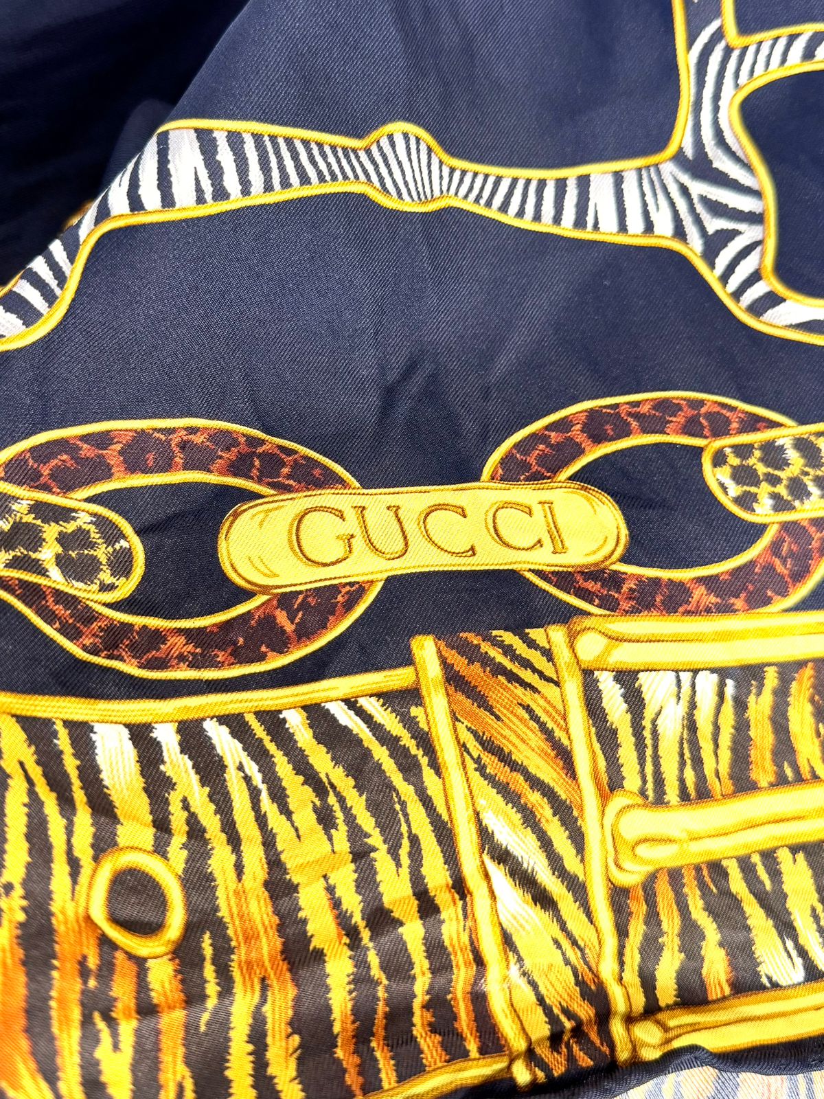 Bold and sophisticated, this Gucci scarf showcases a striking blend of equestrian heritage and exotic influence. Crafted from luxurious silk, it features an intricate horsebit and chain motif accented with animal print details—creating a statement accessory that elevates any ensemble.
