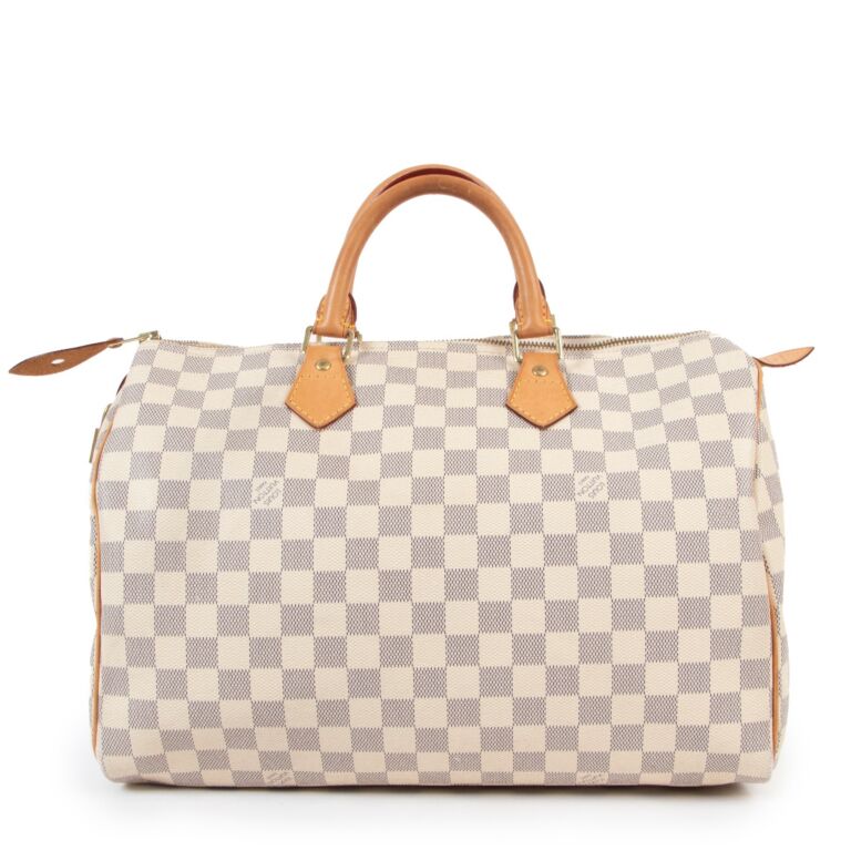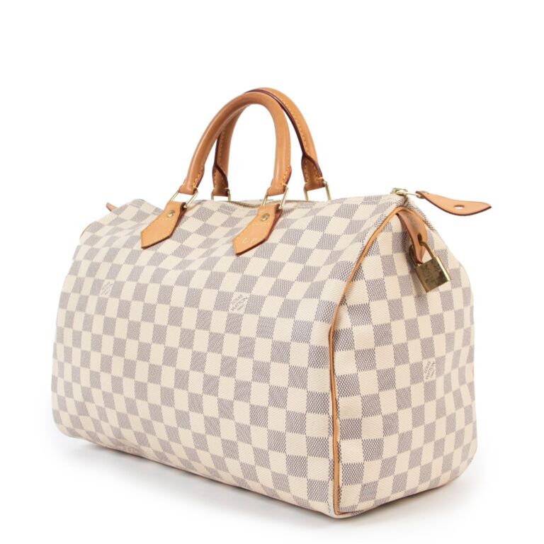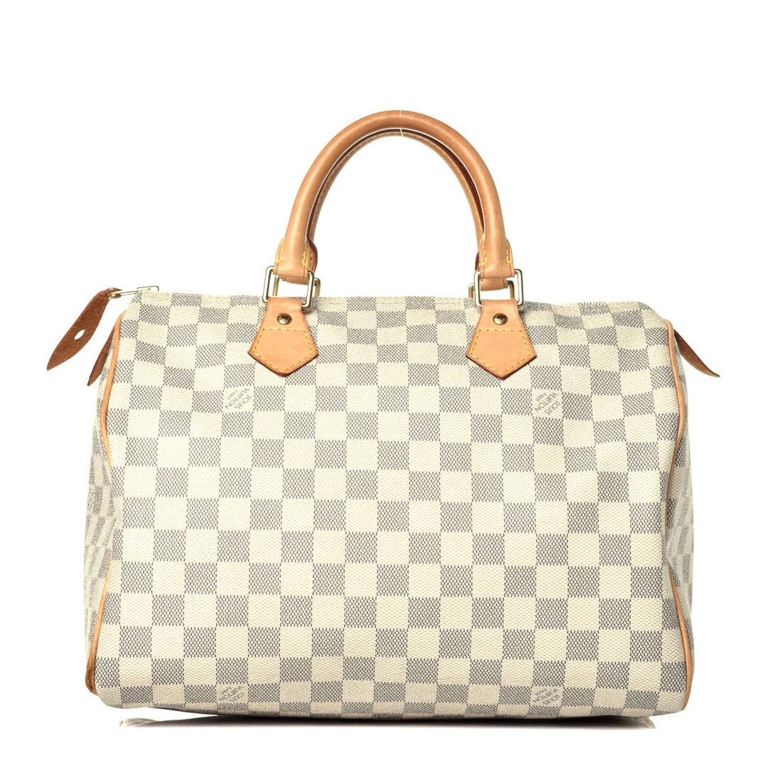 The Louis Vuitton Damier Azur Speedy 35 Top Handle Bag is a refreshed take on one of the most iconic silhouettes in luxury fashion. Featuring Louis Vuitton’s signature Damier Azur coated canvas — a light, fresh checkerboard pattern perfect for seasonal elegance — this version of the Speedy combines heritage style with everyday practicality.