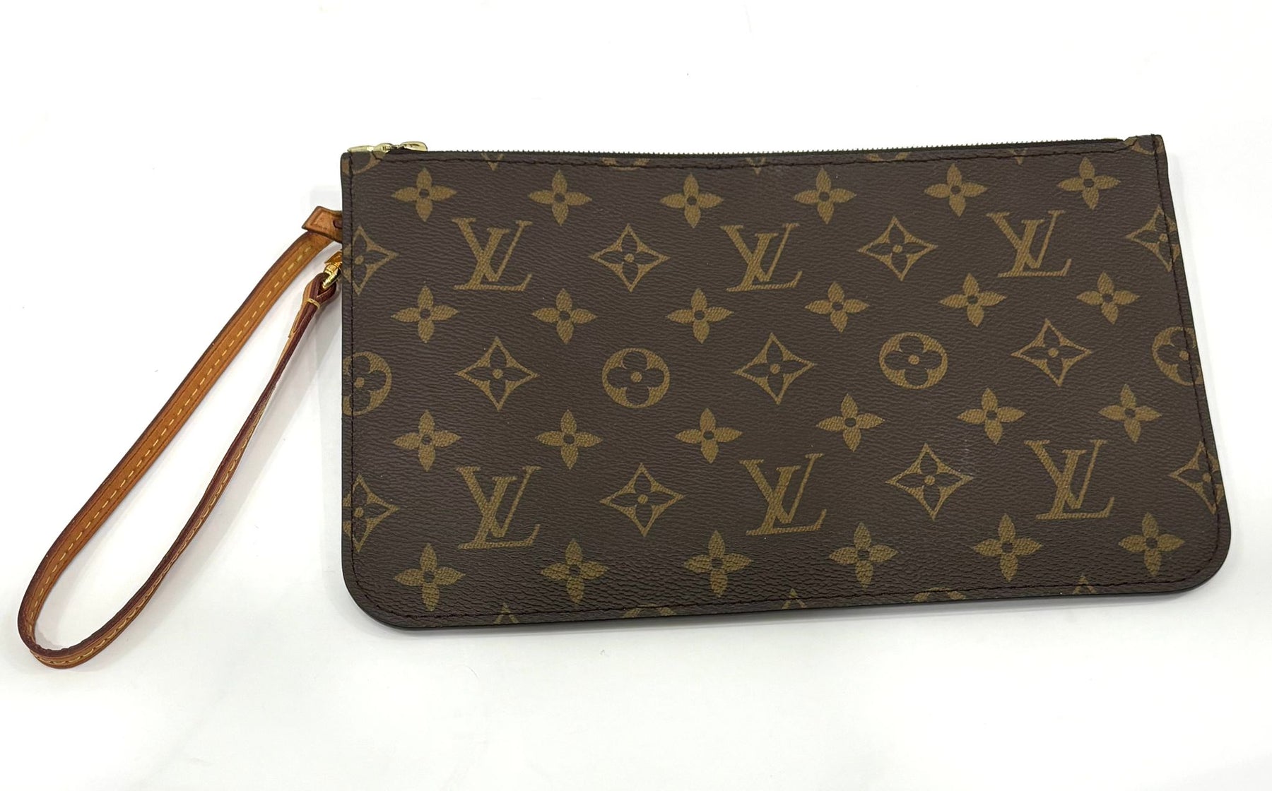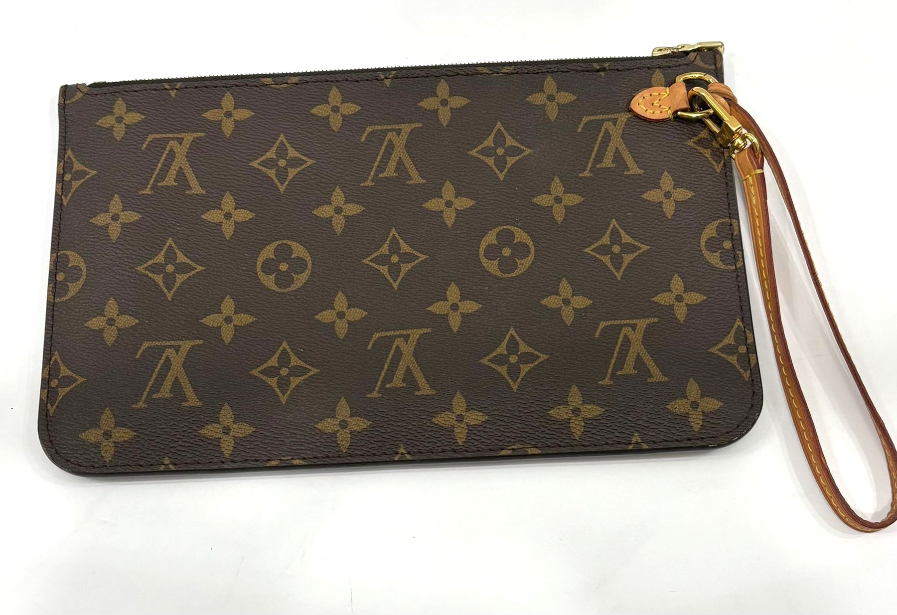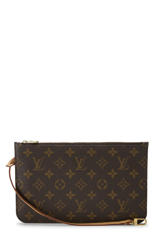 This Louis Vuitton Neverfull MM Pochette Wristlet is crafted from the iconic Monogram coated canvas and paired with a natural Vachetta leather wrist strap for versatile, effortless carry. The slim, structured silhouette features gold-toned hardware and a secure top zip closure.