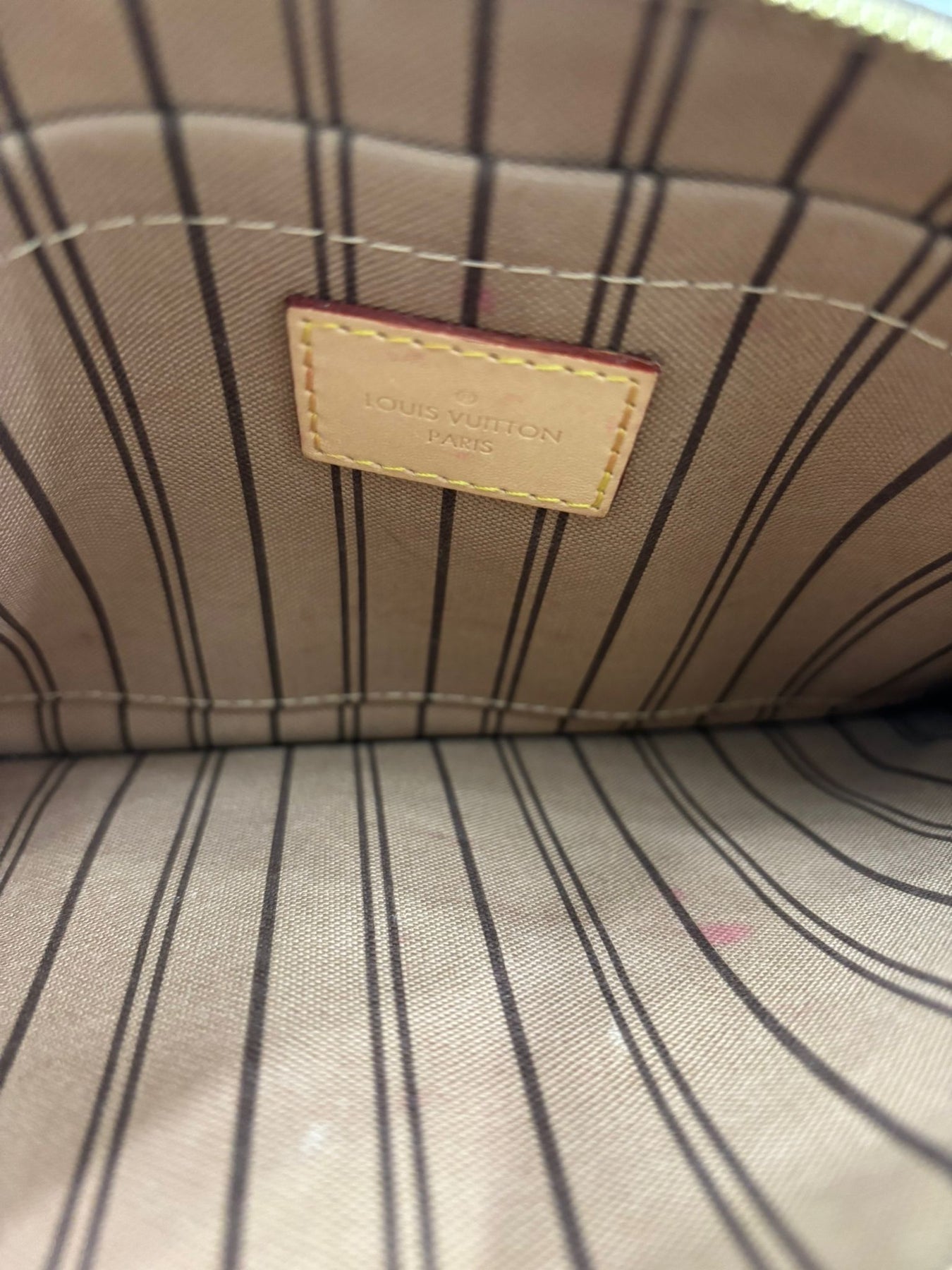 The zipper opens to a Beige striped canvas-lined interior with a flat slip pocket, offering just enough space for your essentials. Originally included with the Neverfull MM tote, this pouch is highly sought after for its standalone use as a clutch or wristlet.