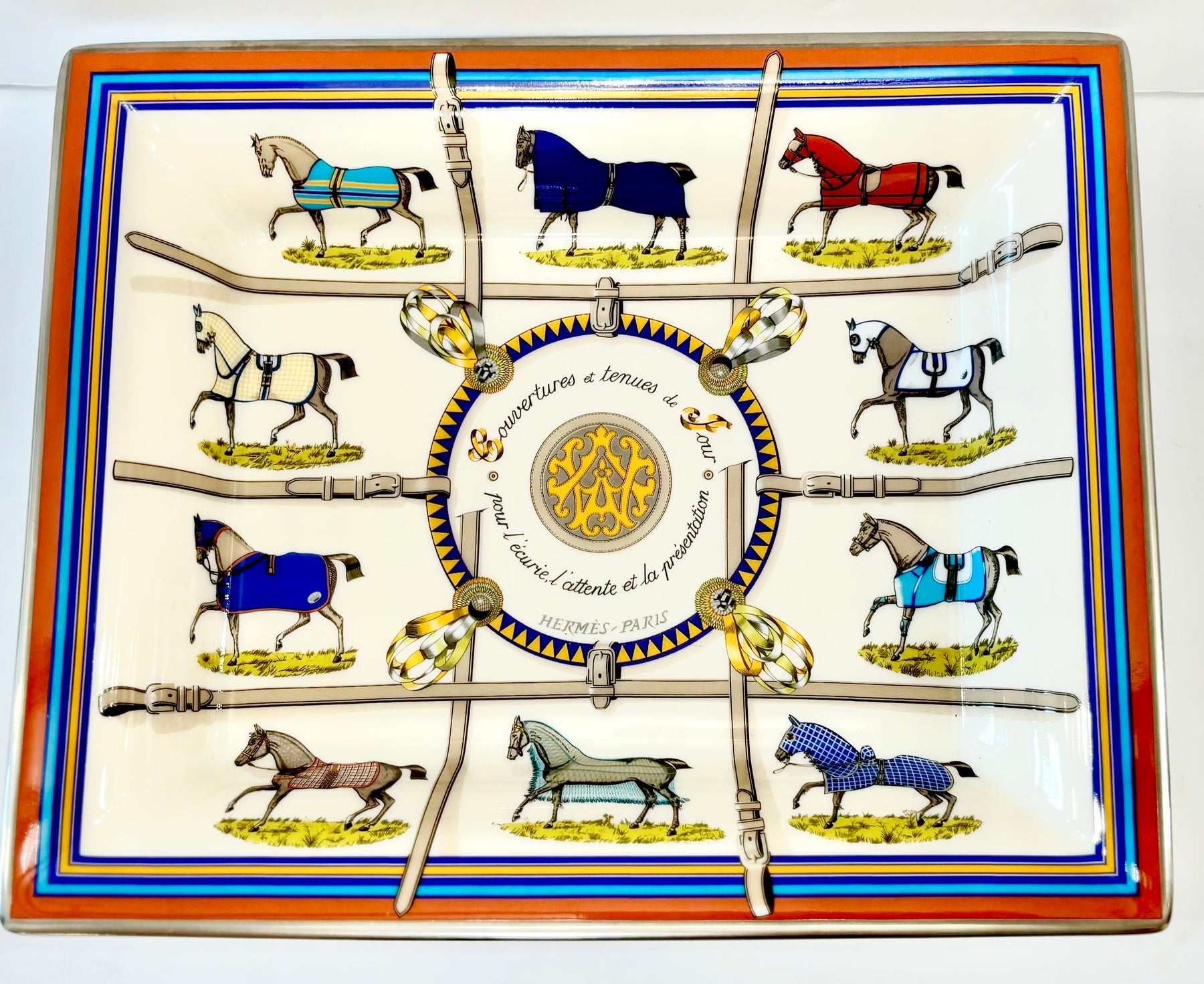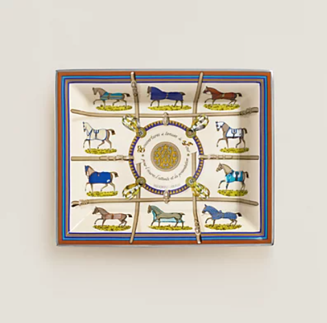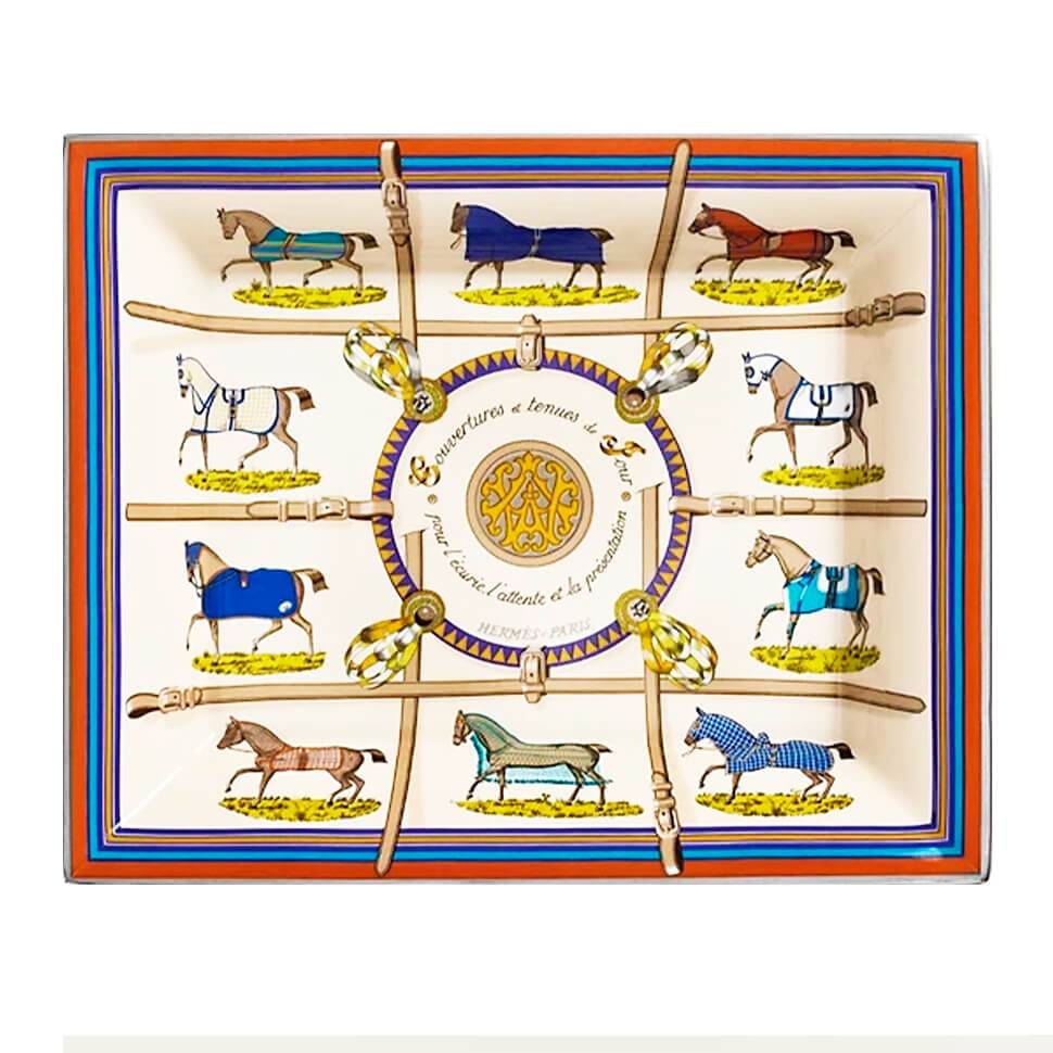 A refined decorative accent, the Hermès Couvertures et Tenues de Jour Change Tray showcases the House’s equestrian heritage through intricate illustration and timeless design. Crafted from fine porcelain, this square tray features detailed depictions of horses adorned in traditional blankets and day attire, framed by rich, signature Hermès colors.