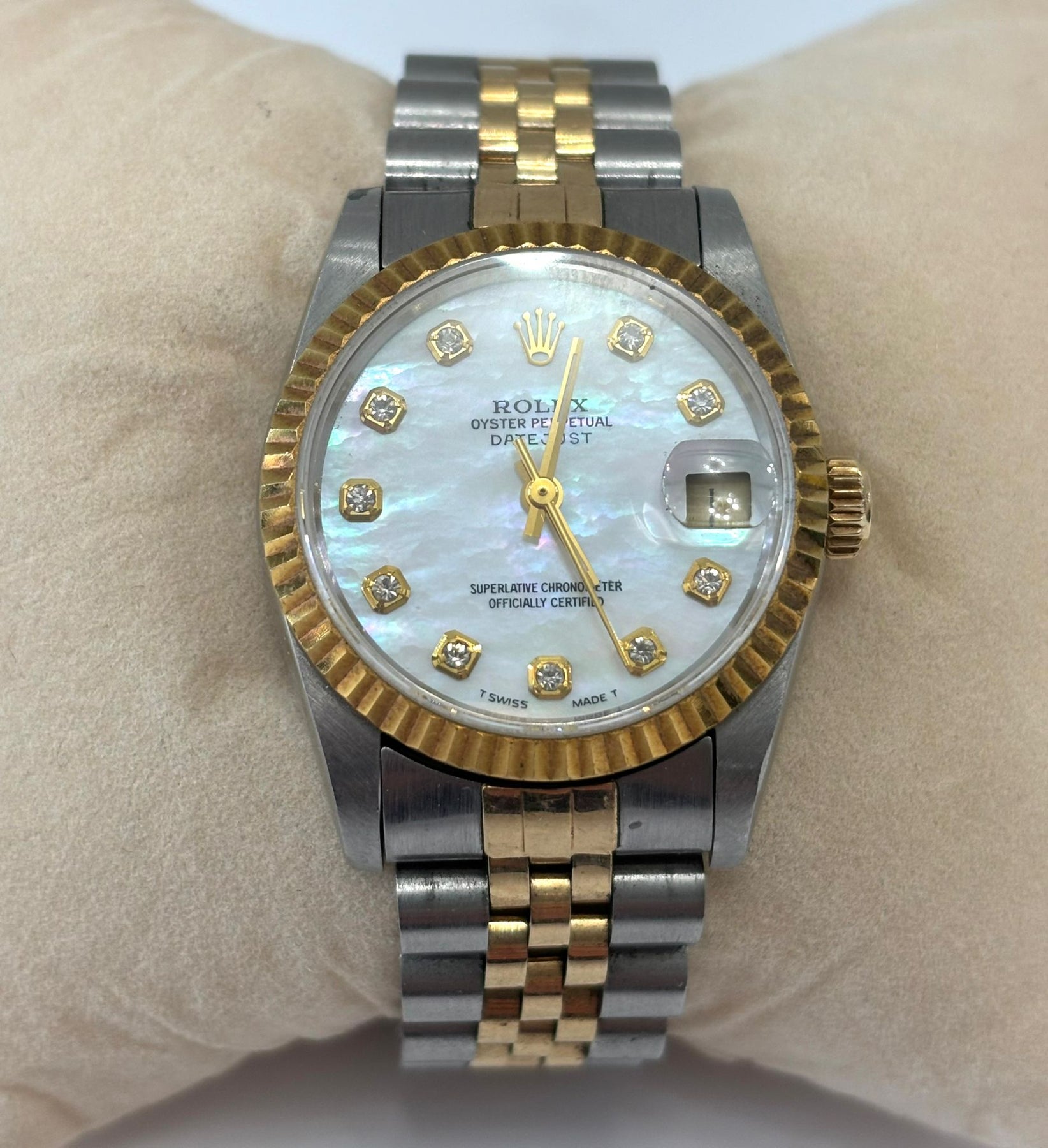 An enduring icon of Swiss watchmaking, the Rolex Datejust 179173 blends classic elegance with refined luxury. Crafted from stainless steel and 18K yellow gold, this timeless two-tone timepiece features a brilliant factory diamond-set dial that adds subtle sparkle and sophistication.