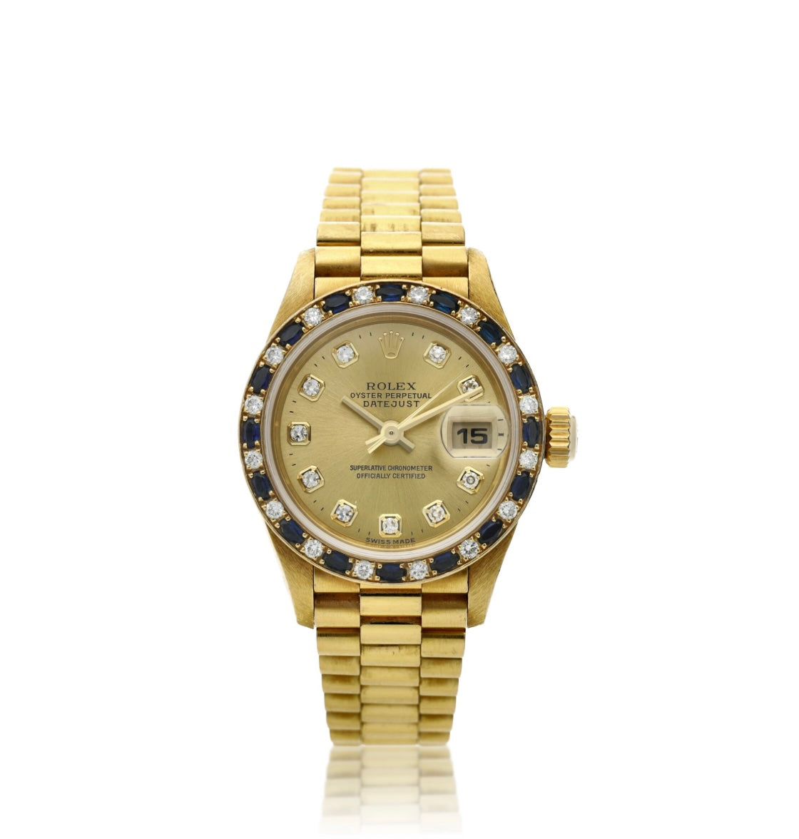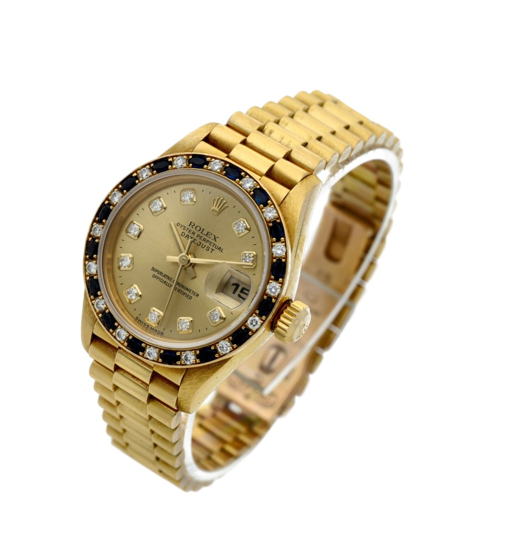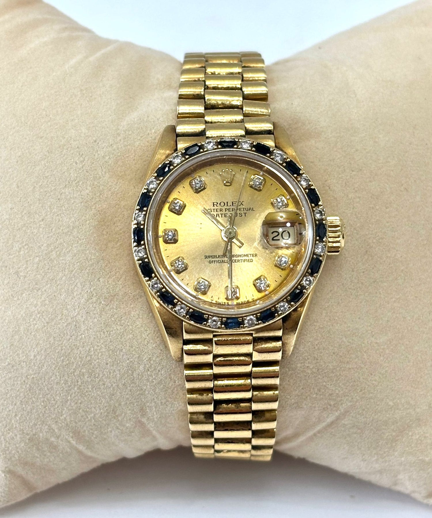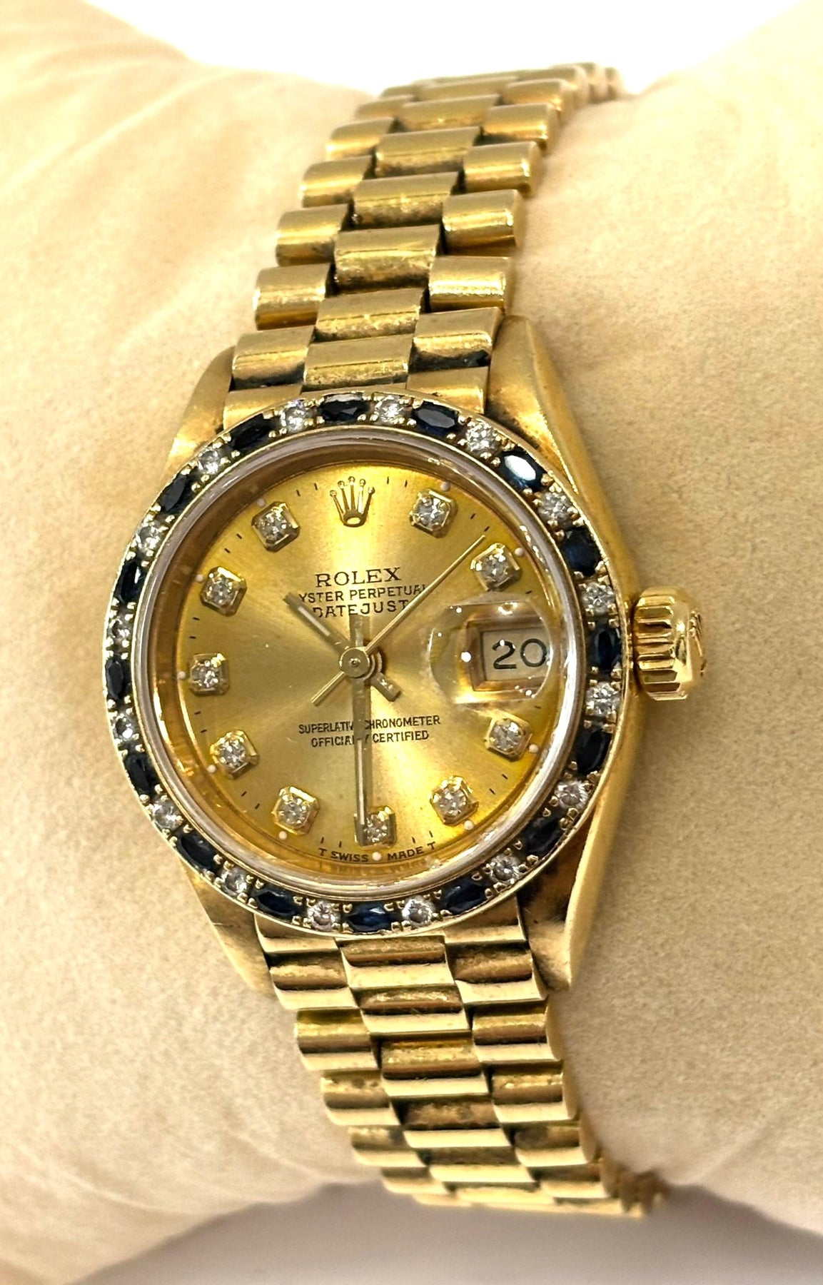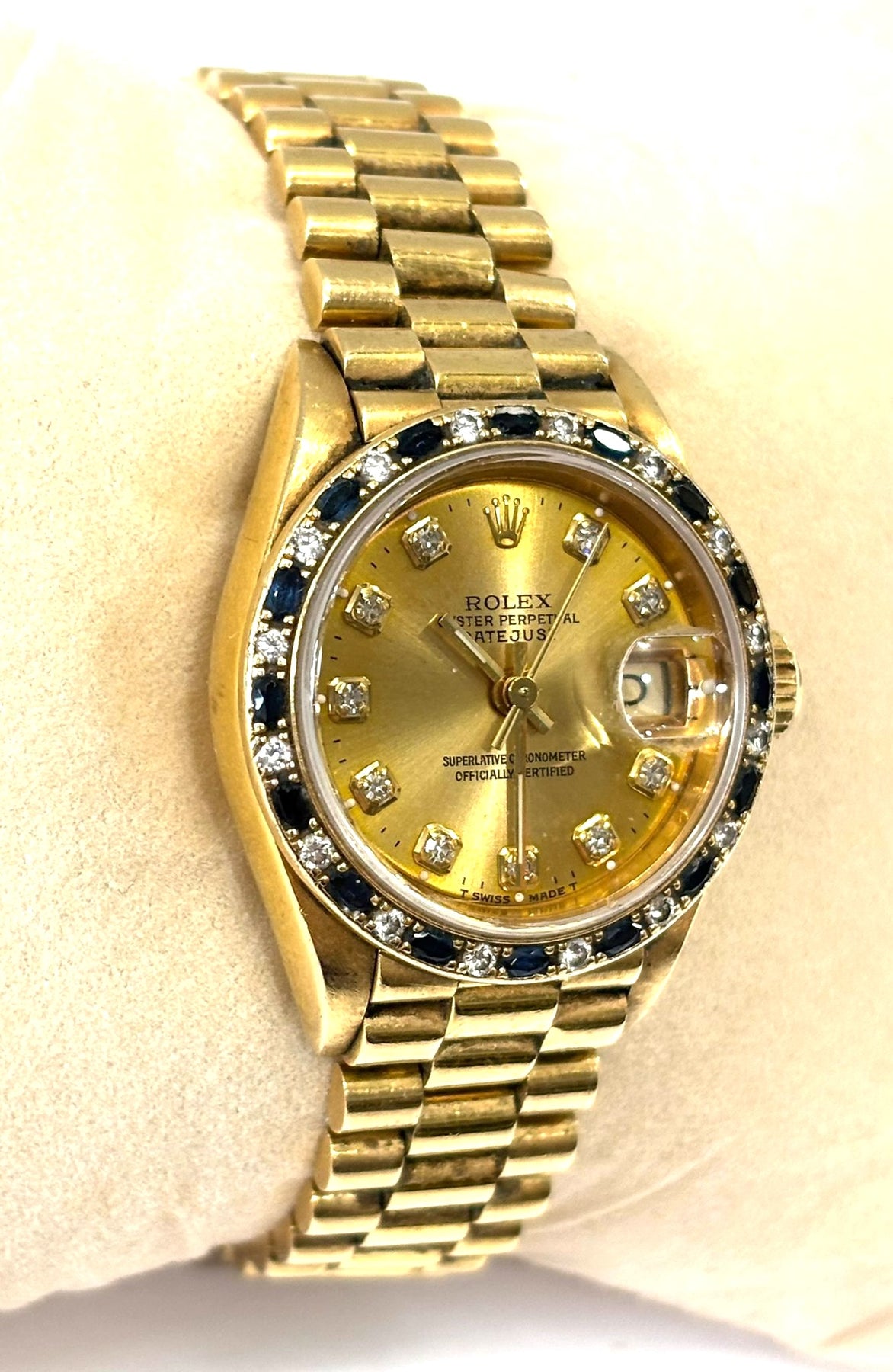 ROLEX DATEJUST 18K GOLD DIAMOND & SAPPHIRE BEZEL PRESIDENT 26 MM WATCH