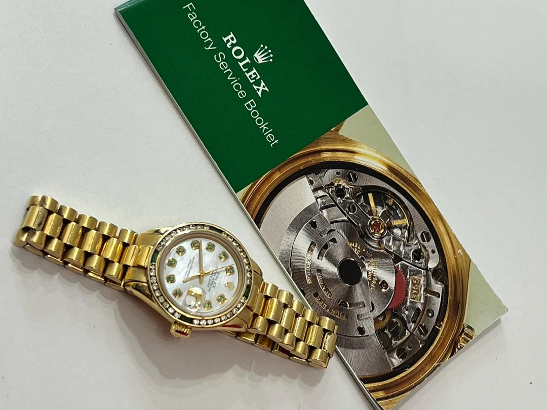 What sets this piece apart is the custom aftermarket bezel, meticulously set with brilliant diamonds and vibrant emeralds, creating an eye-catching contrast that elevates the watch from iconic to extraordinary. The luxurious mother-of-pearl dial adds natural iridescence, infusing every glance with depth, shimmer, and unique character.