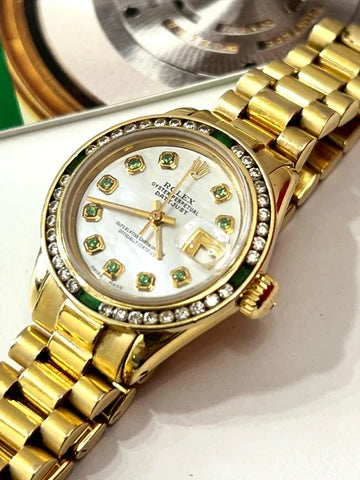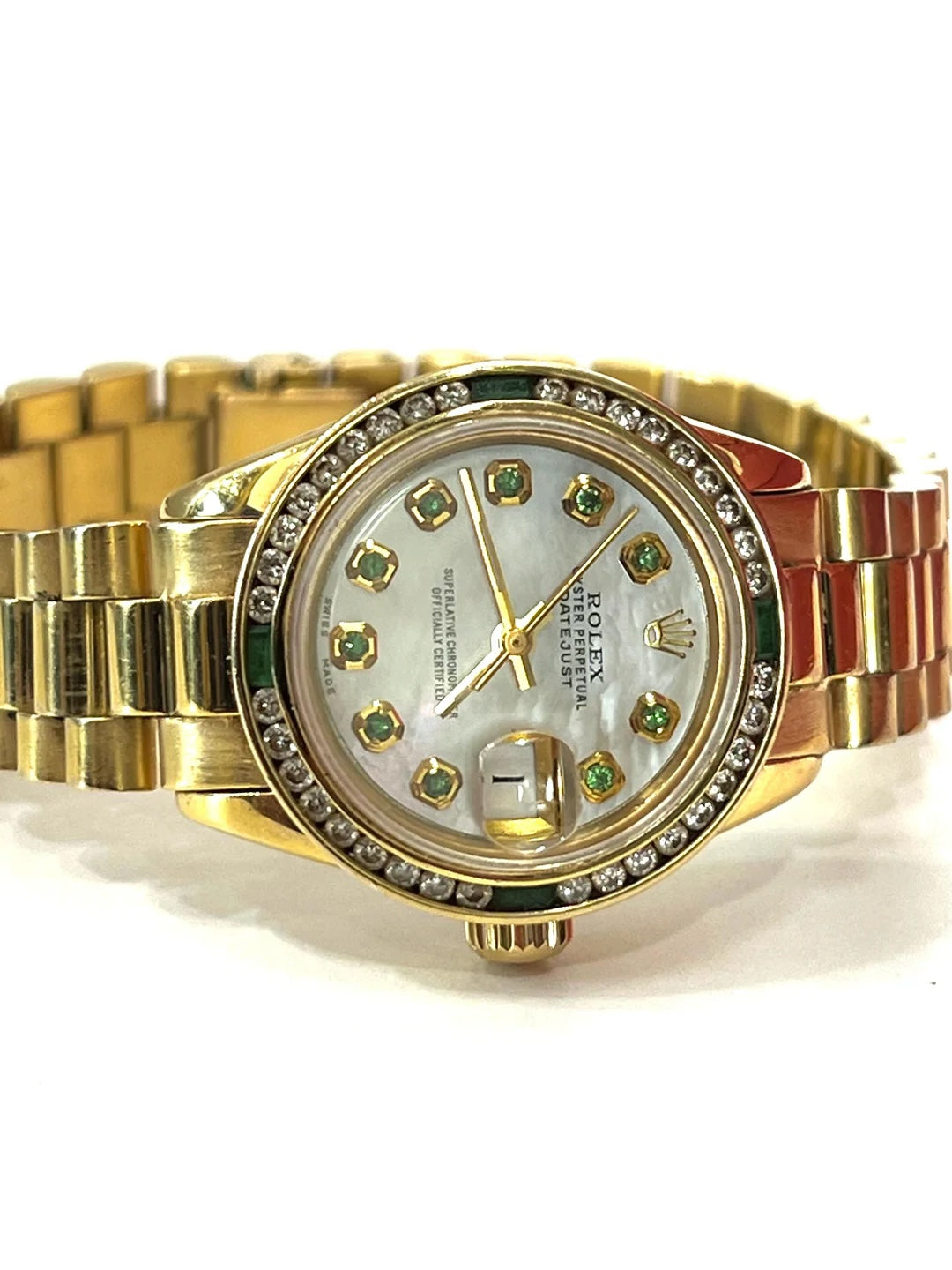 ROLEX PRESIDENTIAL 18K 28MM WITH CUSTOM AFTERMARKET DIAMOND AND EMERALD BEZEL MOP FACE