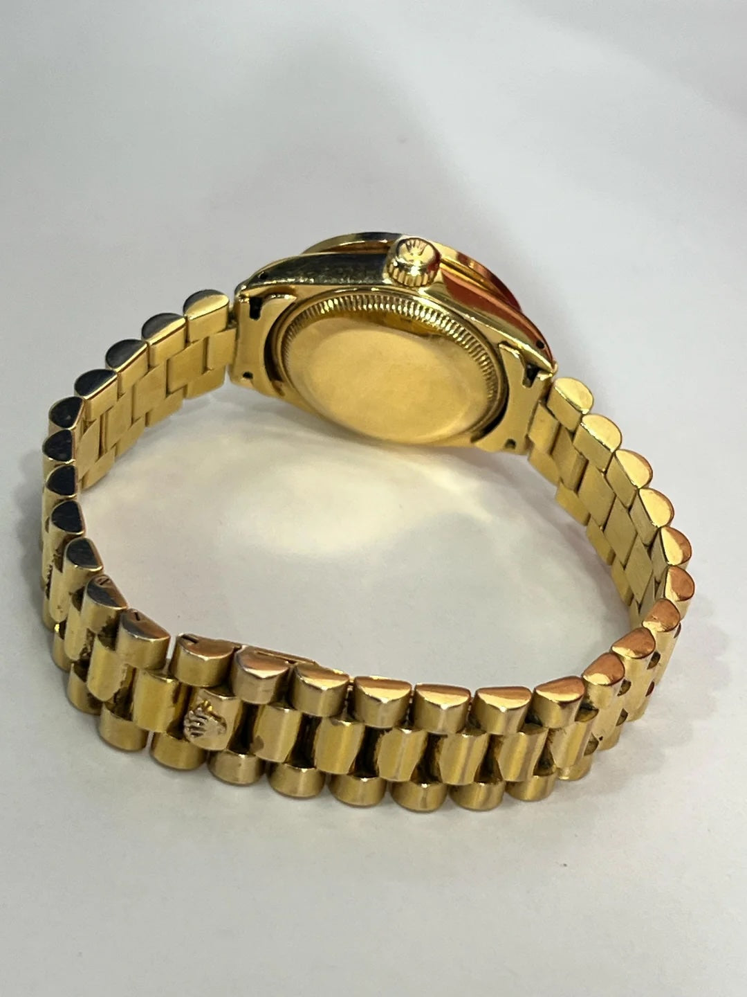 Exuding timeless prestige and bespoke glamour, this Rolex Presidential 18K 28mm is a stunning fusion of classic Rolex elegance and custom, high-impact artistry. Crafted in solid 18K gold, the iconic President bracelet delivers exceptional comfort and signature refinement, while the 28mm case offers a perfectly balanced presence on the wrist.
