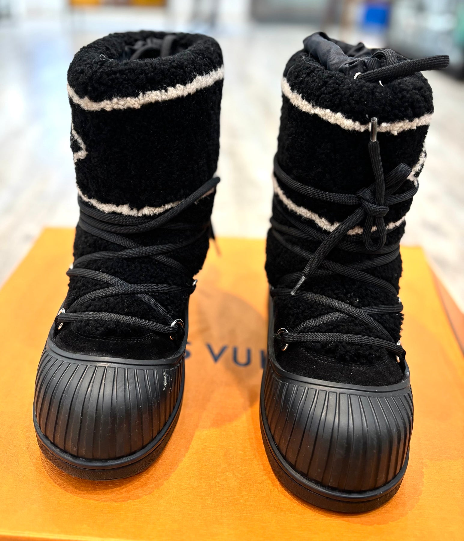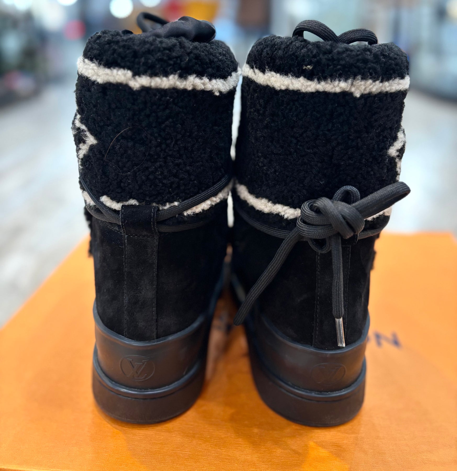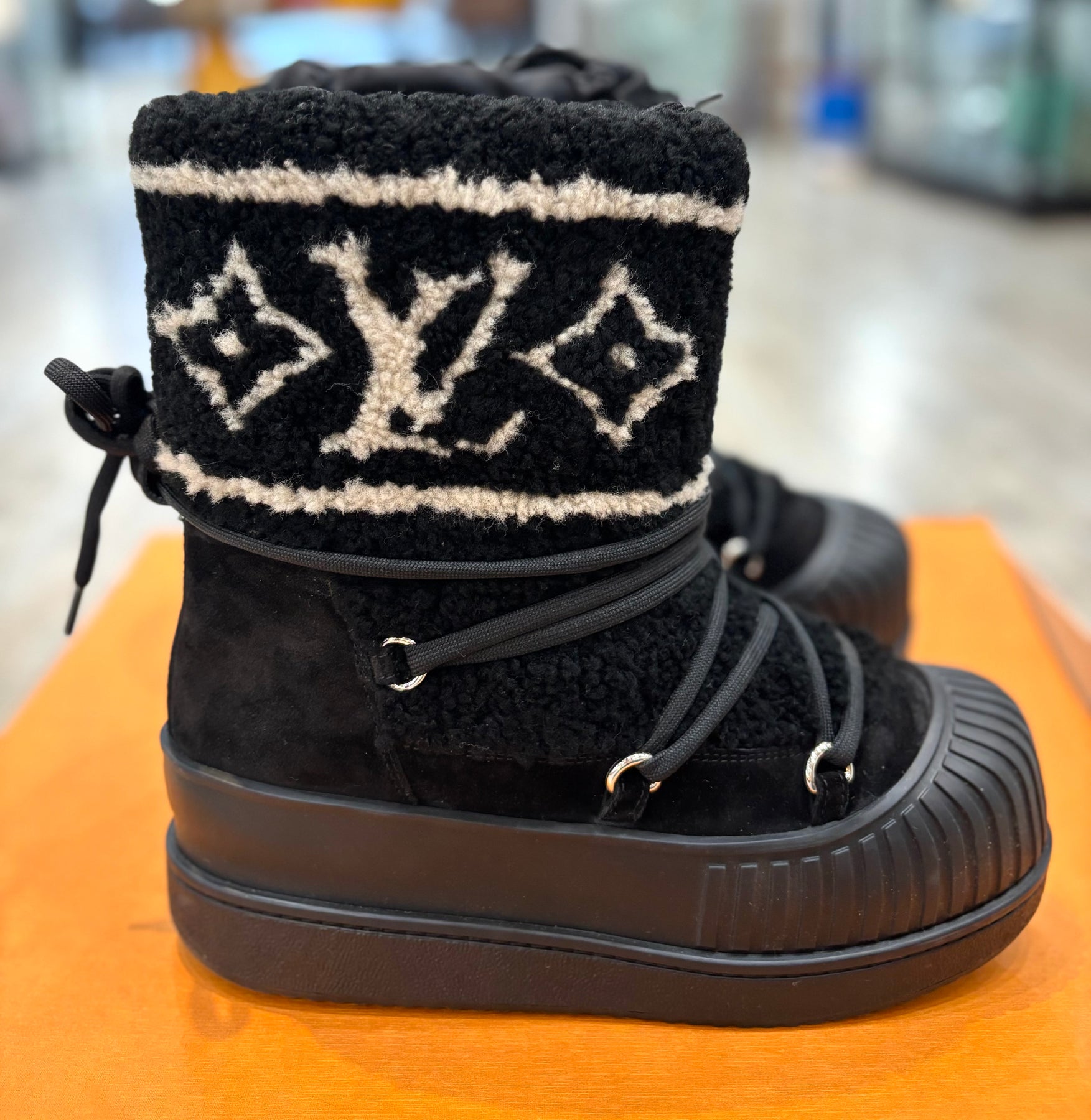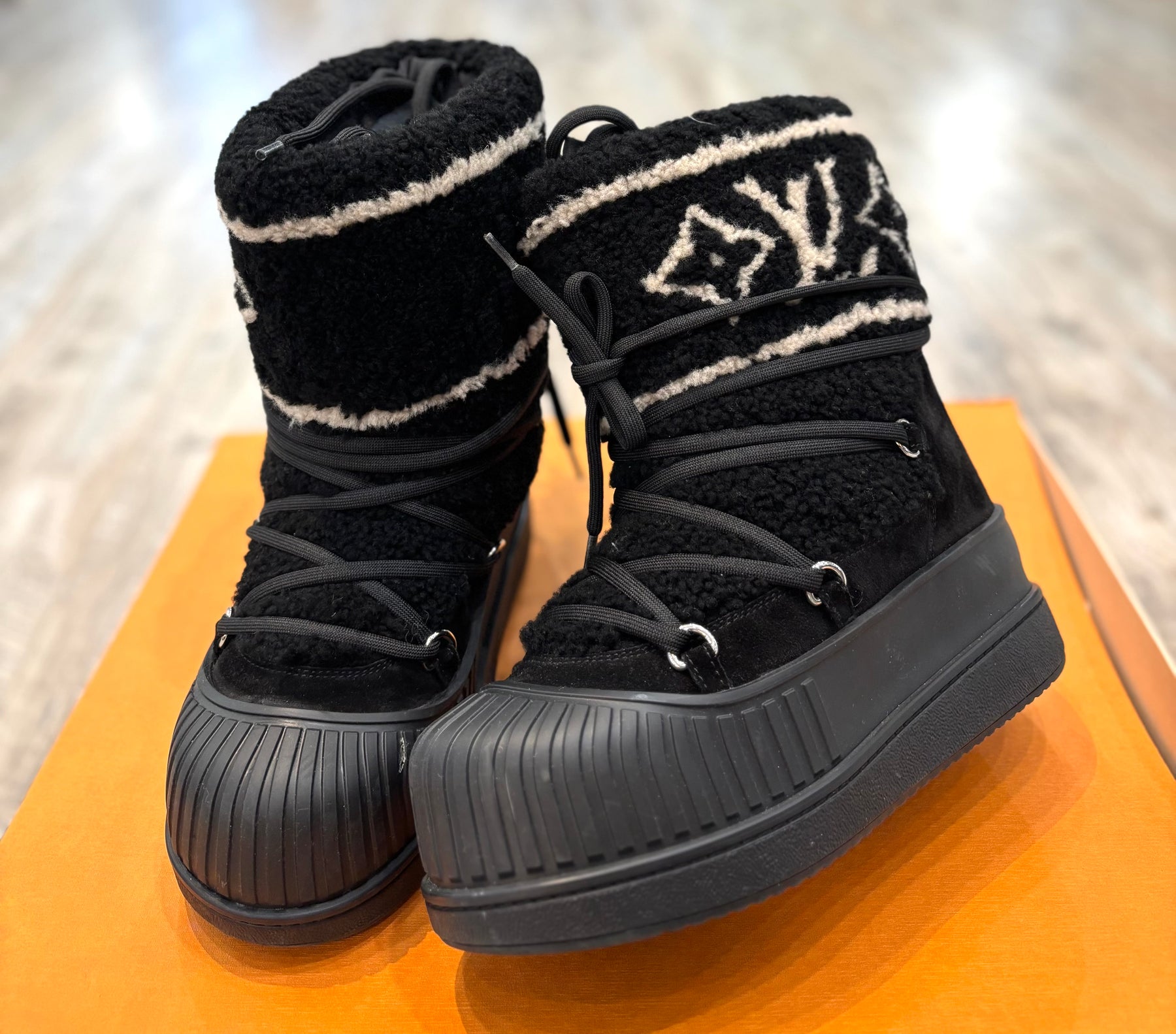 Perfect for cold-weather wear, the boots are lined with soft fleece for warmth and finished with a Louis Vuitton–engraved silvertone stud for a signature touch of elegance. Combining functionality and fashion, these chic boots bring luxury to après-ski style or everyday winter wear.