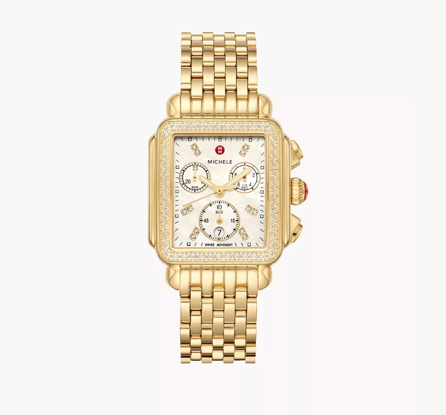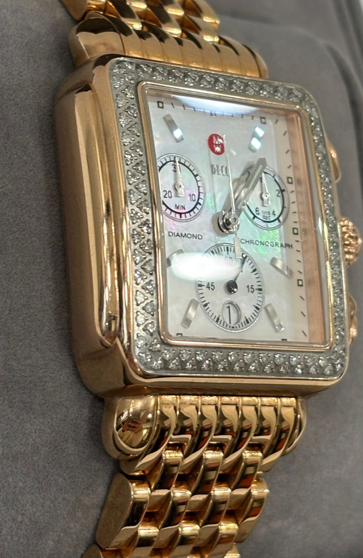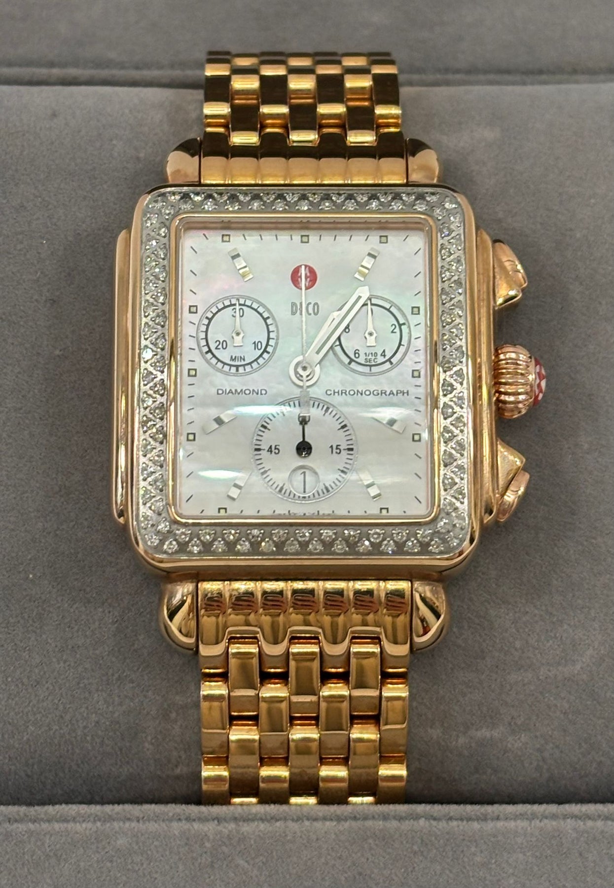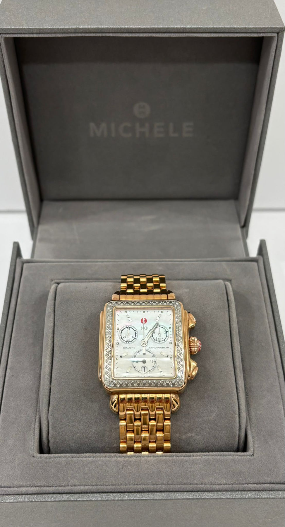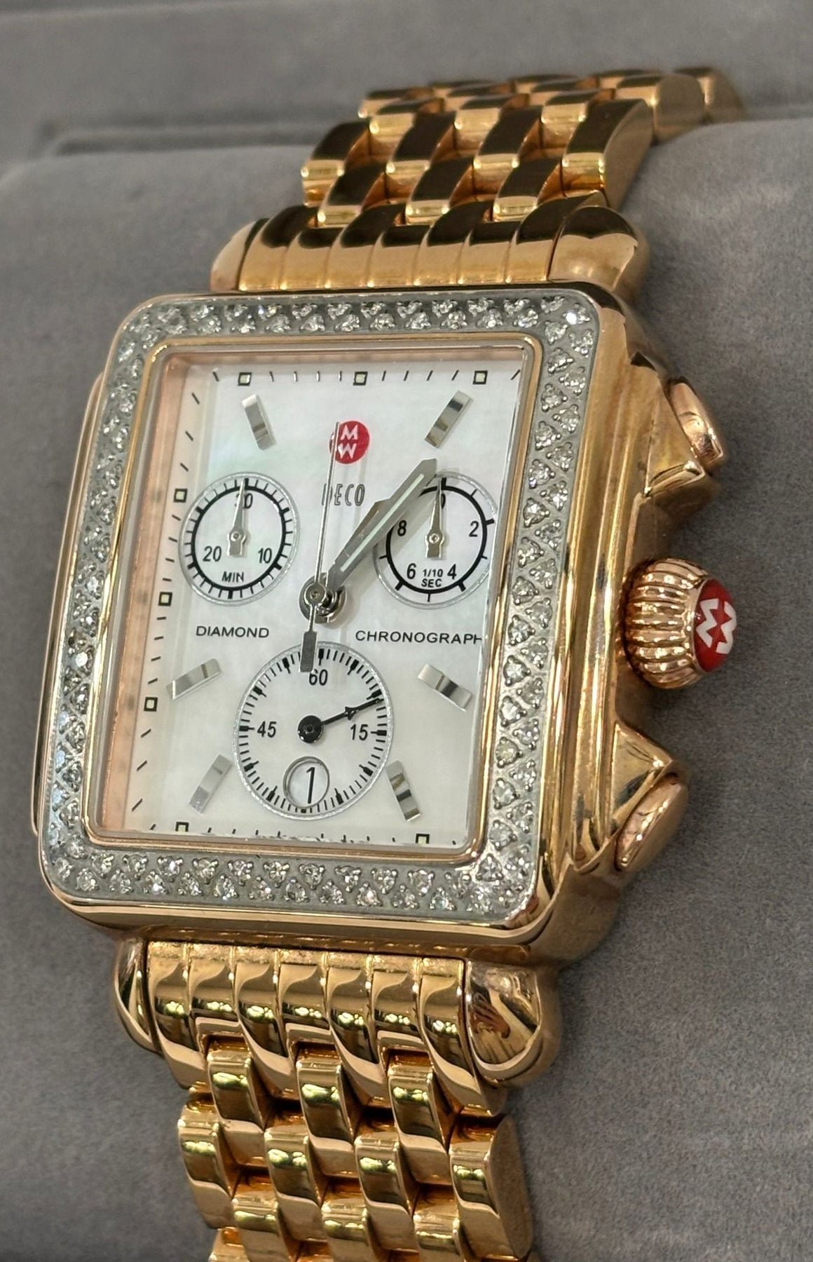 A lustrous Mother-of-pearl dial features three gold-accented sub dials and diamond hour markers, enhancing both beauty and functionality. The signature Michele red crown adds a distinctive finishing touch recognized by collectors worldwide.