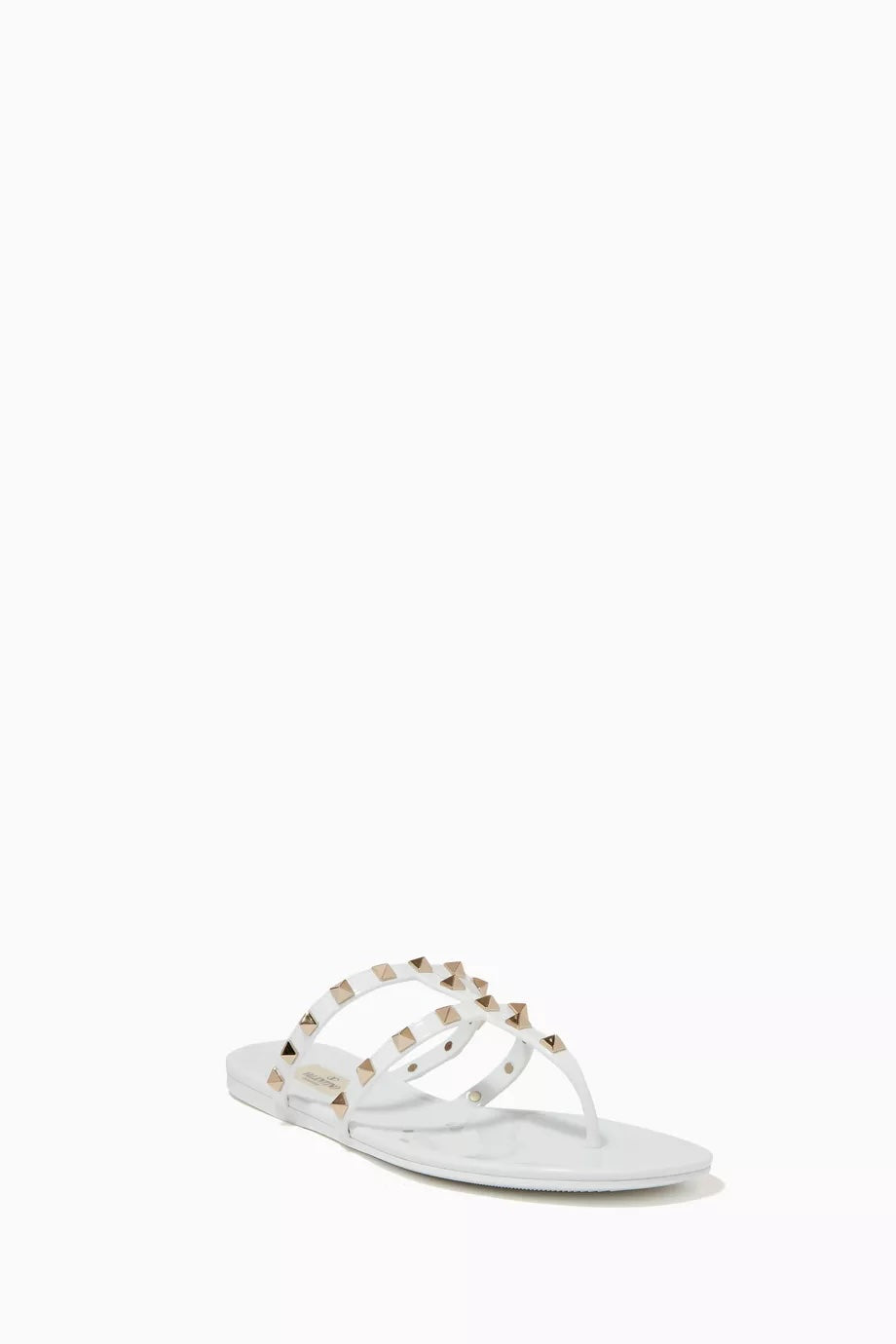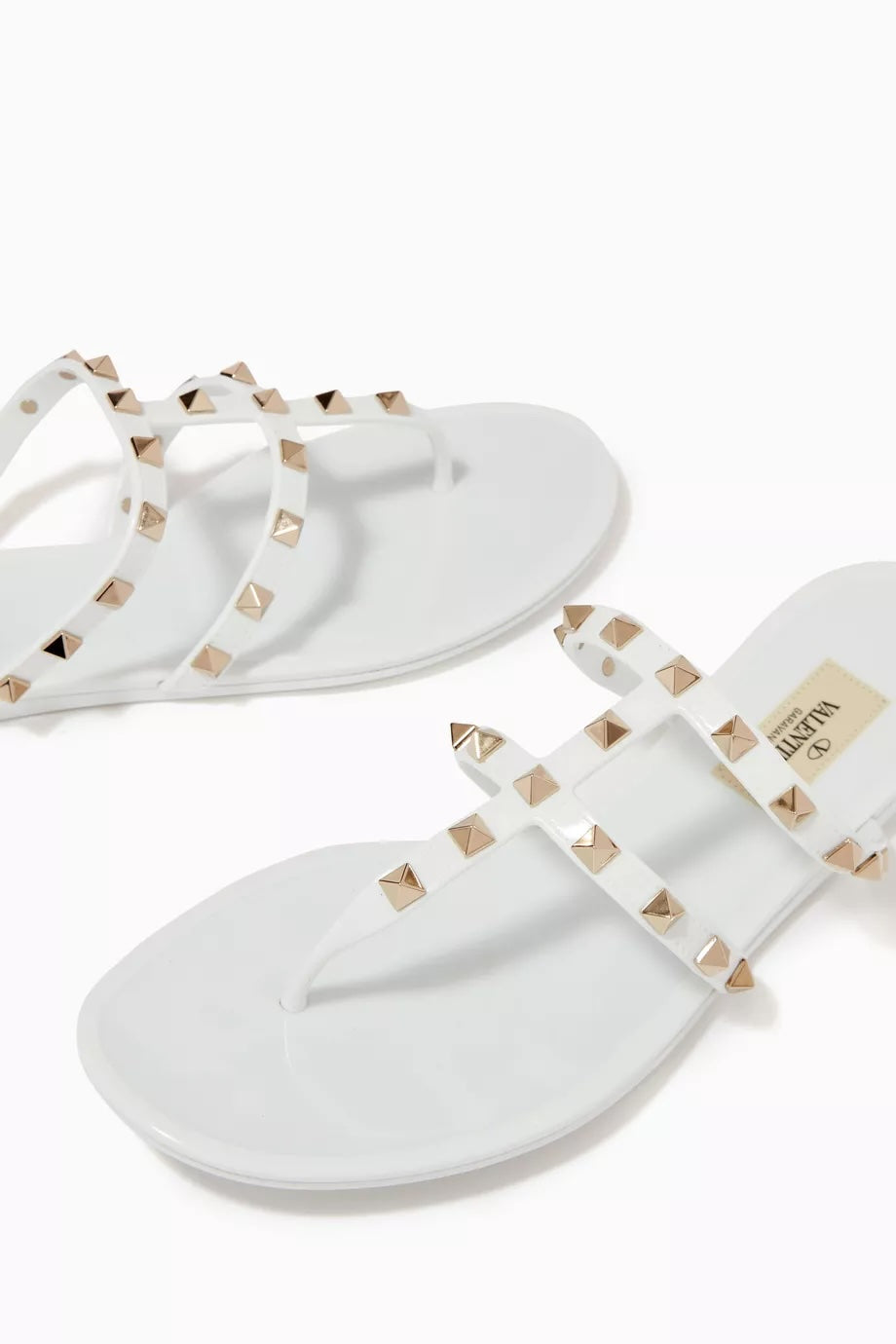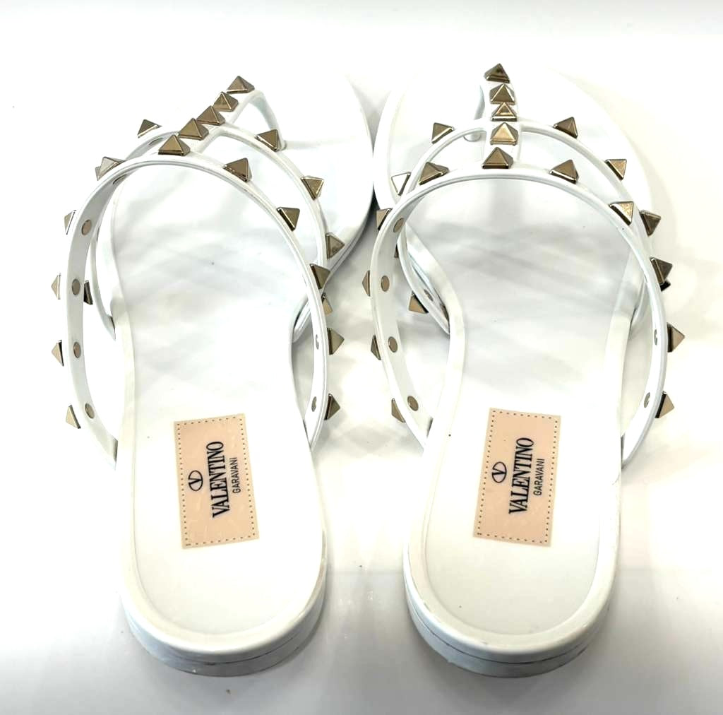 Effortlessly Chic and Perfect for warm-weather styling, These Valentino Rockstud jelly sandals feature a sleek thong silhouette crafted from glossy white PVC. The iconic pyramid studs add a bold signature edge, while the lightweight design ensures comfort and versatility. Ideal for casual days or elevated resort looks, this pair brings a modern, feminine finish to any outfit.