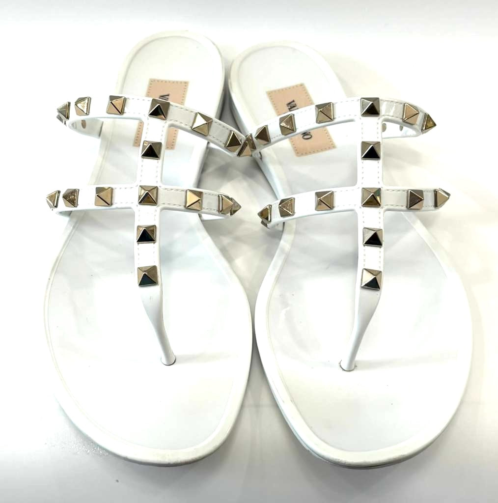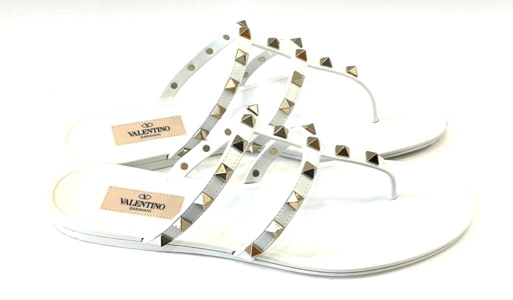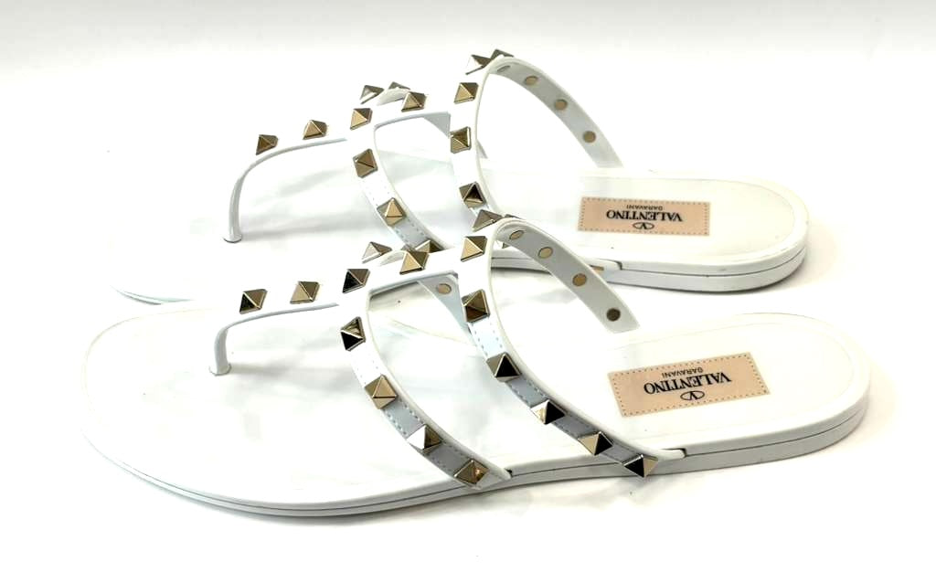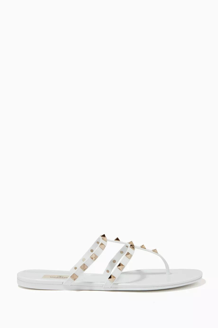 Effortlessly Chic and Perfect for warm-weather styling, These Valentino Rockstud jelly sandals feature a sleek thong silhouette crafted from glossy white PVC. The iconic pyramid studs add a bold signature edge, while the lightweight design ensures comfort and versatility. Ideal for casual days or elevated resort looks, this pair brings a modern, feminine finish to any outfit.