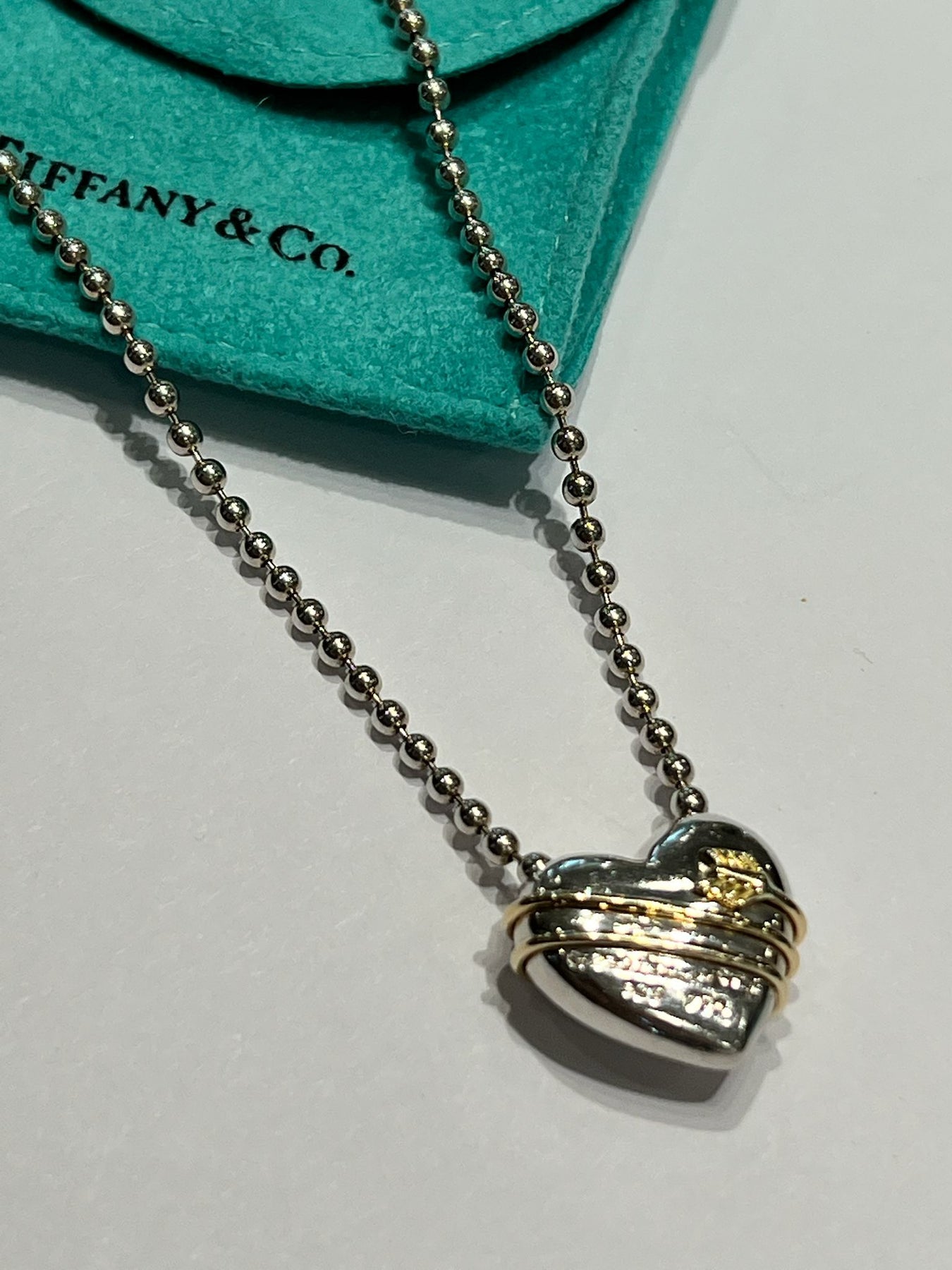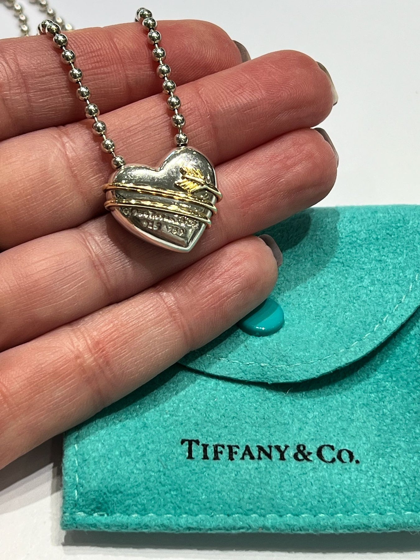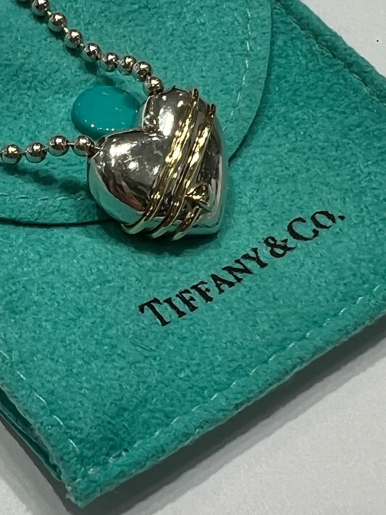 Celebrate timeless love and signature design with this authentic Tiffany & Co. heart pendant necklace, crafted in a striking combination of sterling silver and 18k yellow gold. The sculpted heart-shaped pendant features a bold, high-polish finish, elegantly wrapped in three 18k gold wire accents, creating a modern yet romantic aesthetic.
