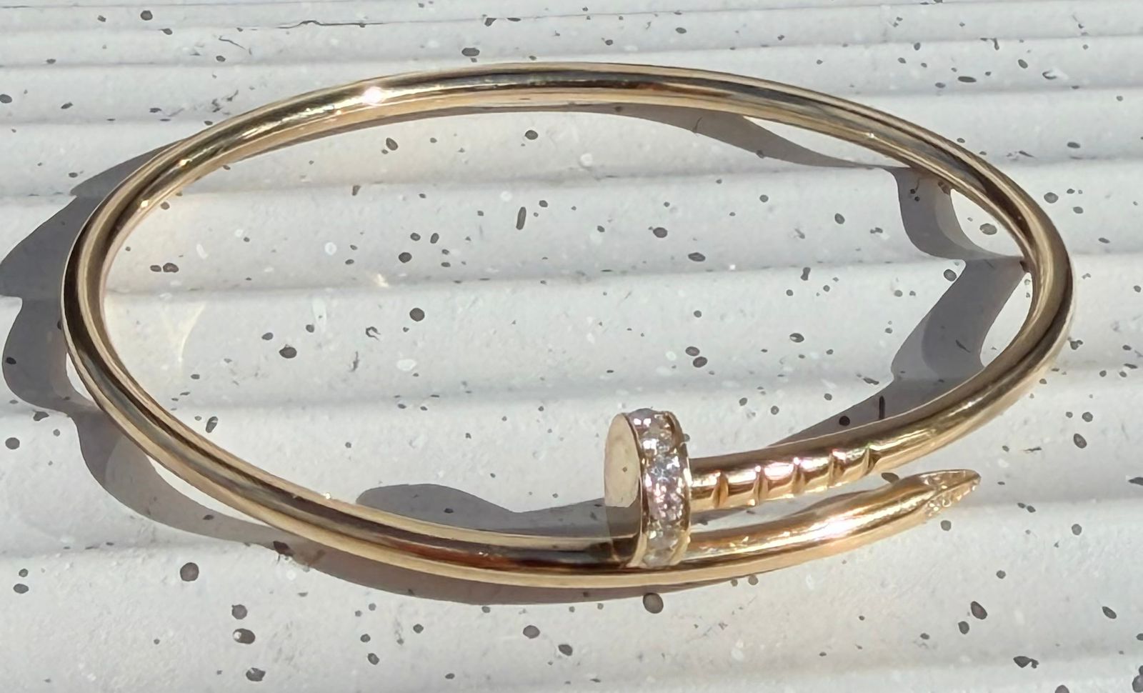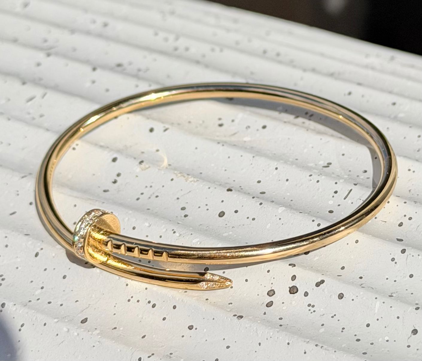 The Cartier Juste un Clou Yellow Gold Diamond Bracelet is an iconic fine jewelry piece that transforms an everyday nail into a bold luxury statement. Originally designed in the 1970s, the bracelet reflects Cartier’s signature blend of industrial inspiration and refined craftsmanship, making it one of the brand’s most recognizable designs.