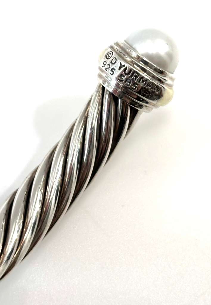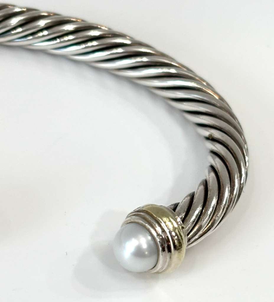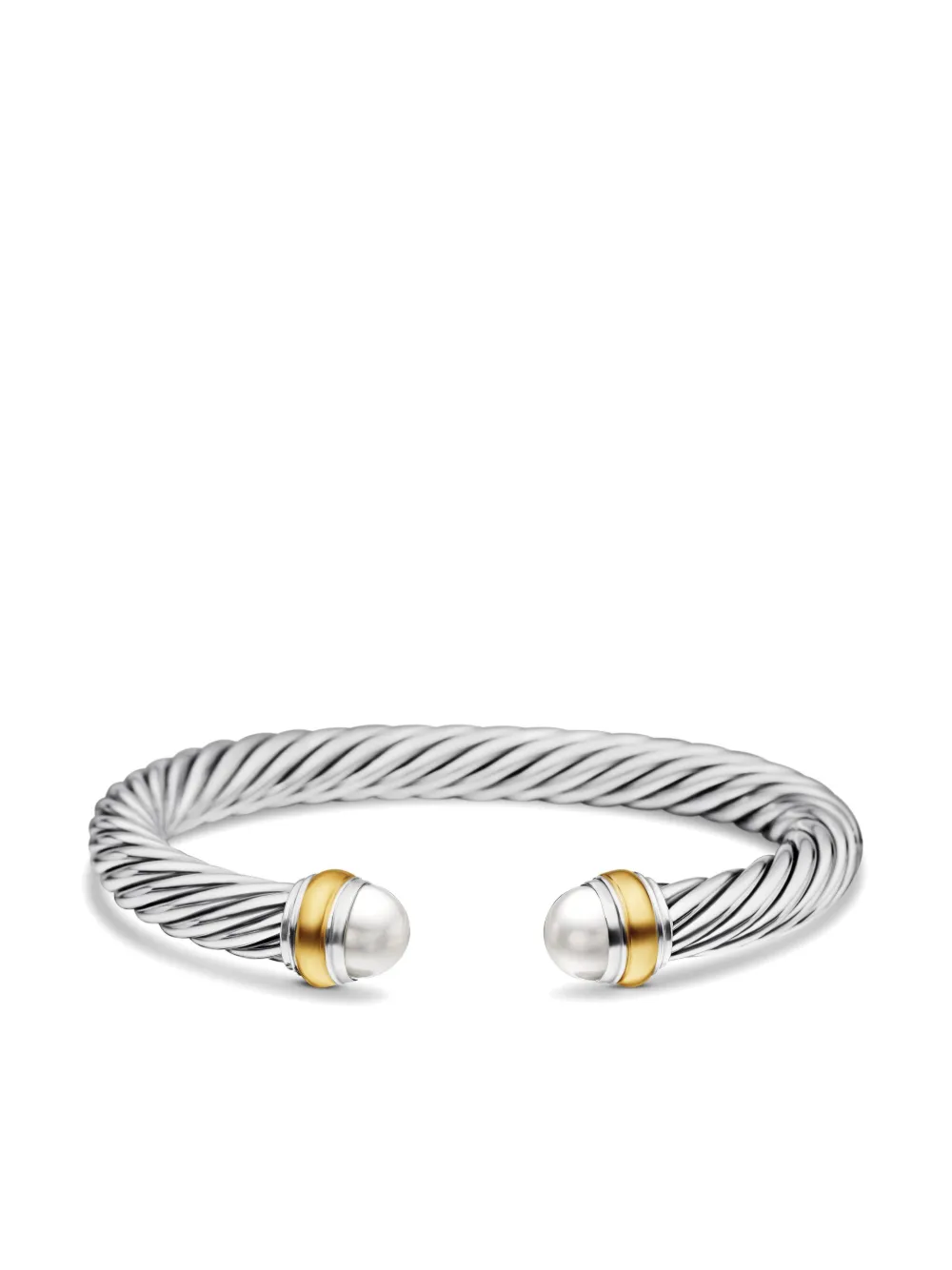 The bracelet is elegantly accented with 14K yellow gold end caps and luminous pearls, adding a sophisticated contrast to the polished silver cable design. The open cuff silhouette provides both comfort and effortless wear, making it an elegant piece suitable for everyday styling or layering with other David Yurman Cable Collection designs.