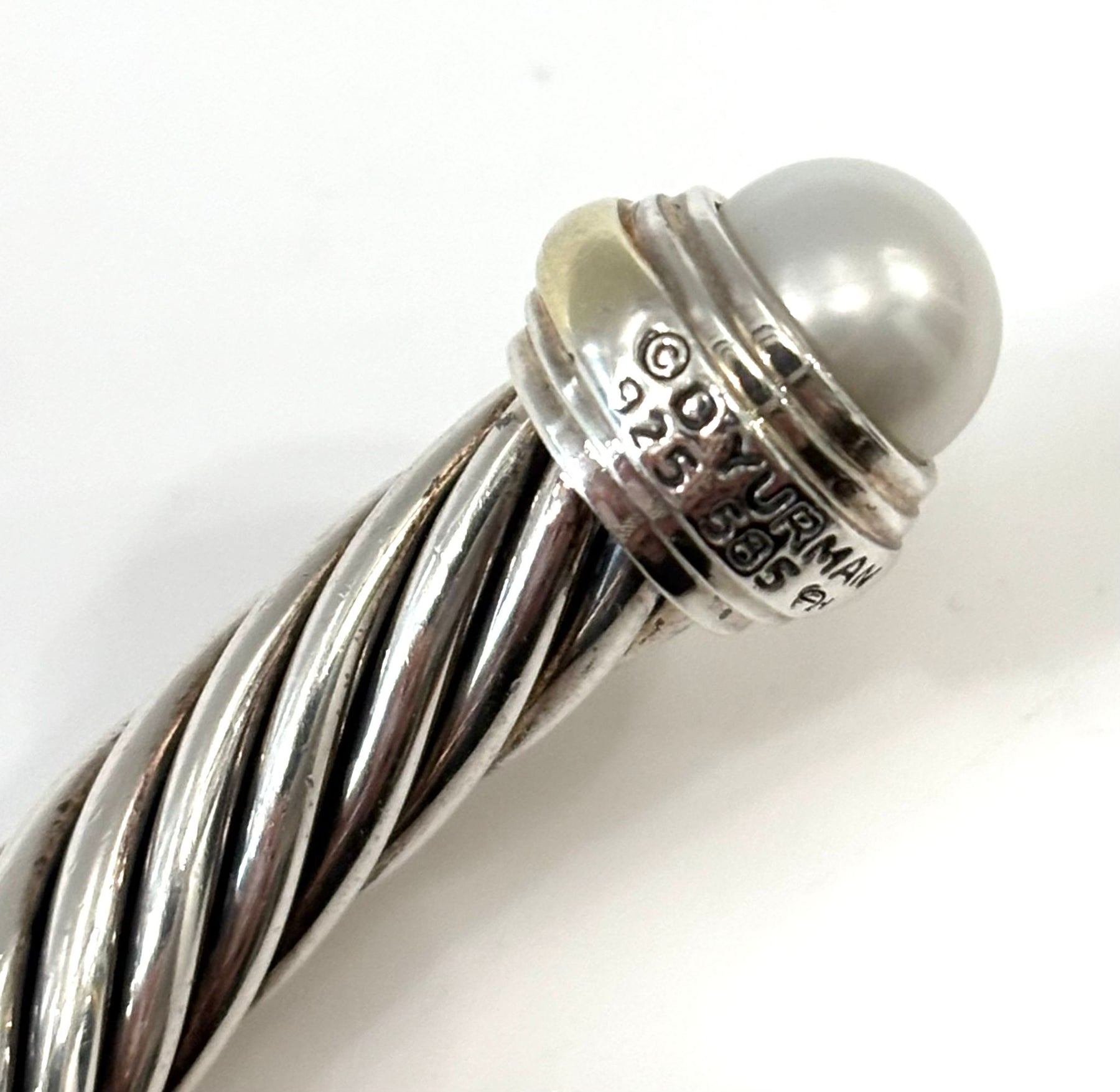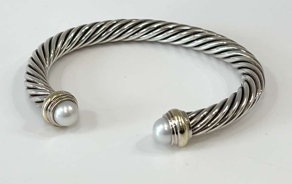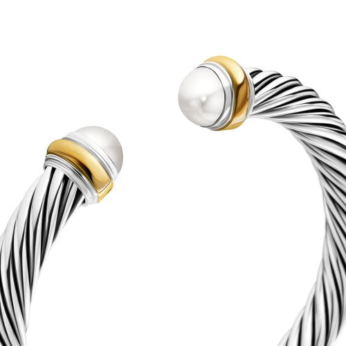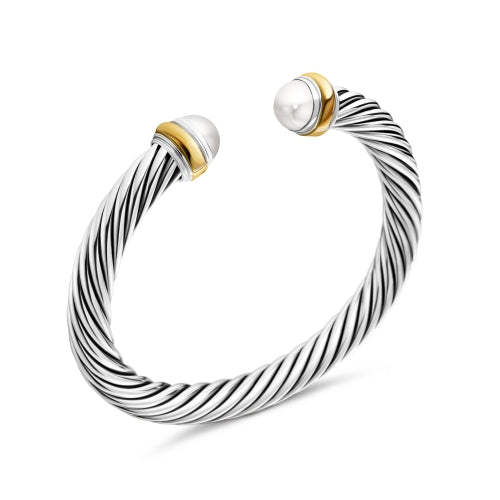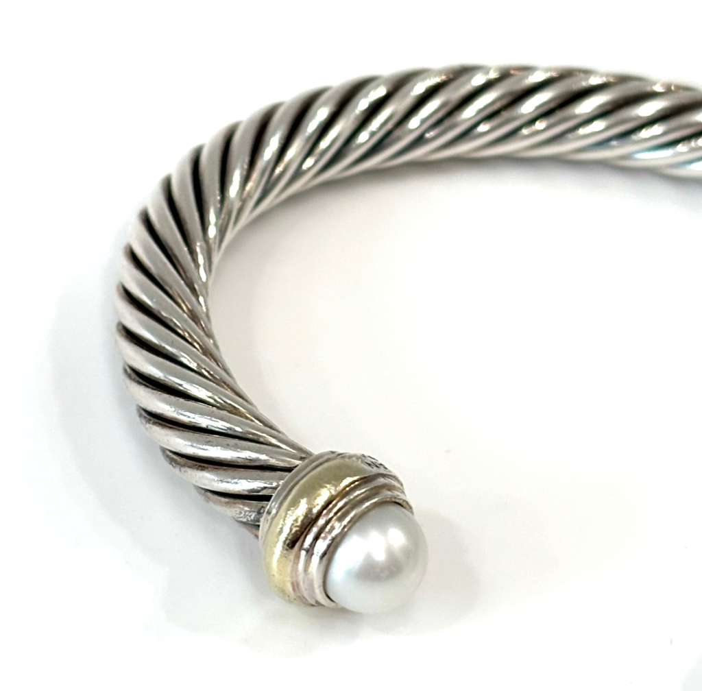 The bracelet is elegantly accented with 14K yellow gold end caps and luminous pearls, adding a sophisticated contrast to the polished silver cable design. The open cuff silhouette provides both comfort and effortless wear, making it an elegant piece suitable for everyday styling or layering with other David Yurman Cable Collection designs.
