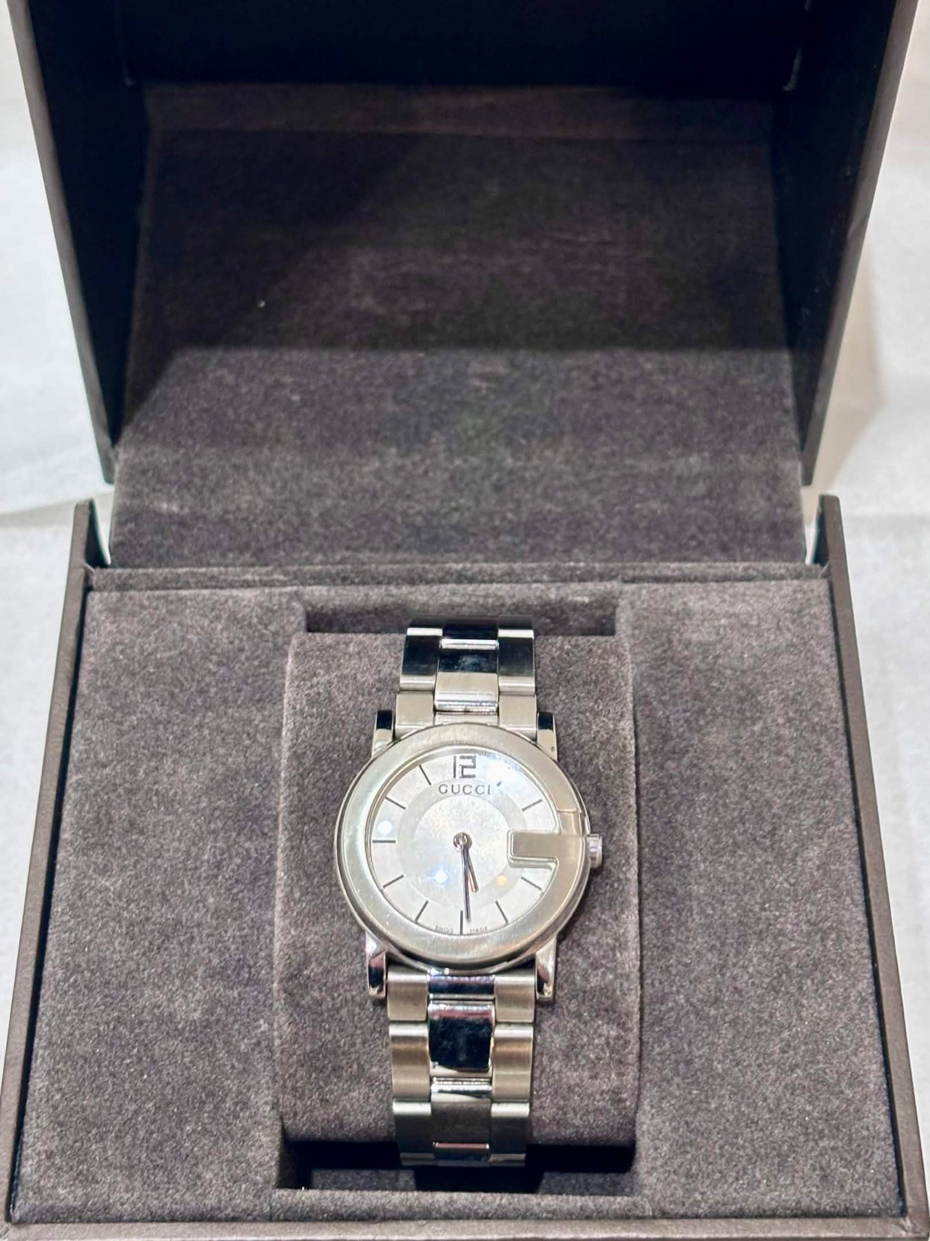 • Minimalist dial design with subtle Gucci branding
