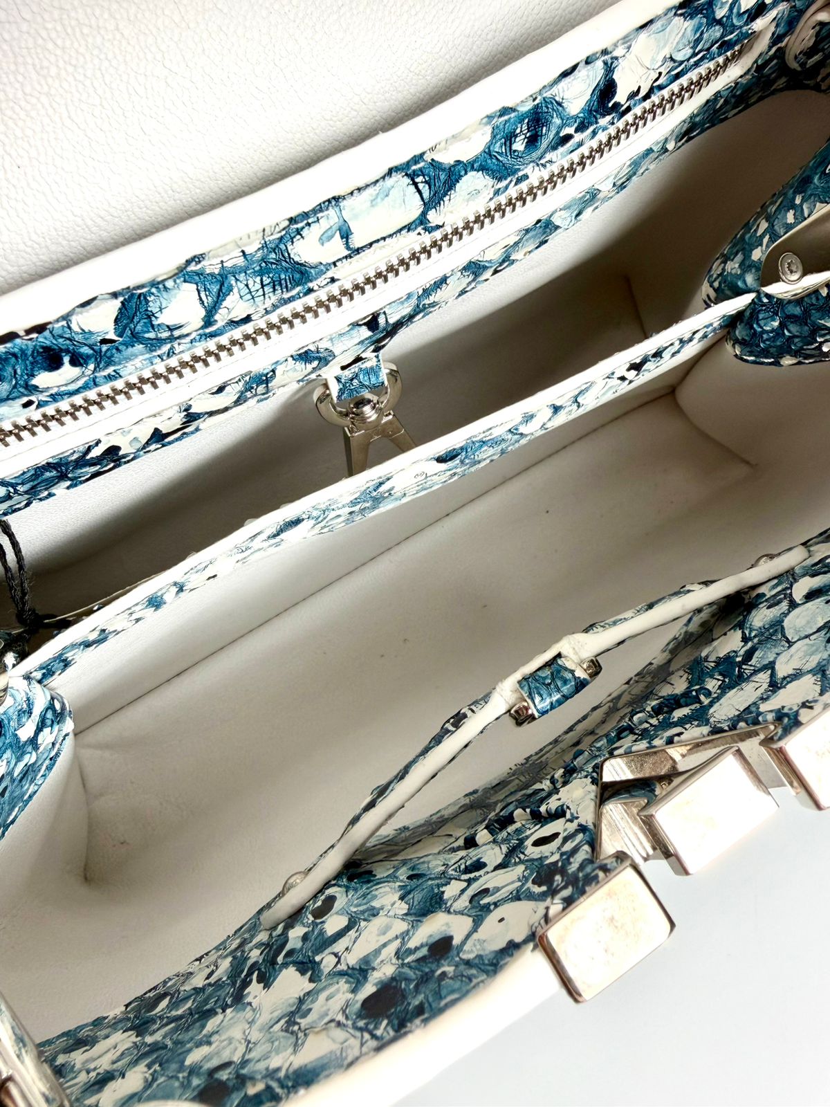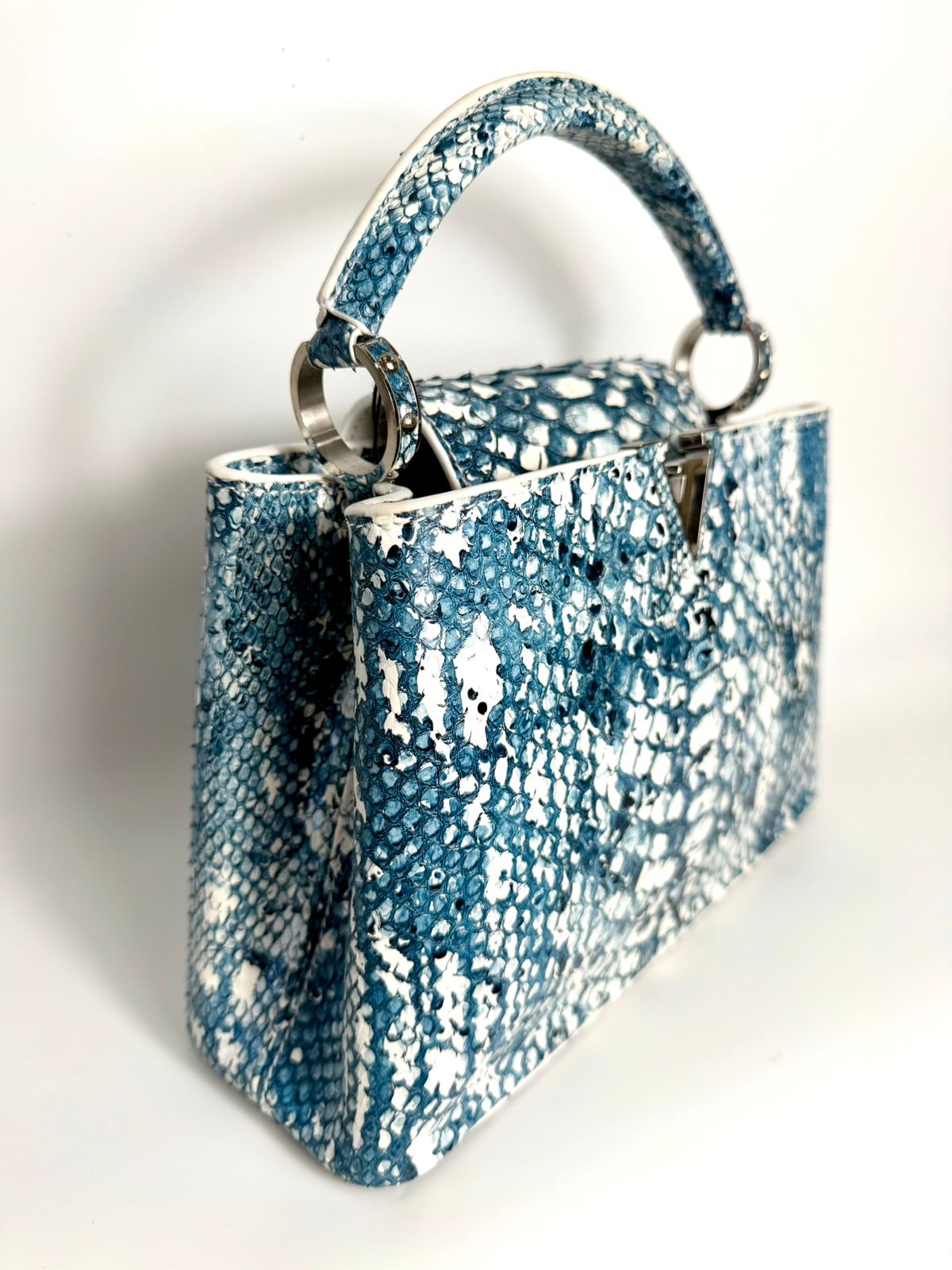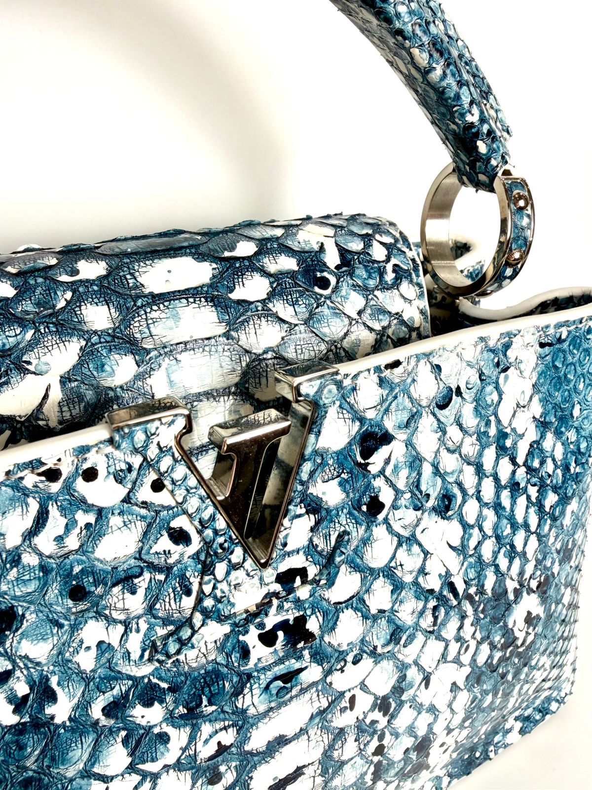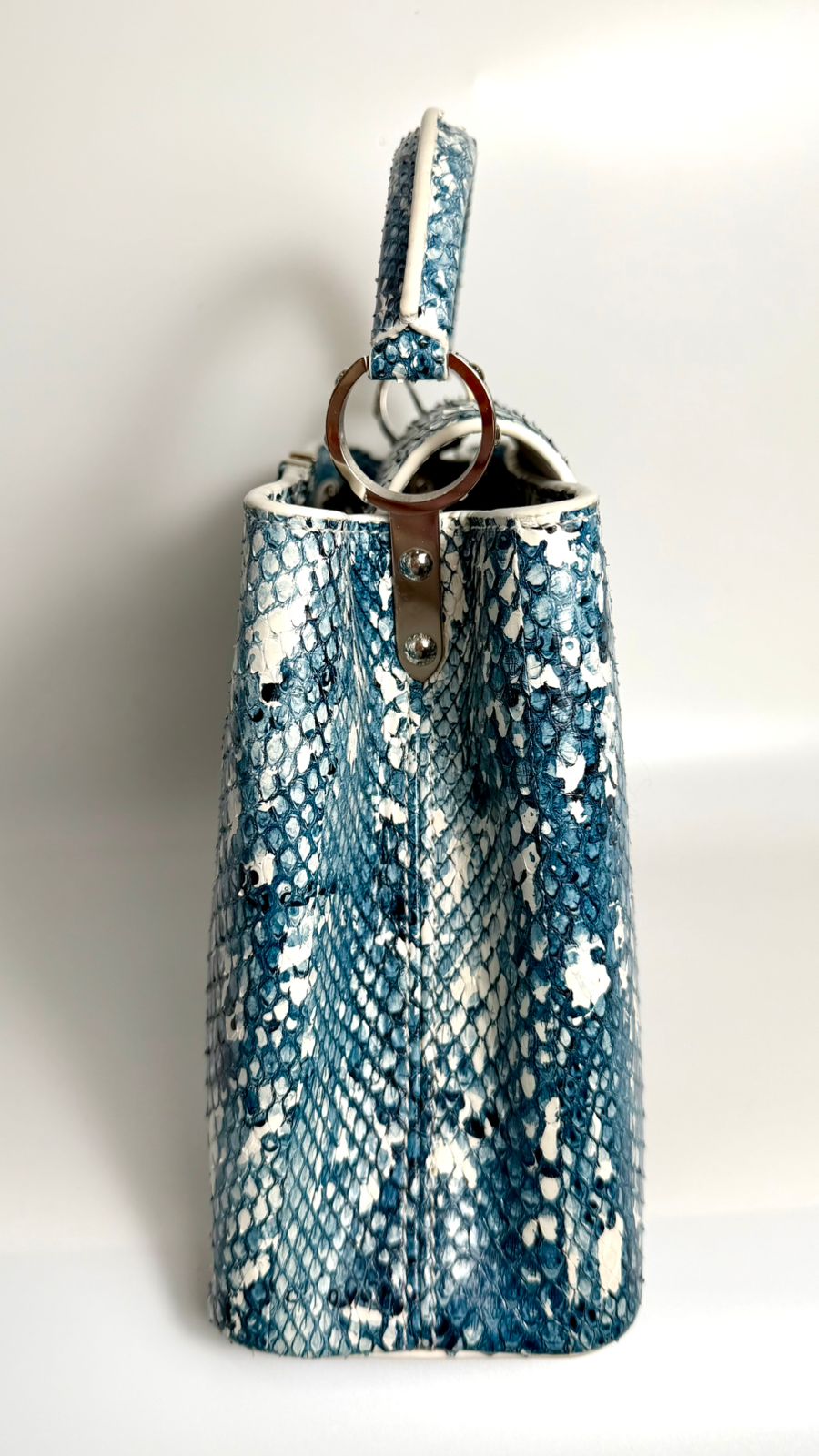 Exquisite and Sophisticated, the Louis Vuitton Capucines Mini Bag is crafted from luxurious Python snakeskin in beautiful blue tones, showcasing the Maison’s exceptional craftsmanship and attention to detail. This elegant handbag features a structured silhouette highlighted by the iconic LV logo hardware on the front flap.