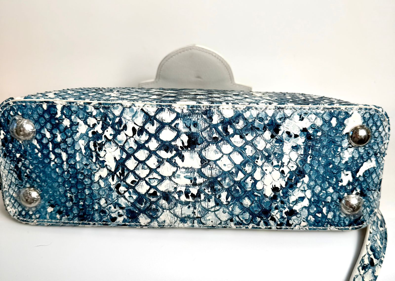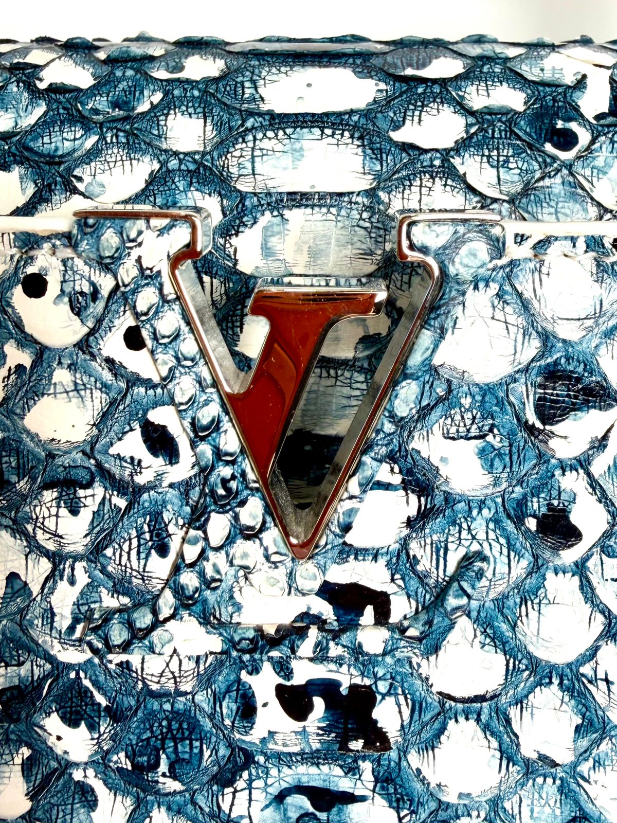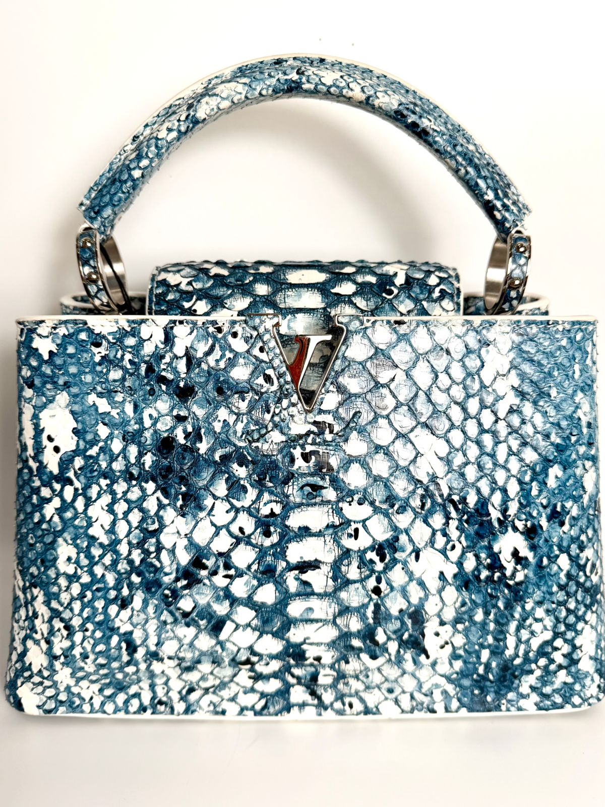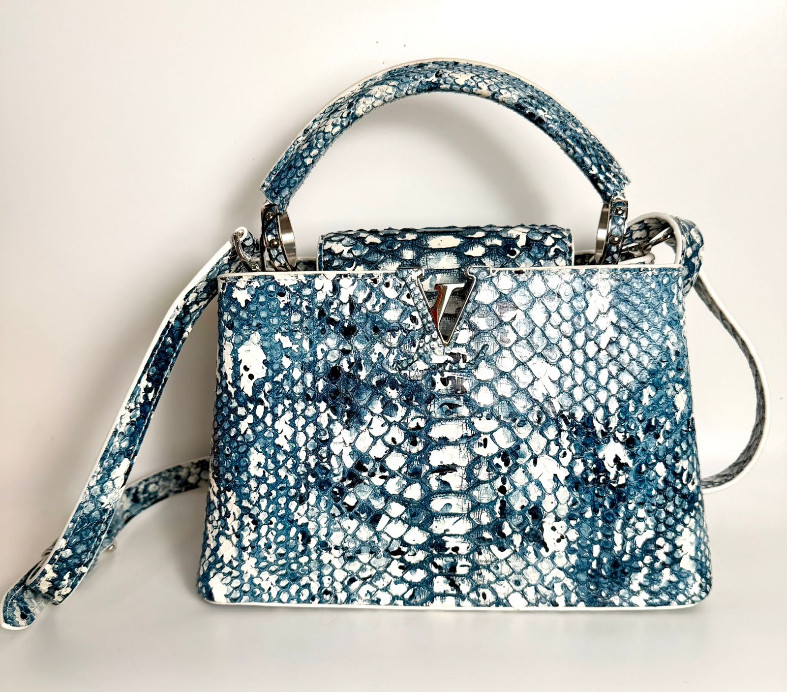 Exquisite and Sophisticated, the Louis Vuitton Capucines Mini Bag is crafted from luxurious Python snakeskin in beautiful blue tones, showcasing the Maison’s exceptional craftsmanship and attention to detail. This elegant handbag features a structured silhouette highlighted by the iconic LV logo hardware on the front flap.