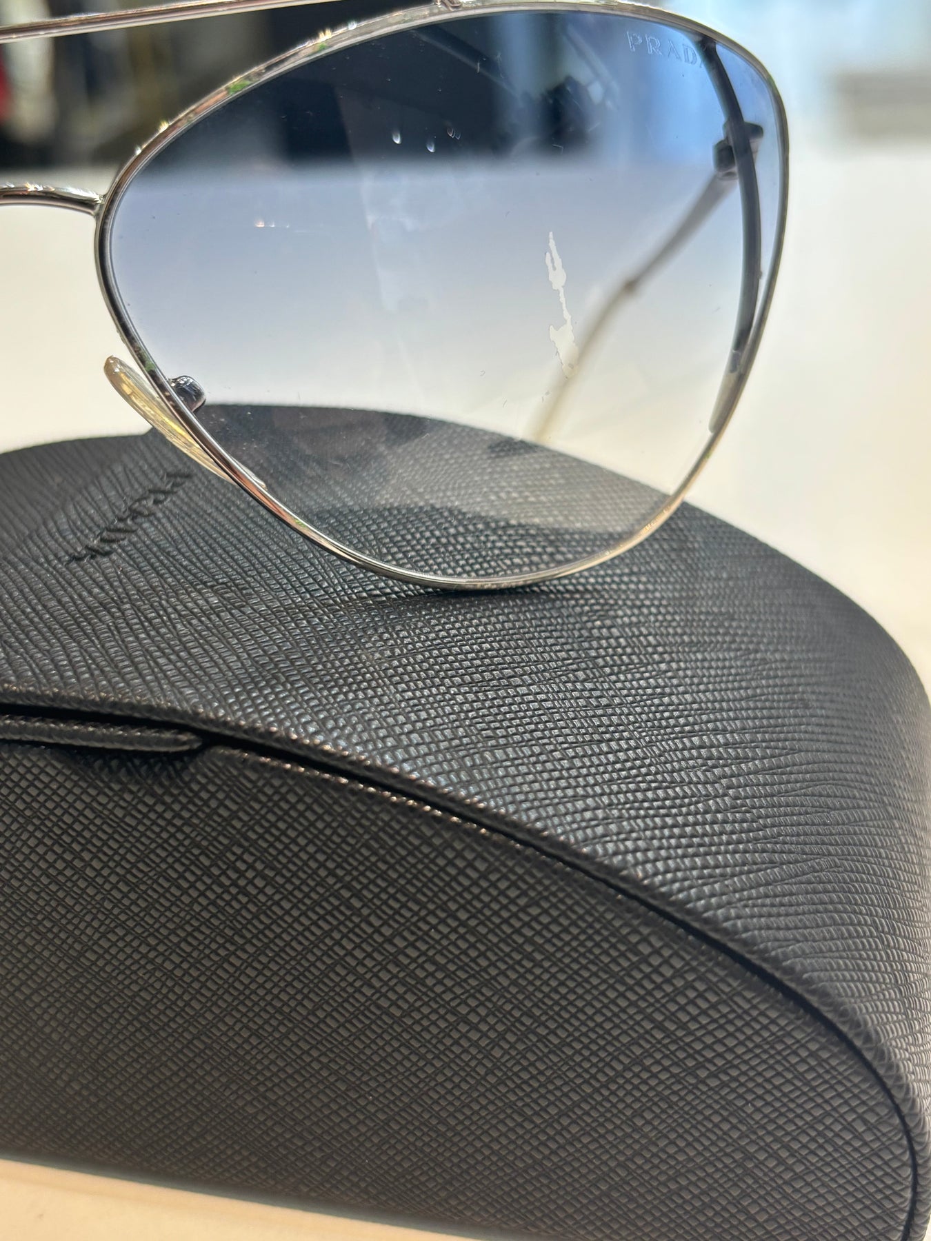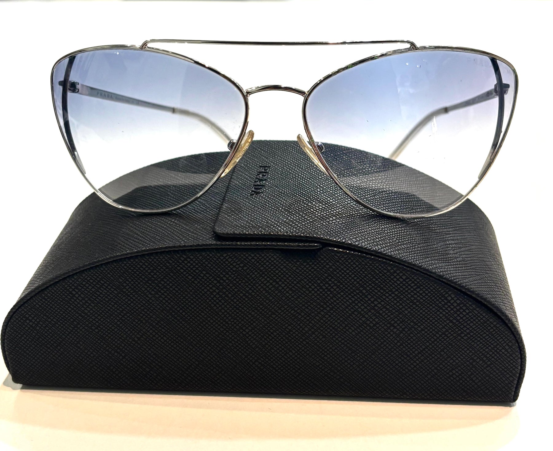 Sophisticated and fashion-forward, the Prada SPR65V Cat-Eye Sunglasses combine Timeless elegance with a modern architectural silhouette. Designed with a sleek Siver-tone metal frame, these sunglasses feature a refined cat-eye shape that adds a bold yet feminine touch to any look.