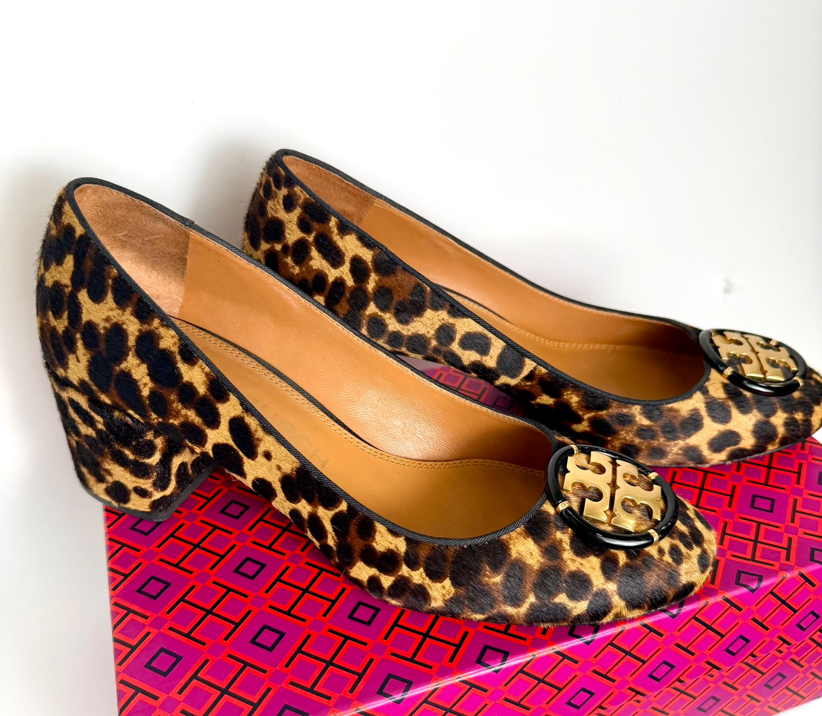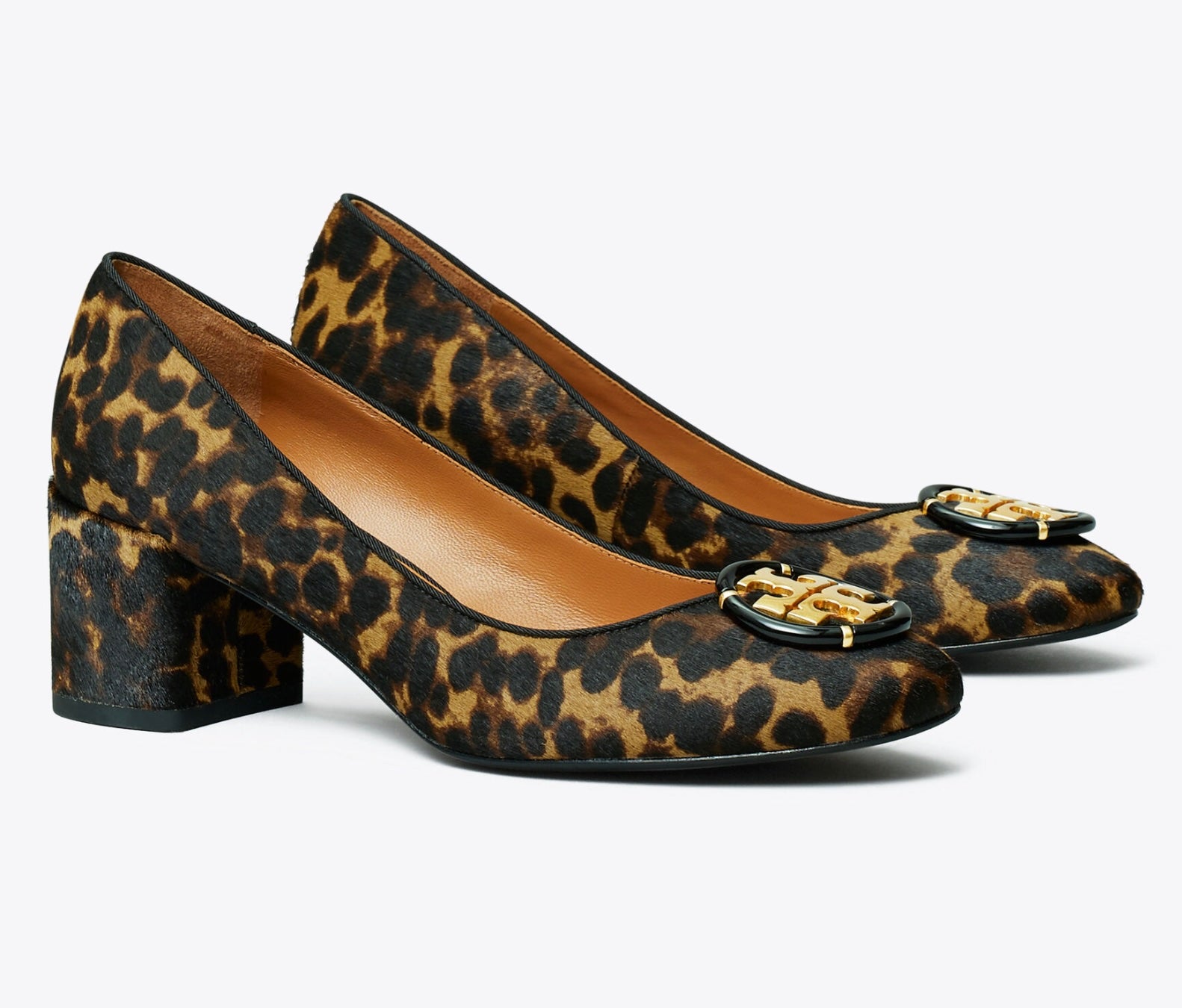 Tory Burch Multi-Logo Pumps Featuring a Classic leopard print in printed calf hair. Inspired by 1960s elegance, These pumps showcase a flattering almond toe, low block heel, and gold Double-T logo hardware at the toe—perfect for both daytime and evening wear.