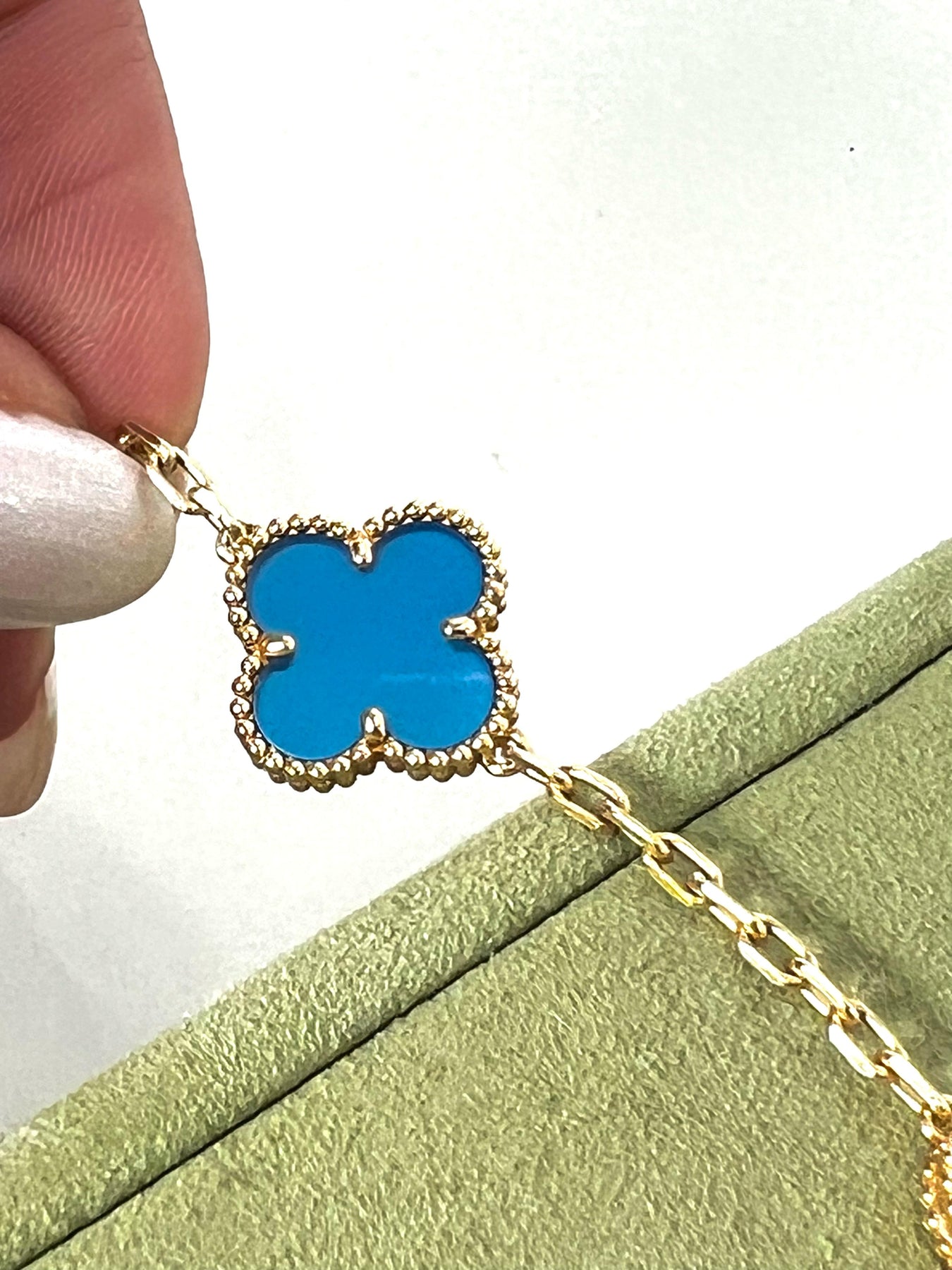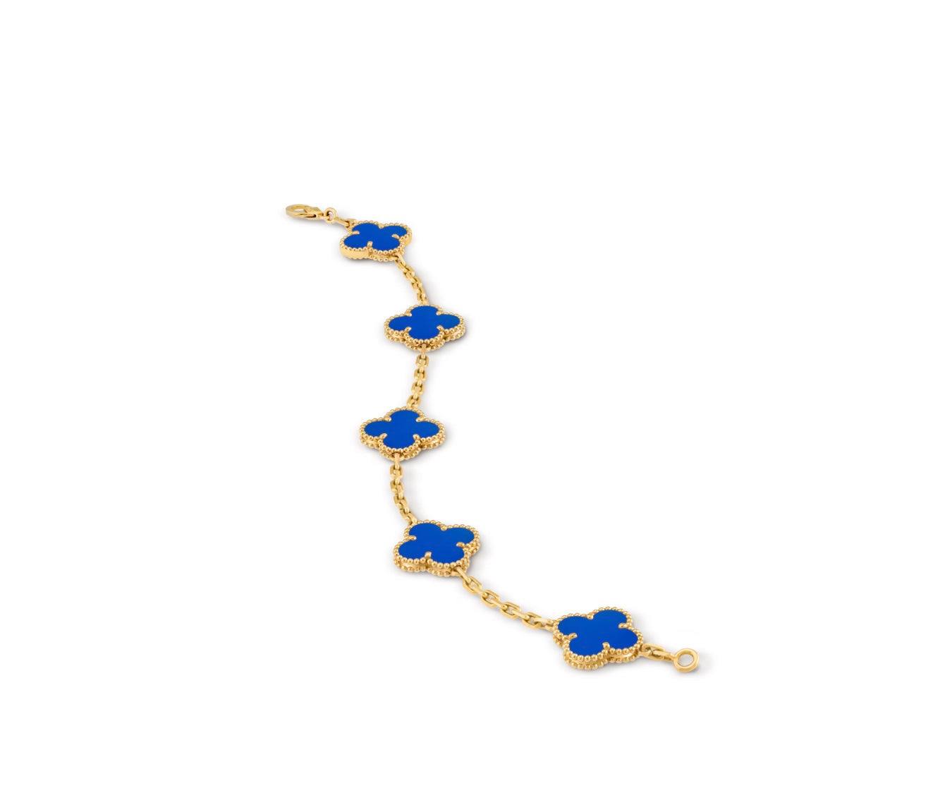 A Timeless symbol of luck and refinement, the Van Cleef & Arpels Alhambra Bracelet is expertly crafted in luminous 18K Yellow Gold and adorned with Five Radiant Blue Agate motifs. Each stone is naturally unique, framed by the Maison’s iconic beaded gold border—a signature of the Vintage Alhambra collection since its debut in 1968.