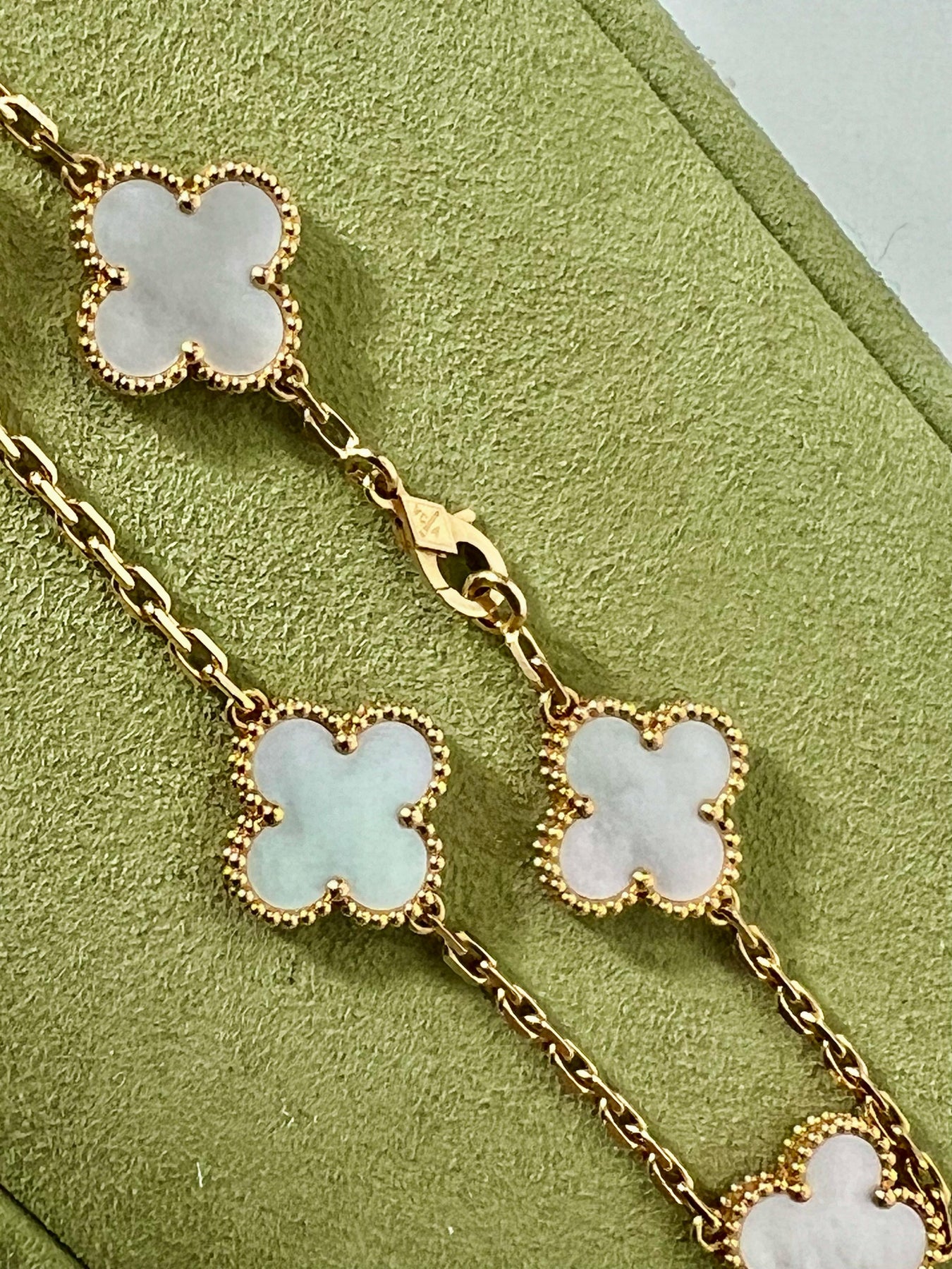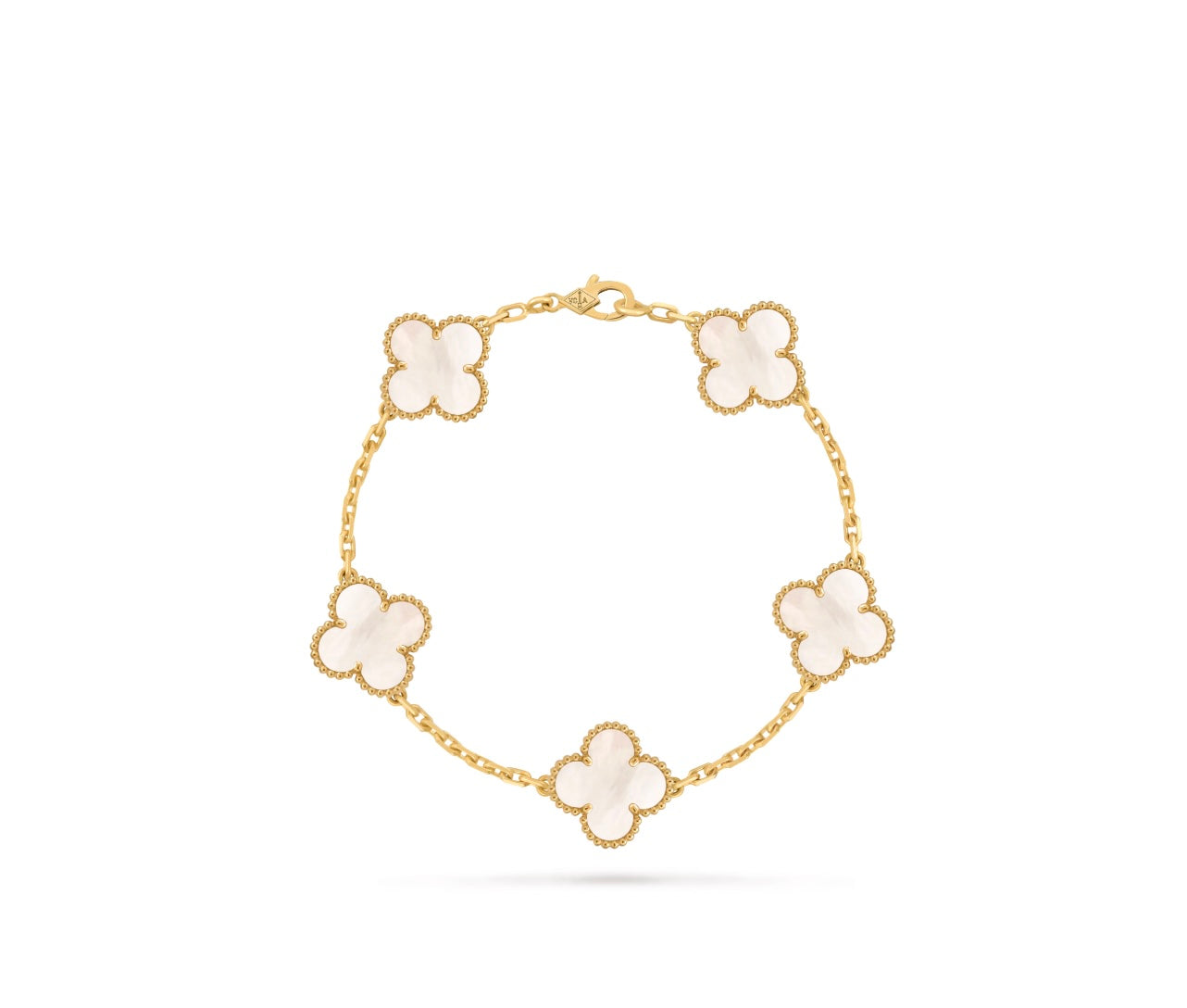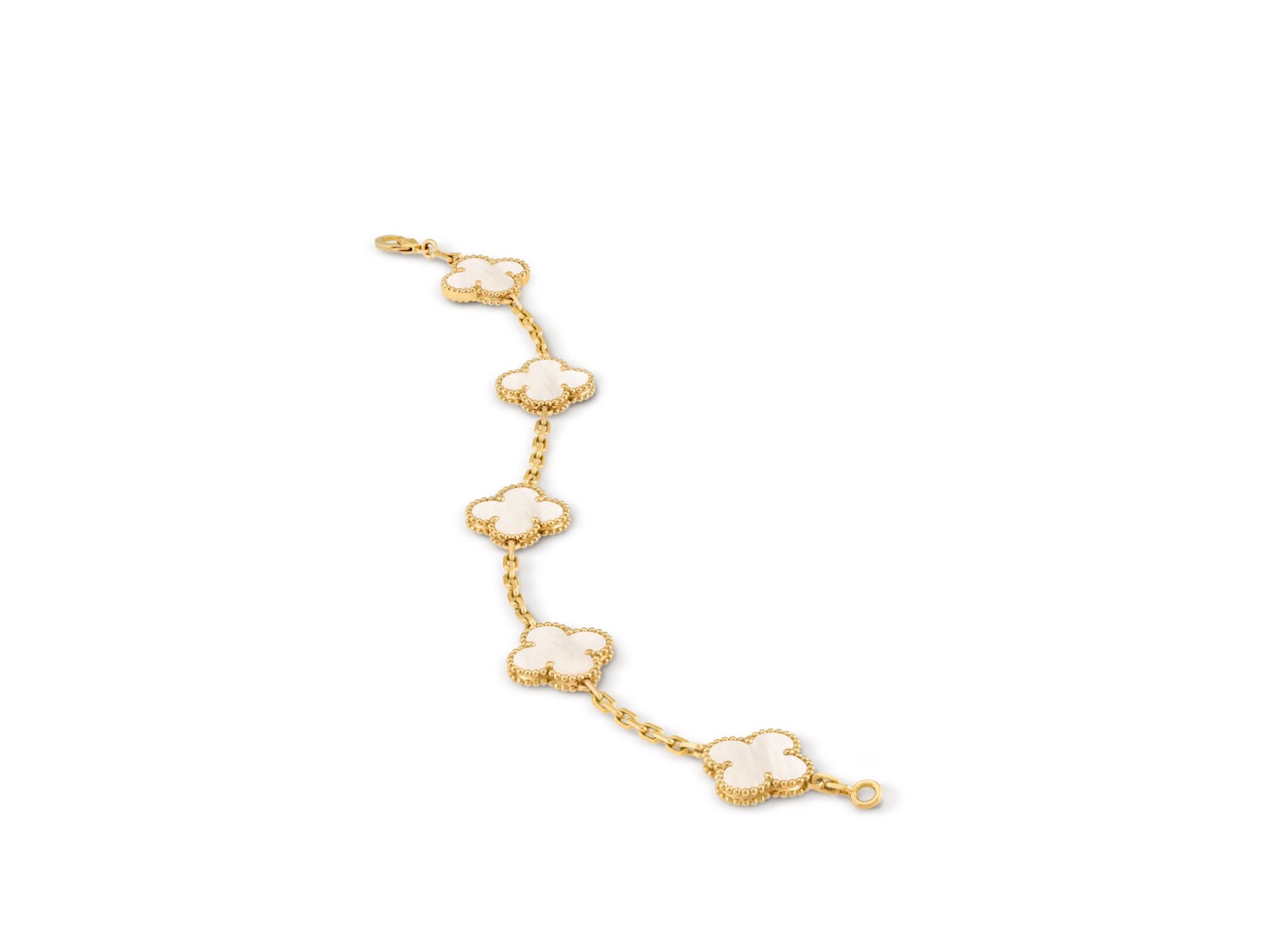 A Quintessential icon of the Maison, the Vintage Alhambra® Collection—first introduced in 1968—embodies timeless elegance and the enduring symbol of luck. This exquisite bracelet features five signature clover motifs crafted in luminous white mother-of-pearl, each framed by the distinctive beaded 18K yellow gold border synonymous with Van Cleef & Arpels refinement.