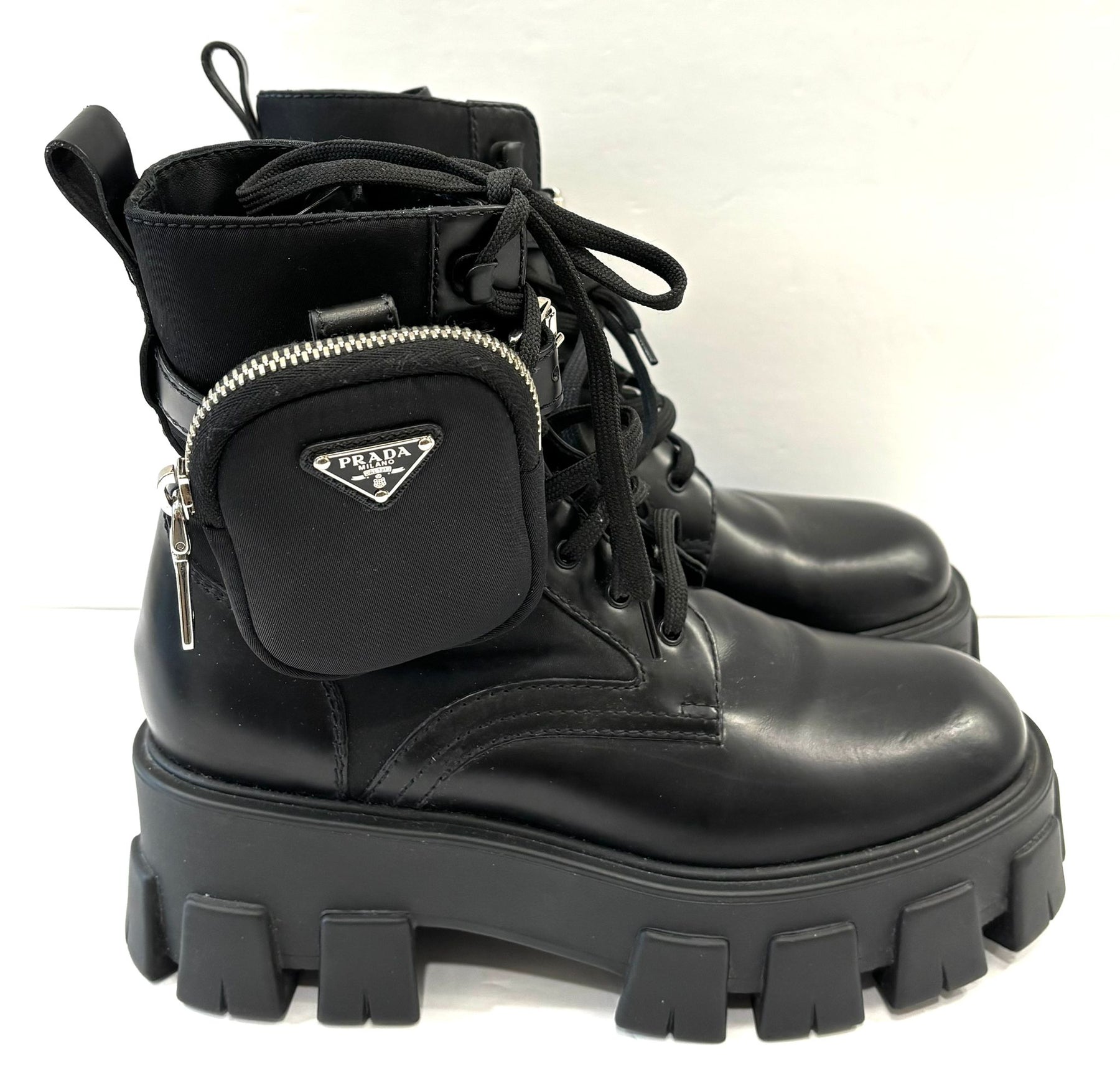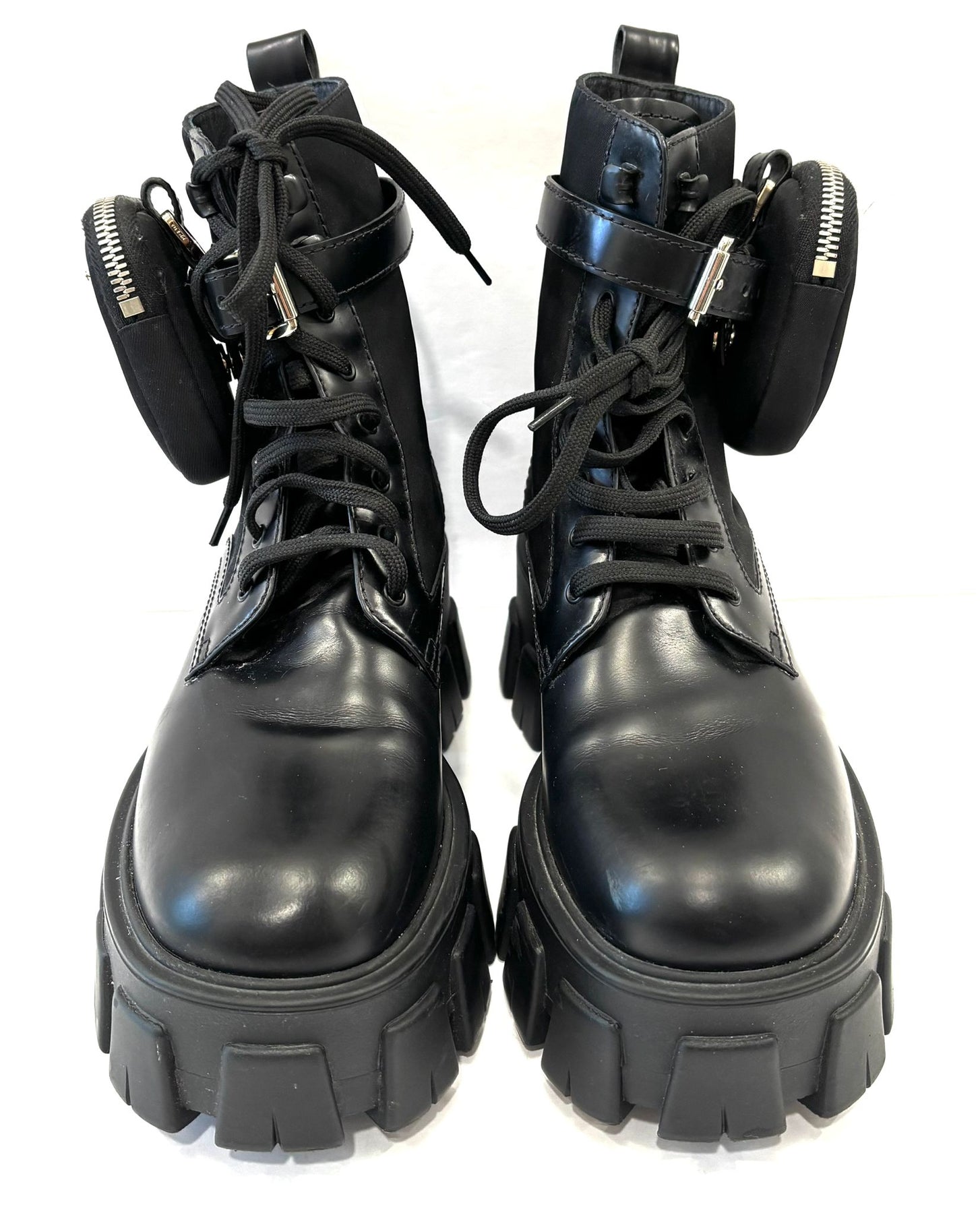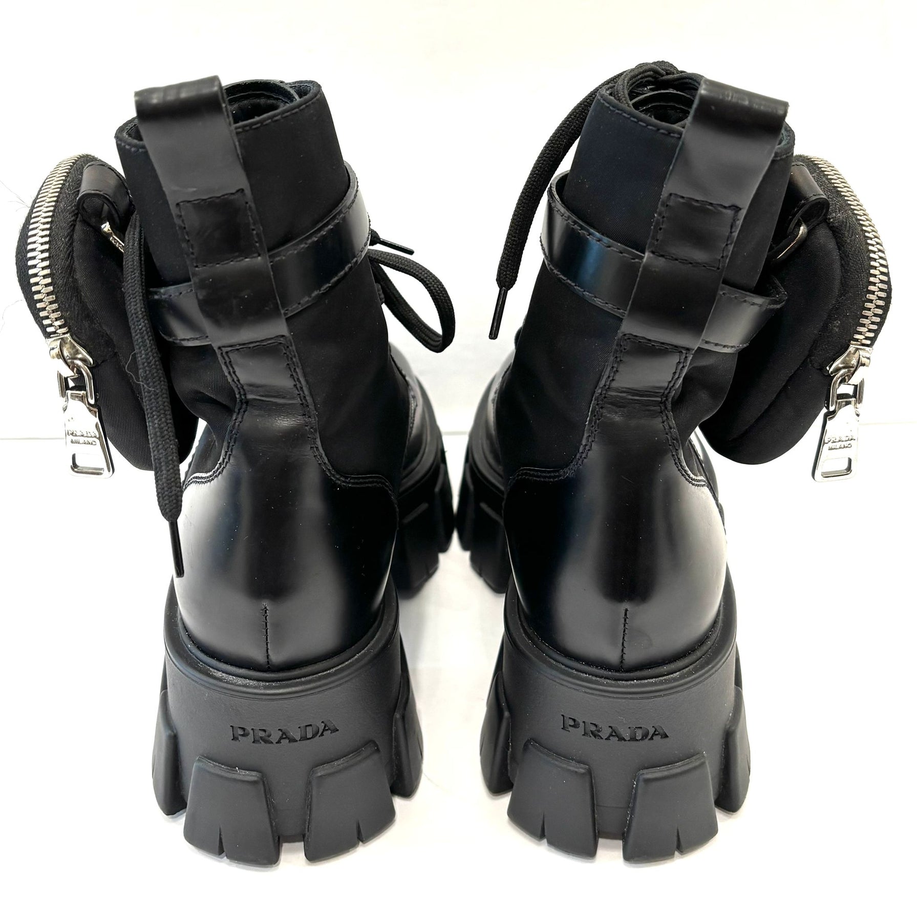 PRADA MONOLITH LEATHER COMBAT BOOTS WITH POUCH