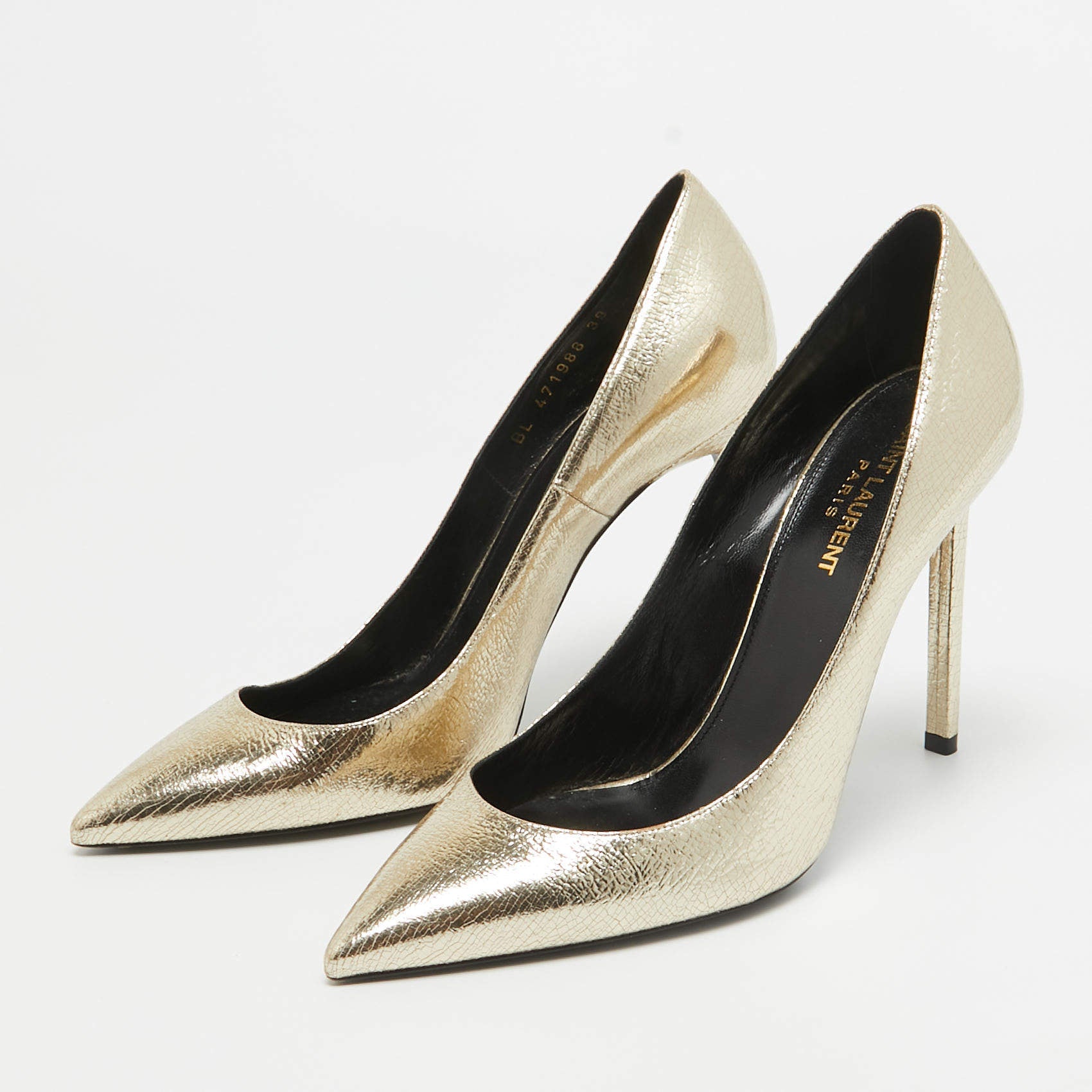Make a striking statement with these elegant Saint Laurent Anja pumps, crafted in luxurious metallic Supercrack calfskin leather. Finished in a radiant gold tone, these heels feature a sleek, elongated pointed toe that enhances their refined and feminine silhouette.