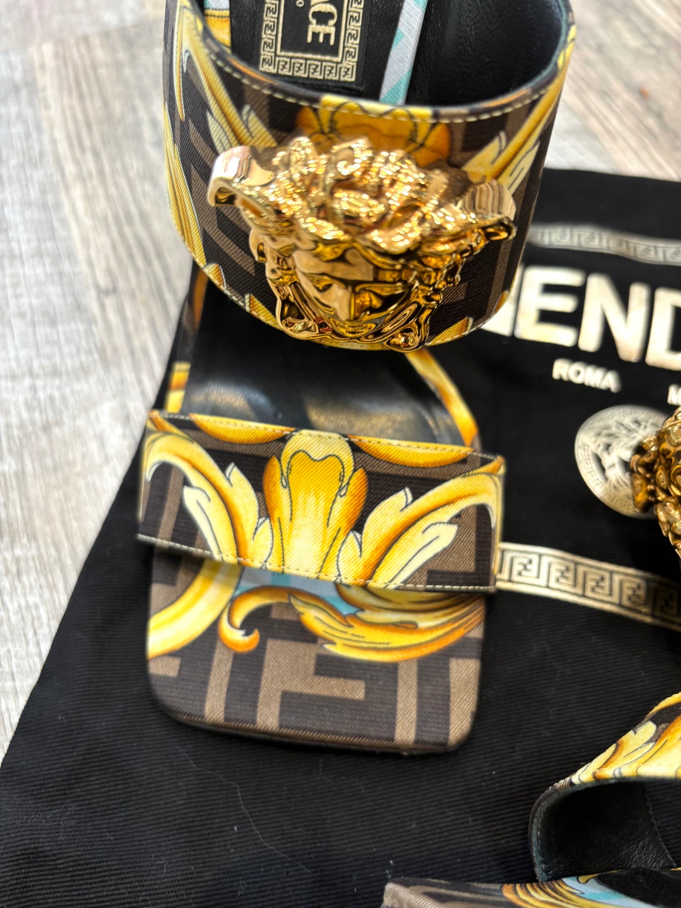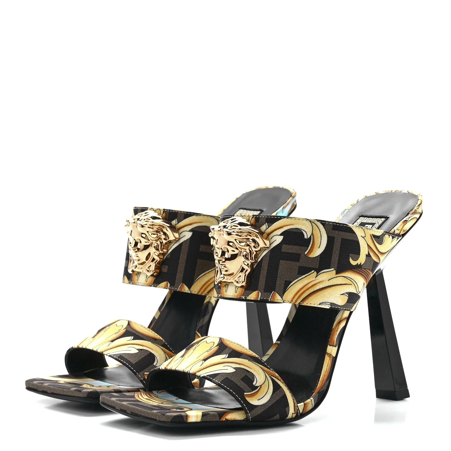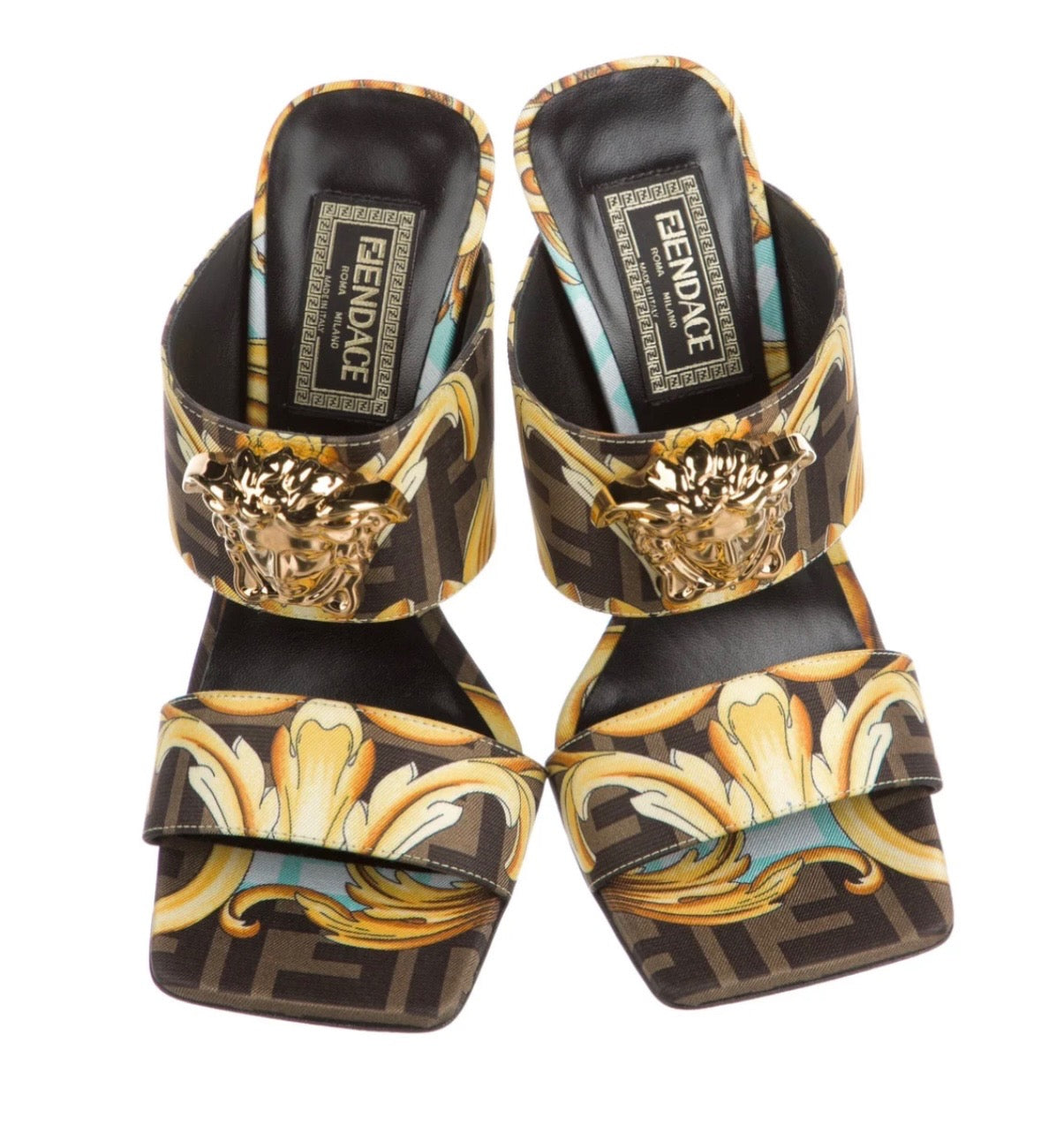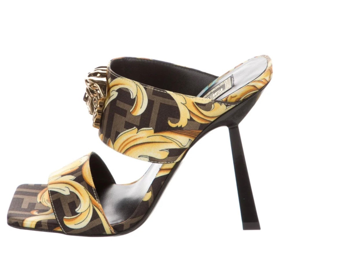FENDI X VERSACE SILK FENDACE BAROQUE LA MEDUSA MULES
